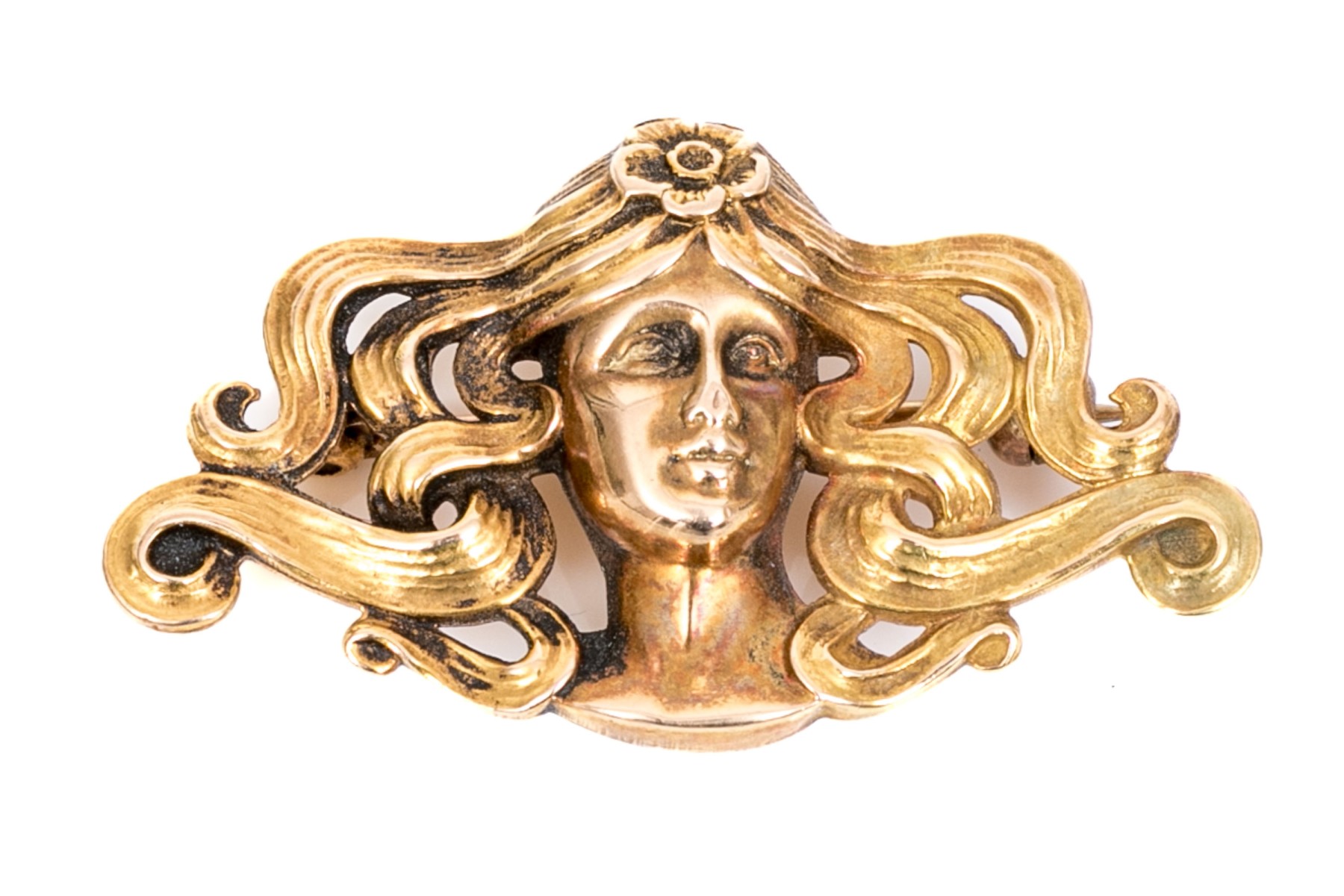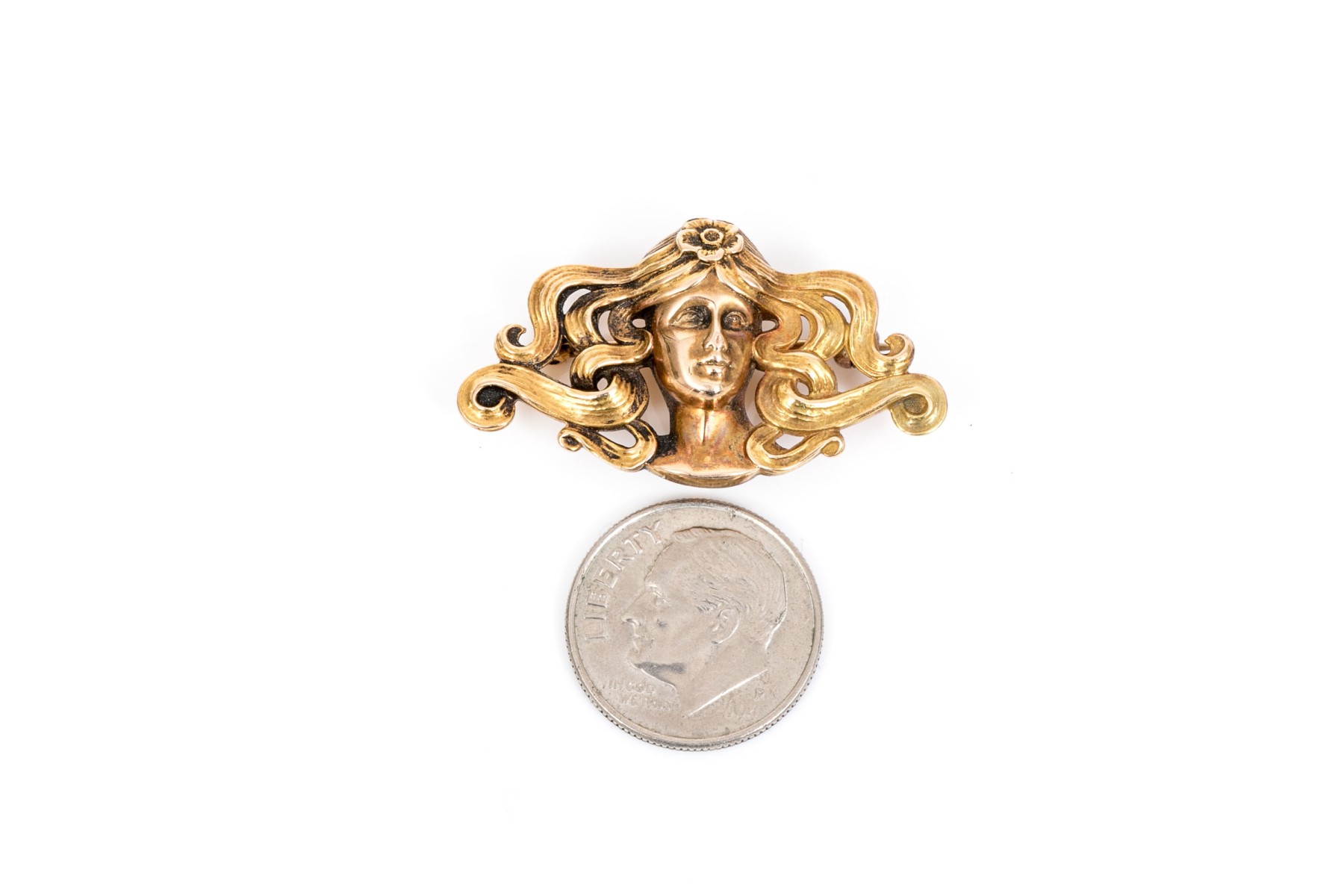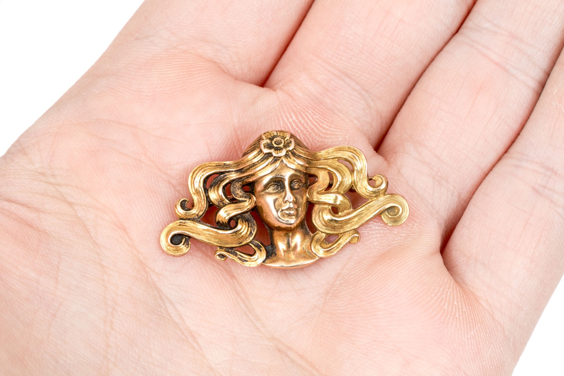14k yellow gold beautiful classic Art Nouveau figural brooch, with watch hook