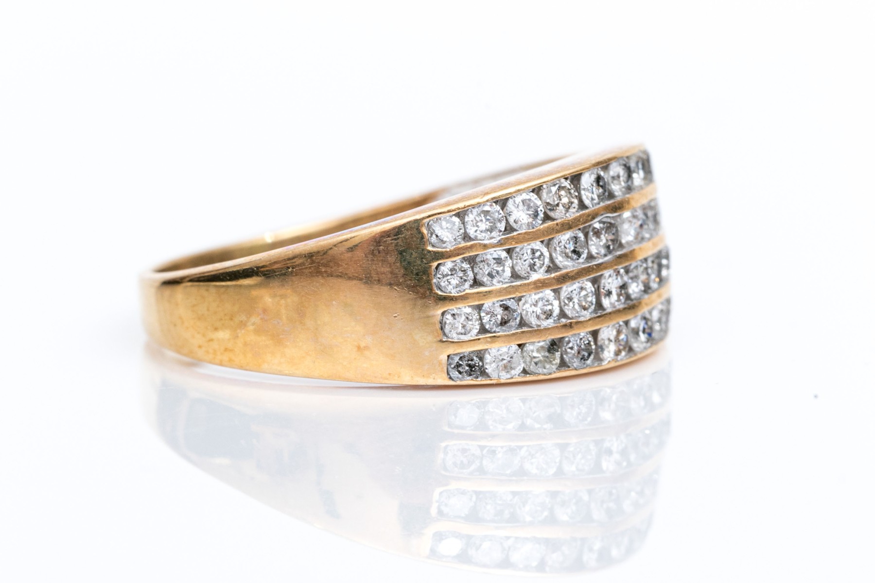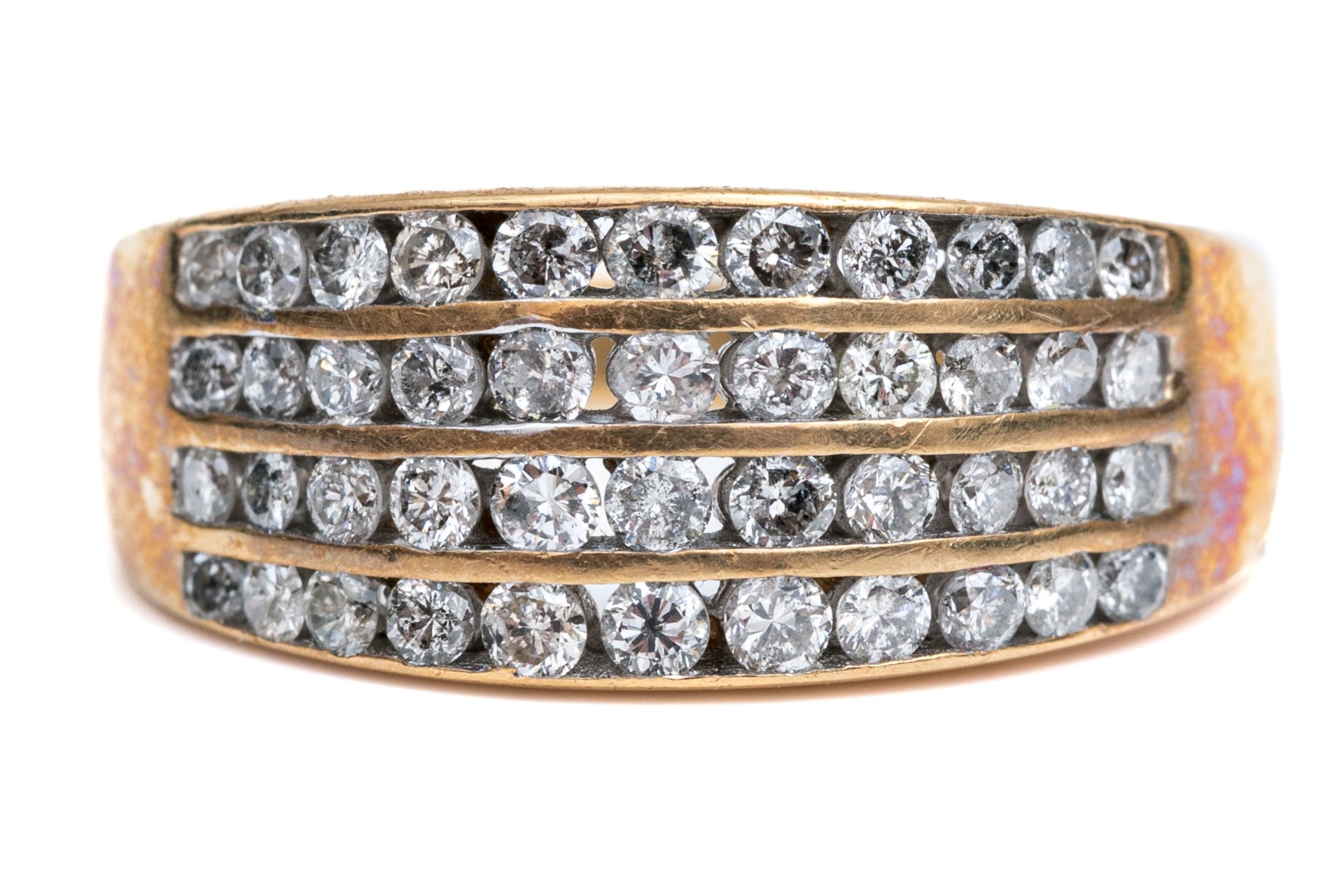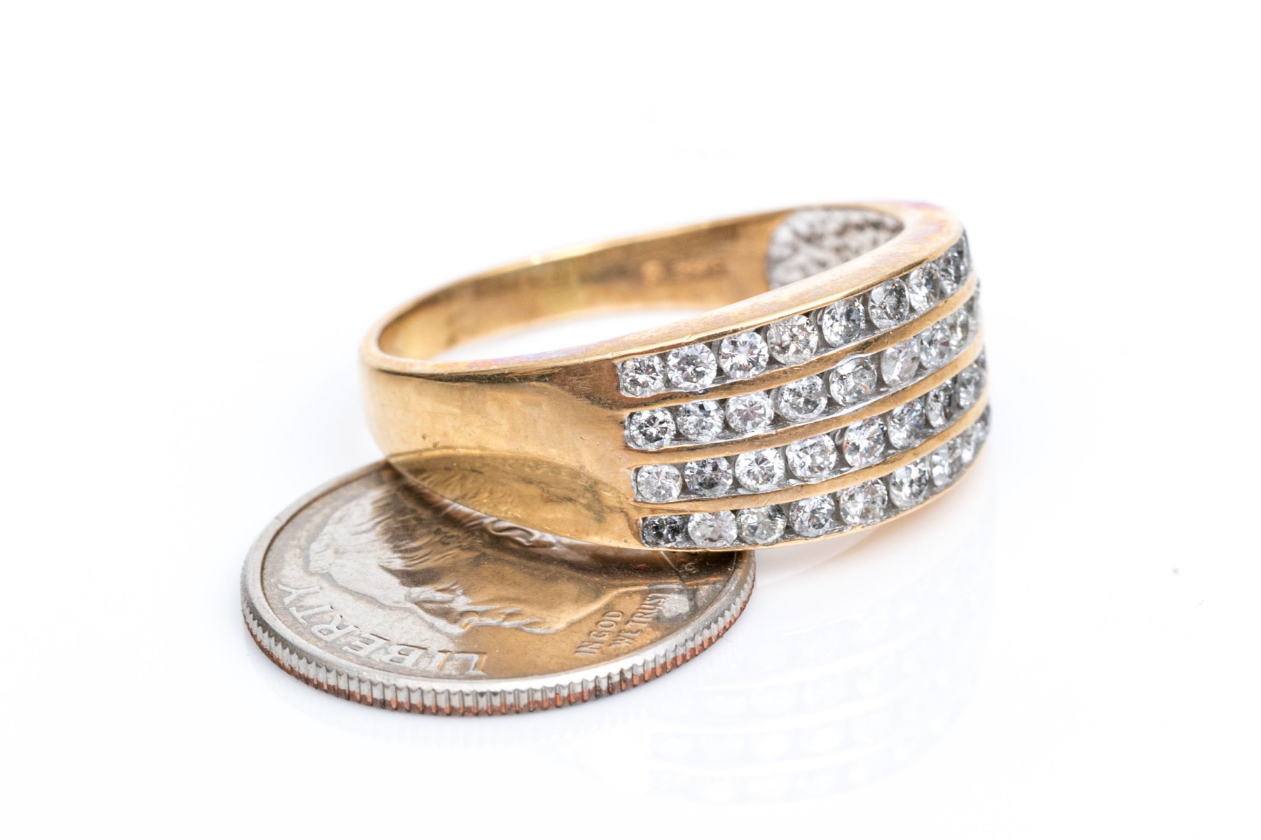 14k yellow gold beautiful four row channel set graduated diamond dome ring, app. 0.92 TCW, size 8.25
