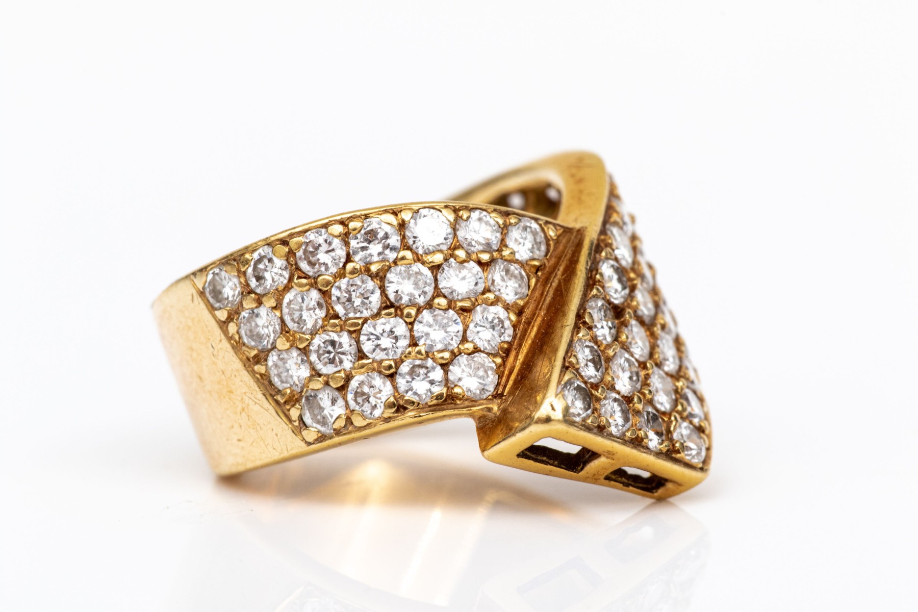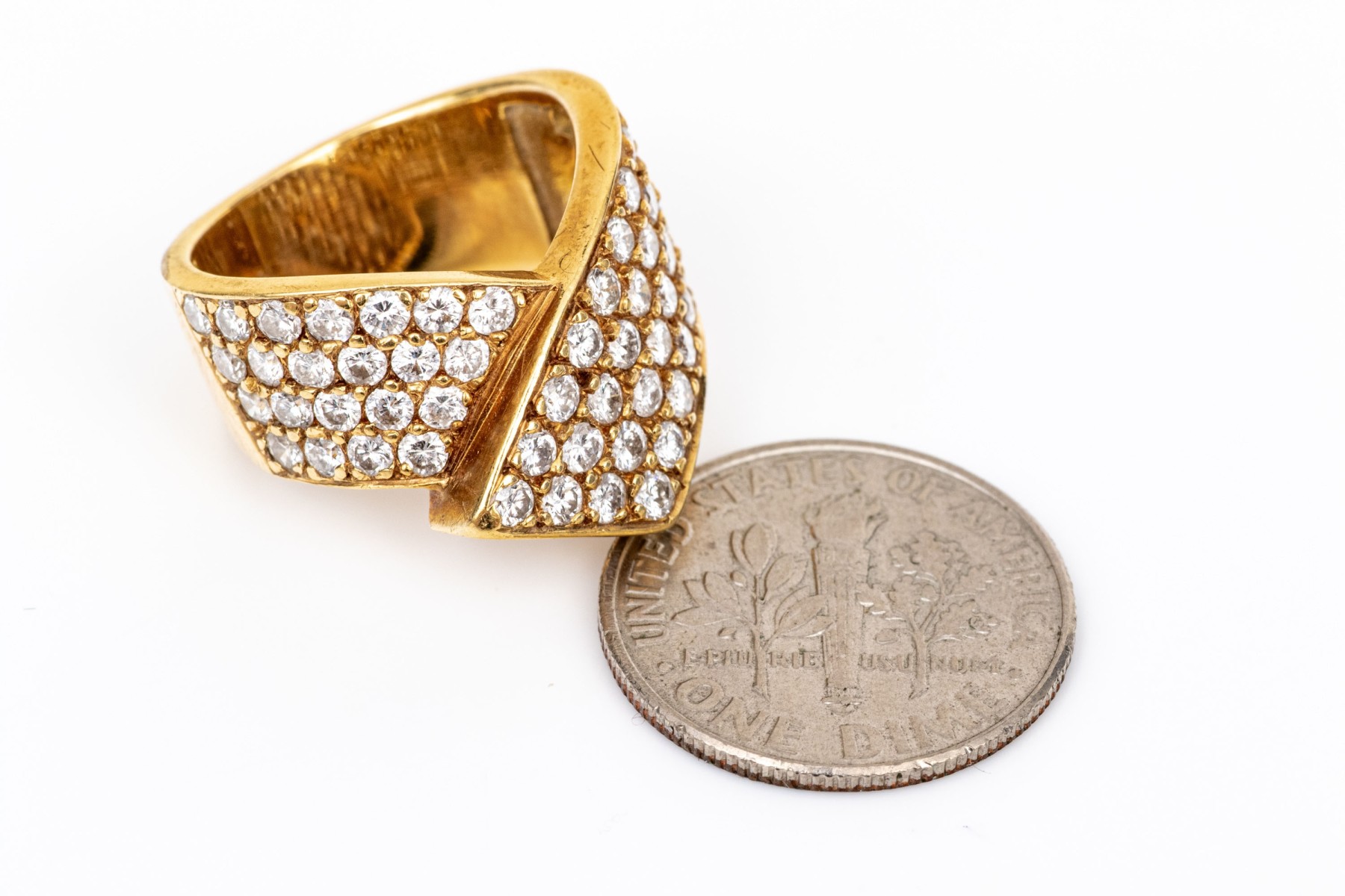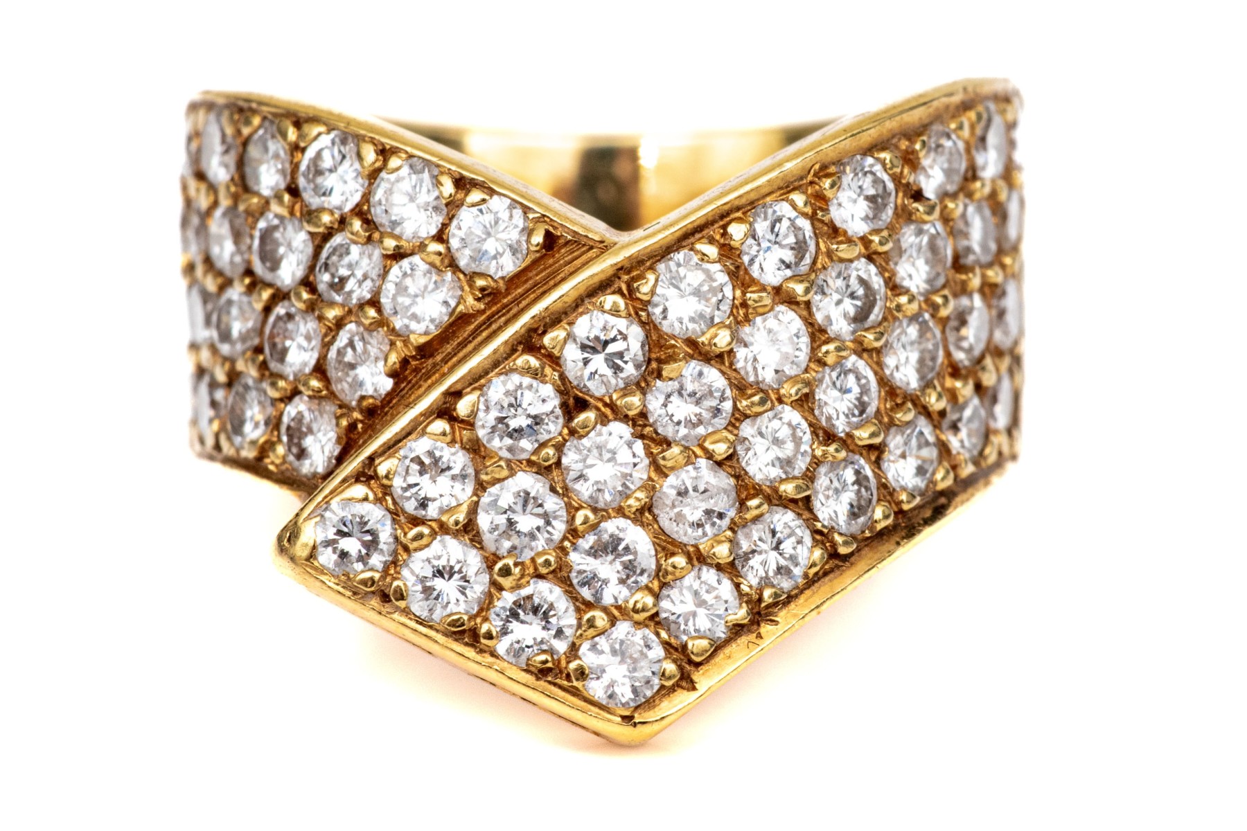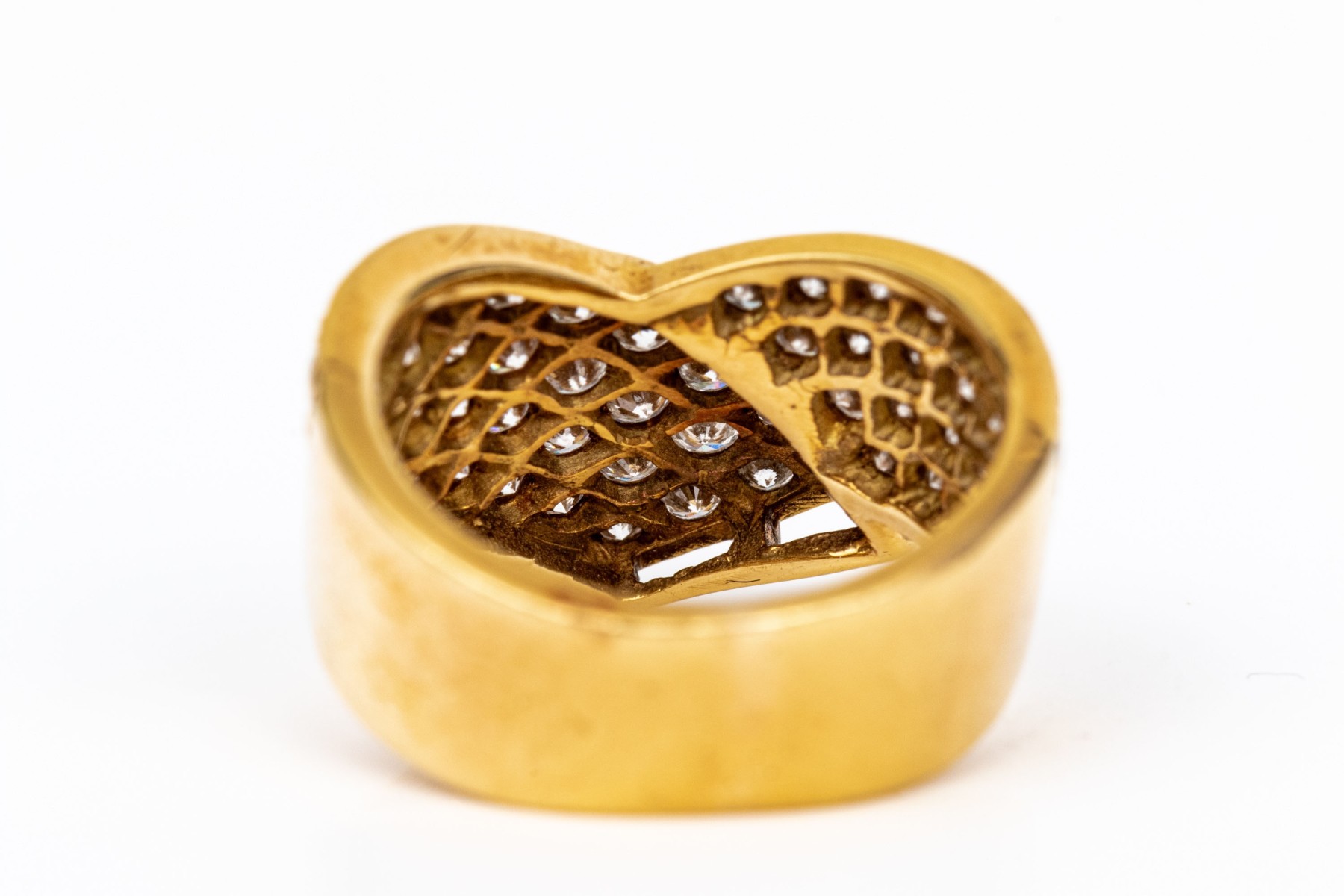 14k yellow gold beautiful pave diamond set crossover ring, app. 0.84 TCW, size 3.75