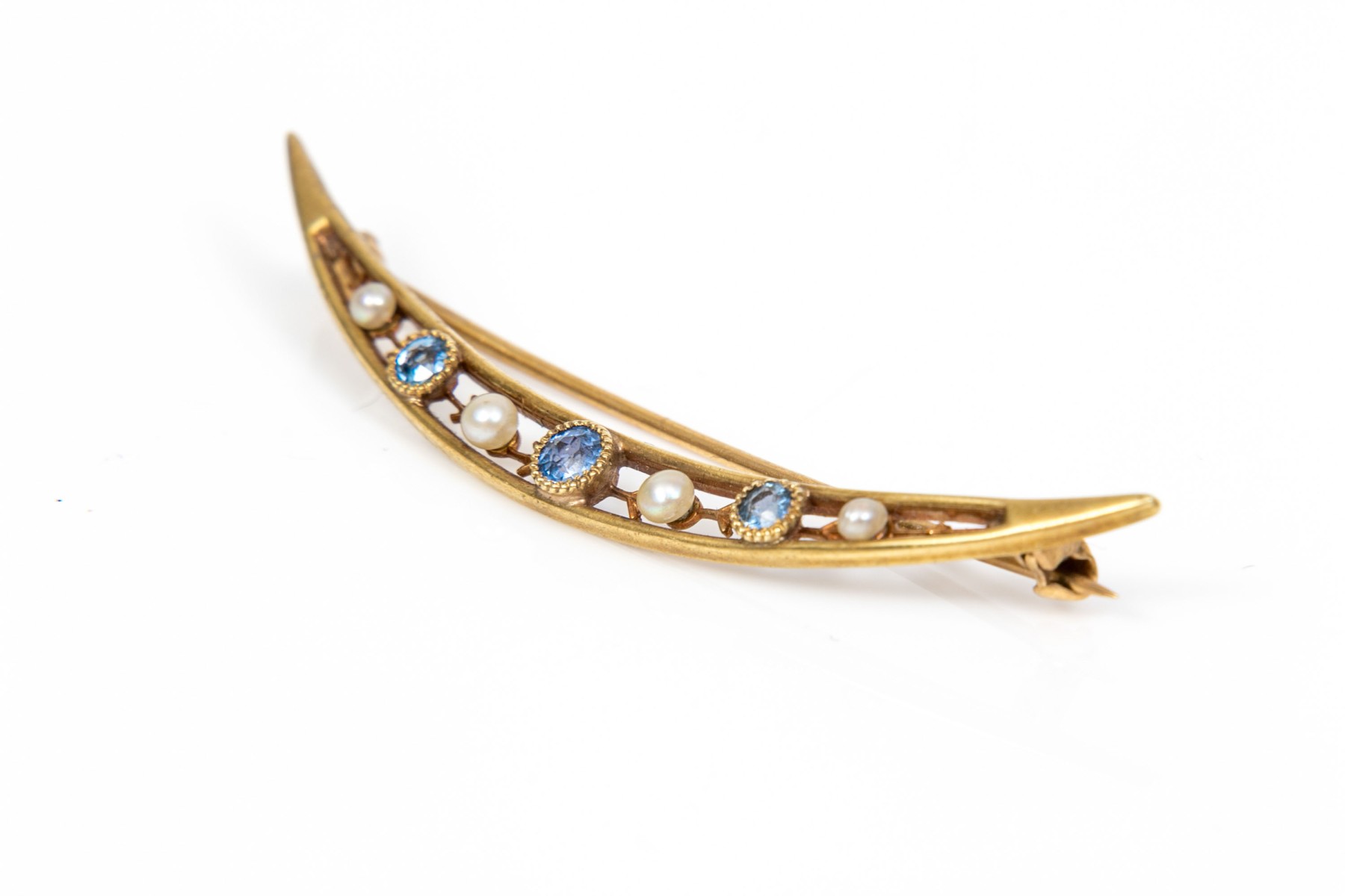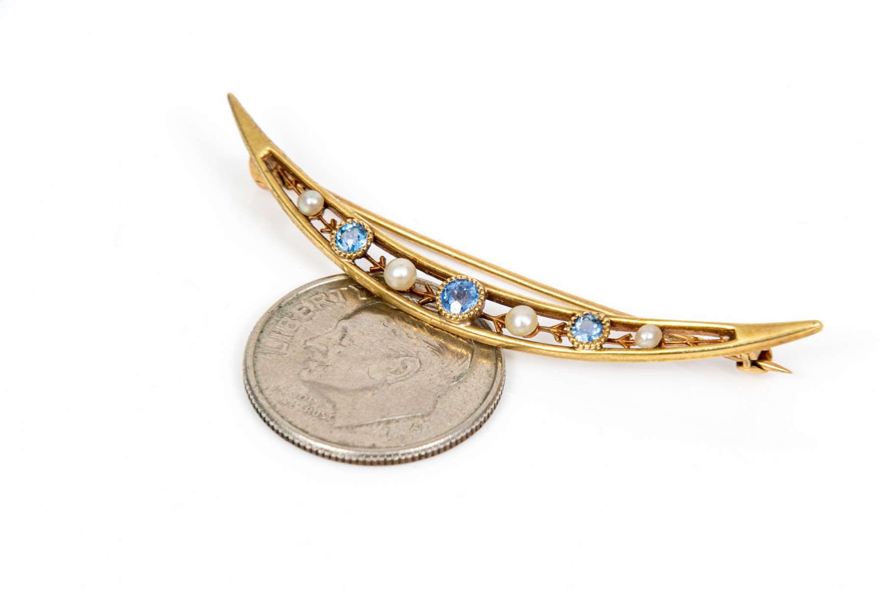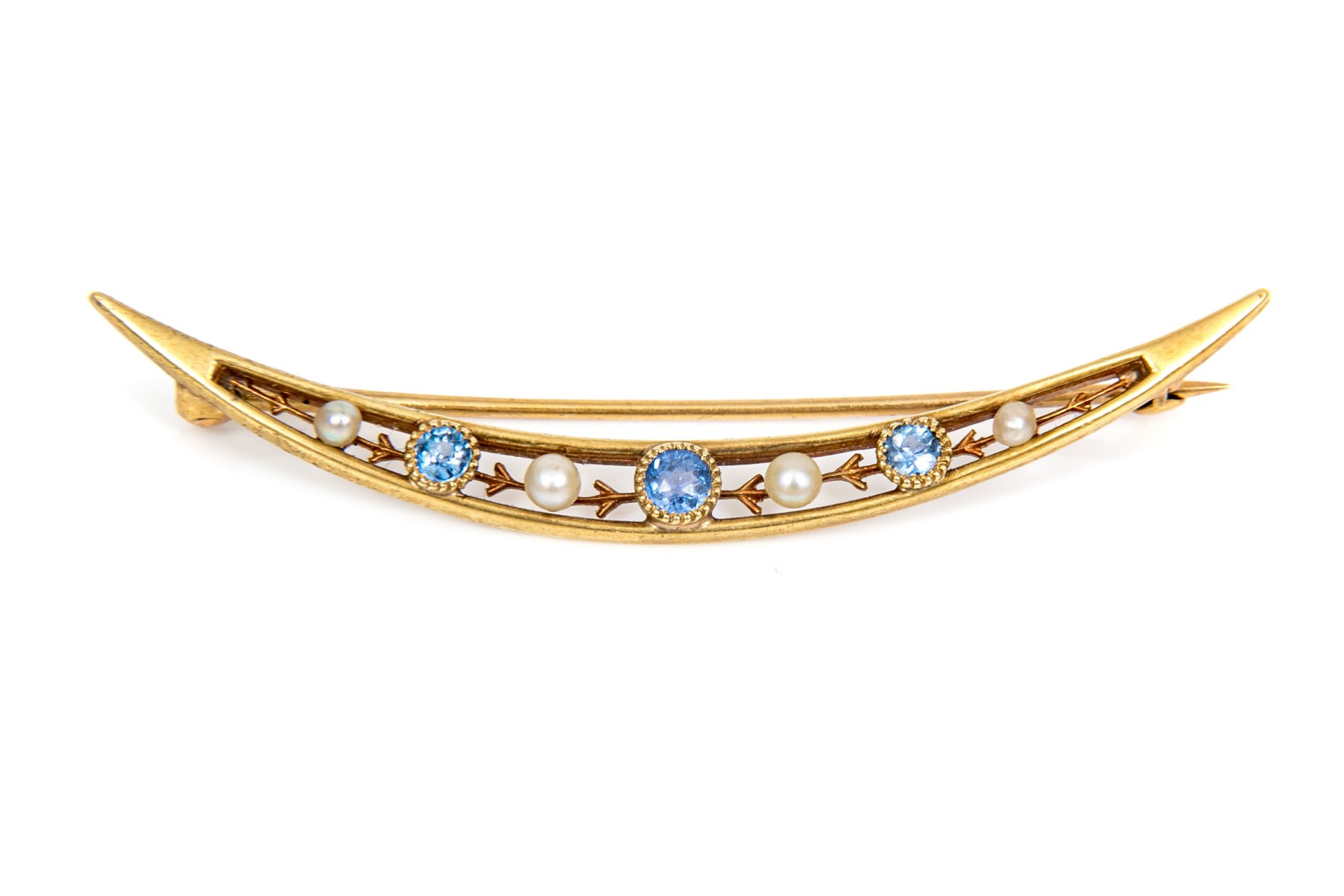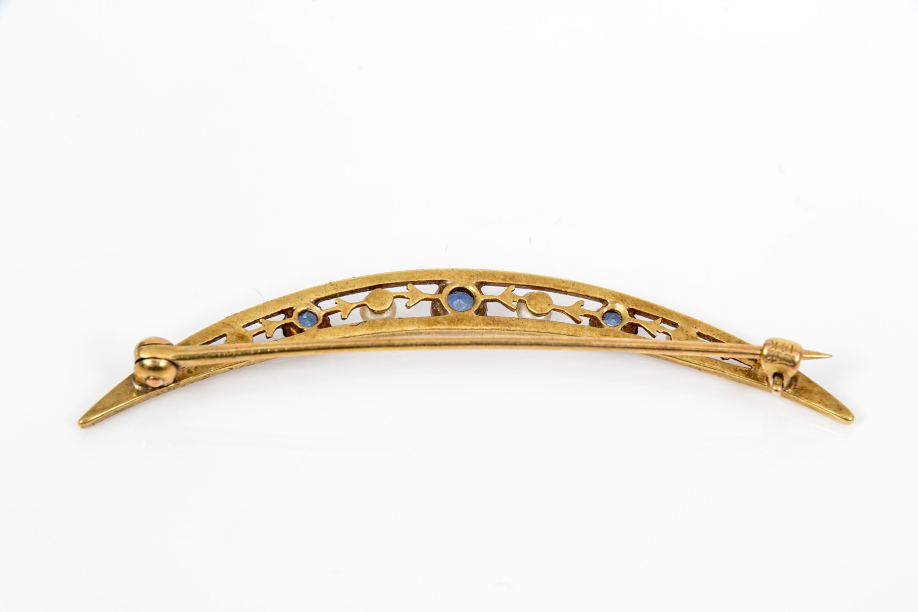 14k yellow gold beautiful vintage seed pearl and sapphire half moon brooch
