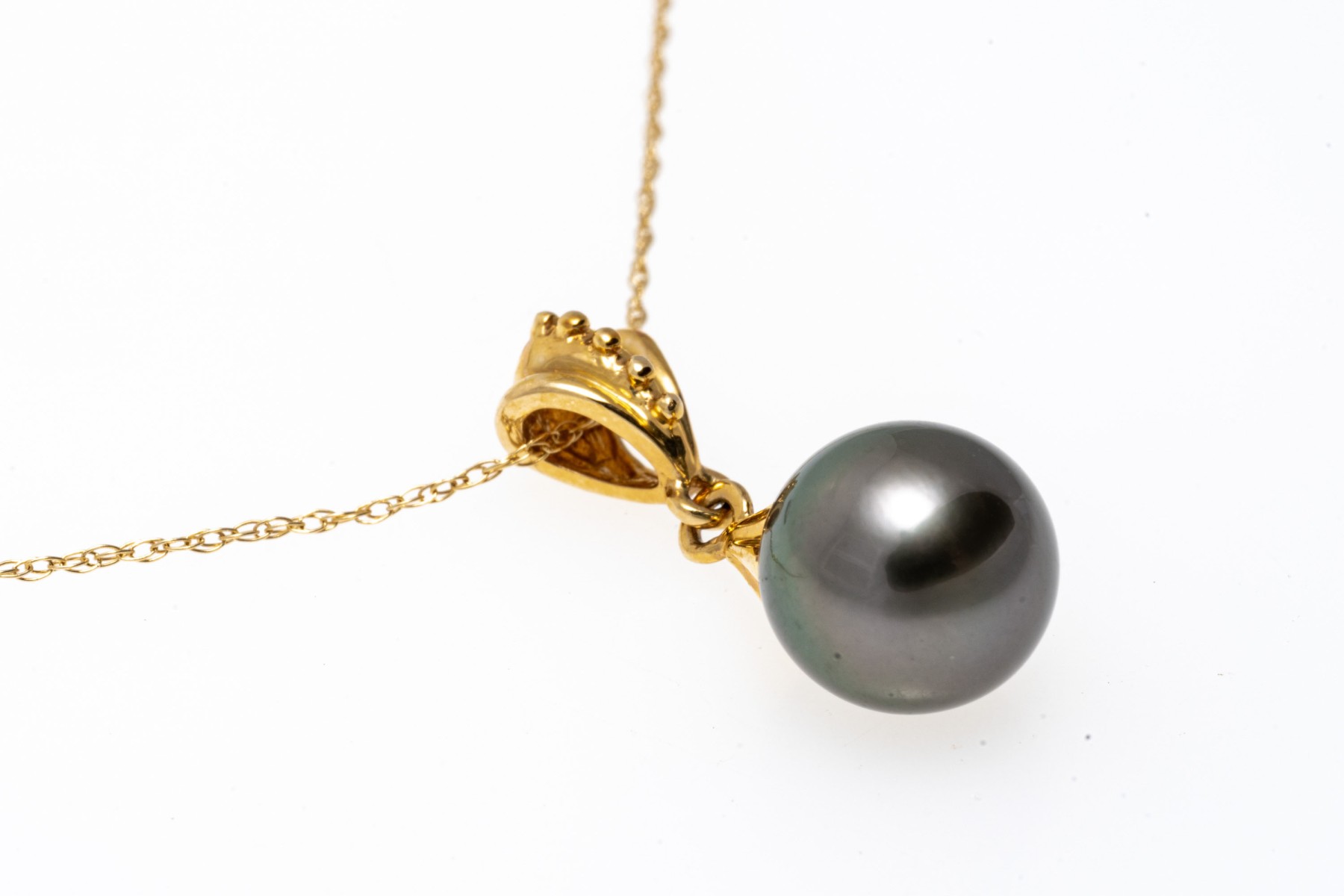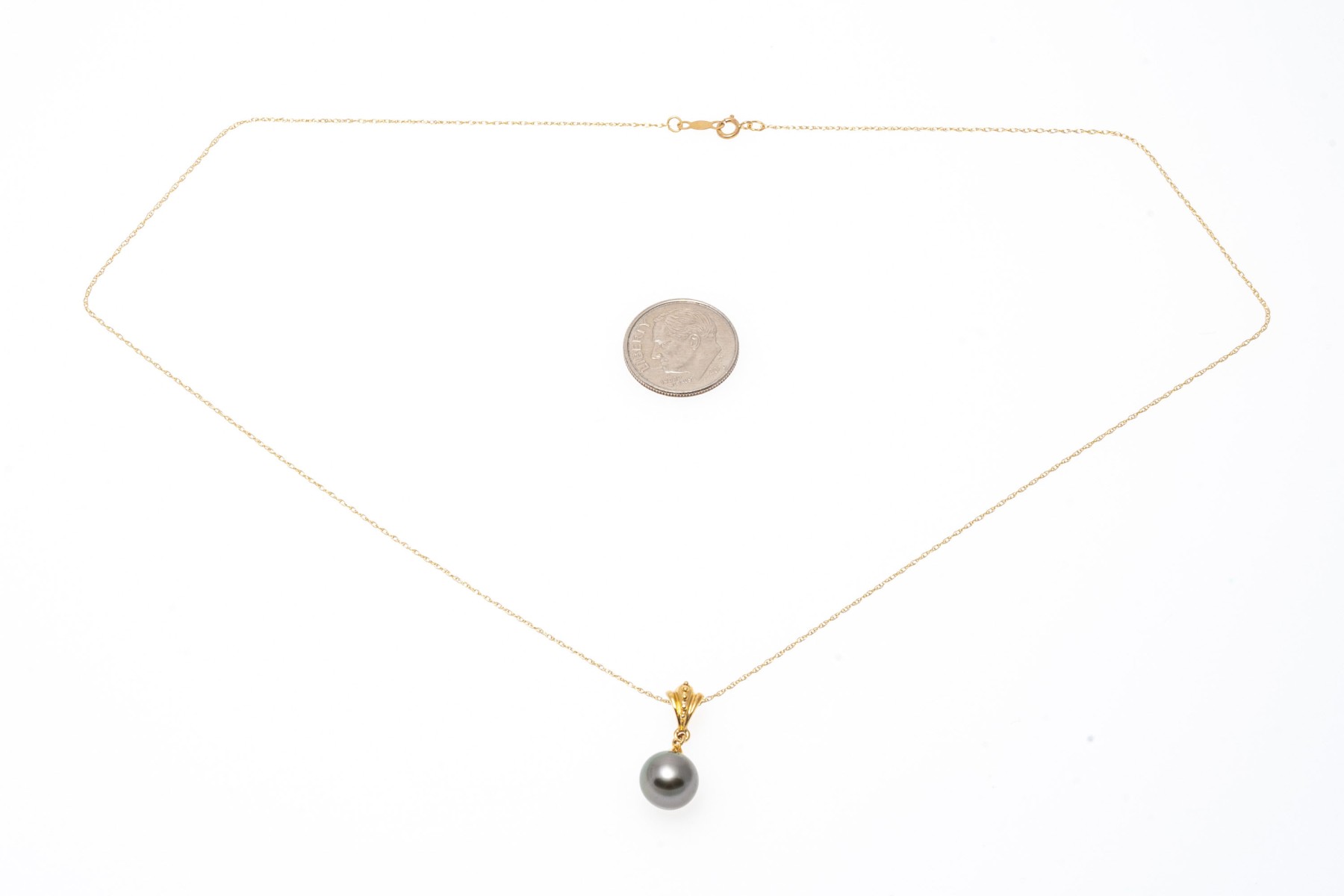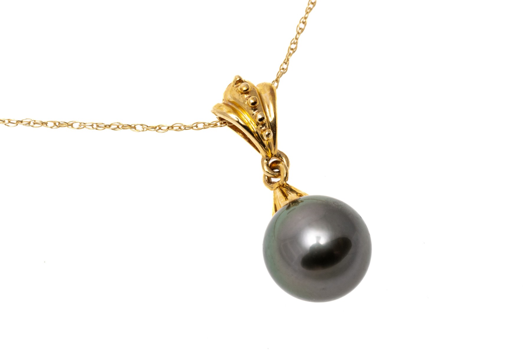 A pretty yellow gold necklace displaying a gray-black cultured pearl with a decorative bale hanging from a fine double-link cable chain.