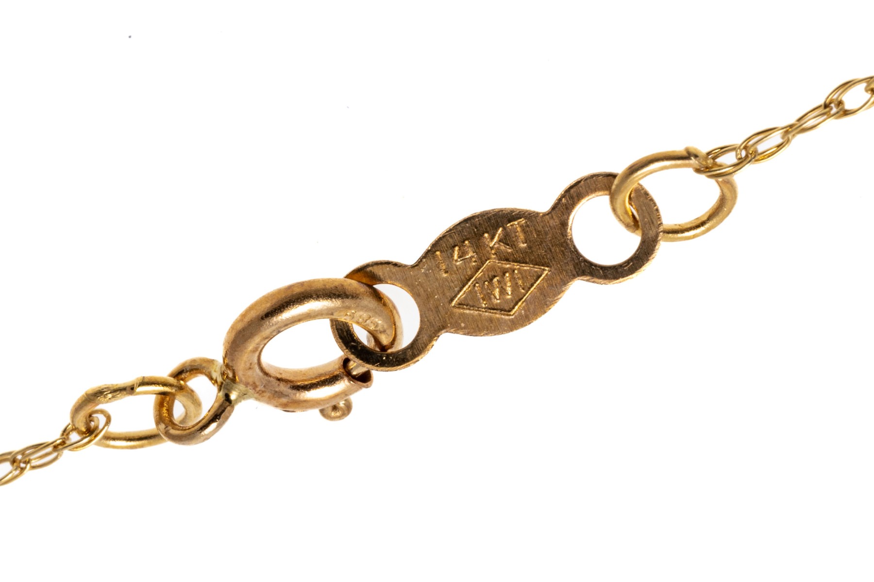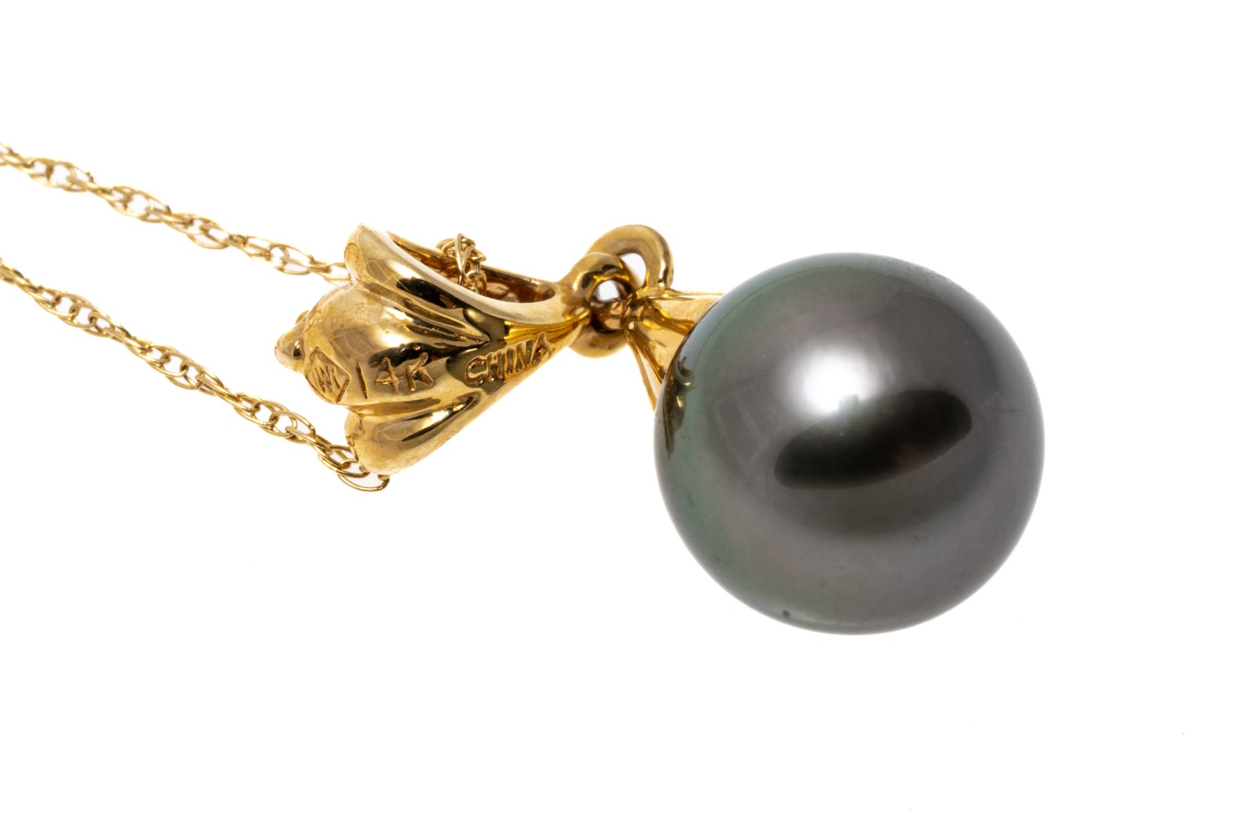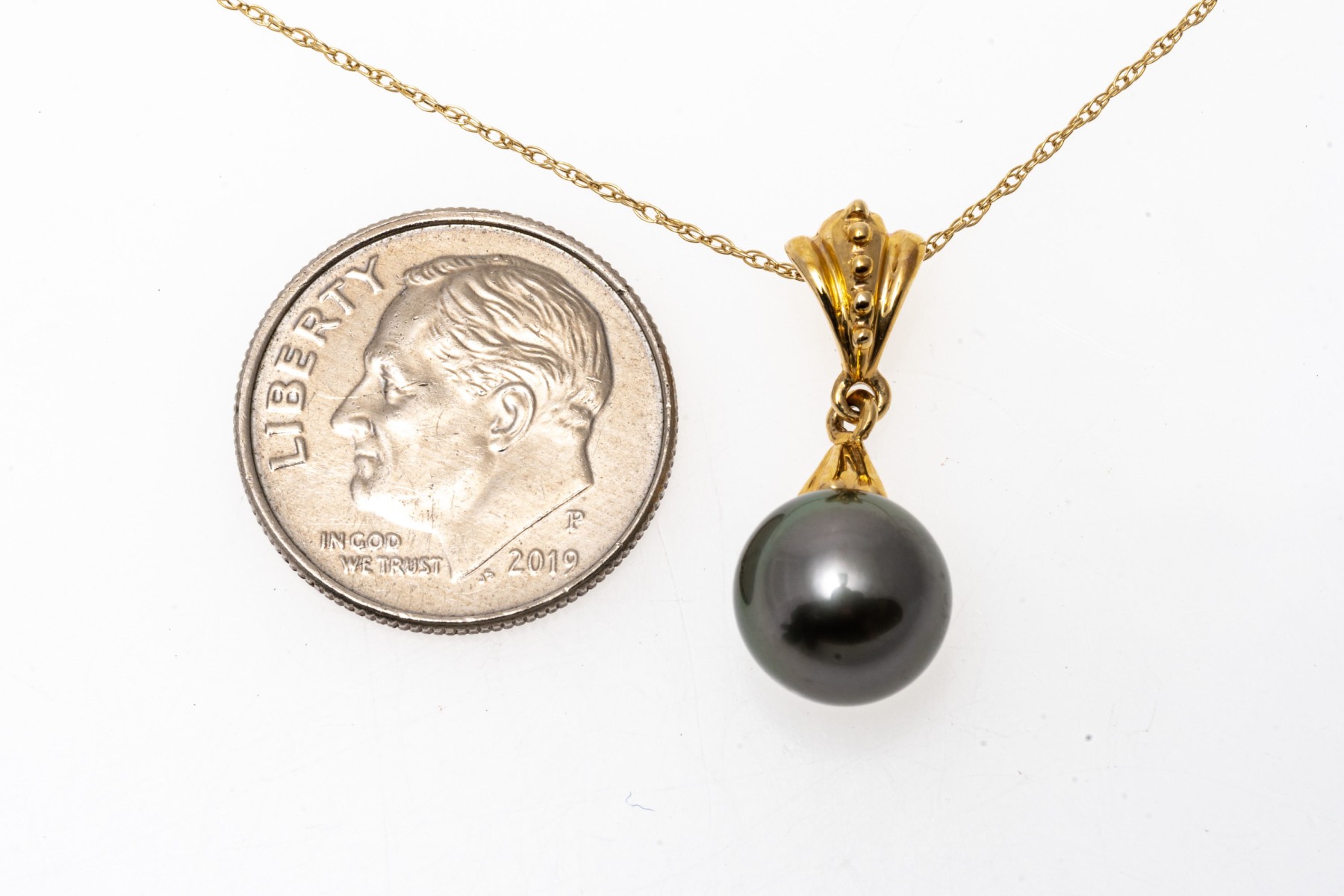 A pretty yellow gold necklace displaying a gray-black cultured pearl with a decorative bale hanging from a fine double-link cable chain.