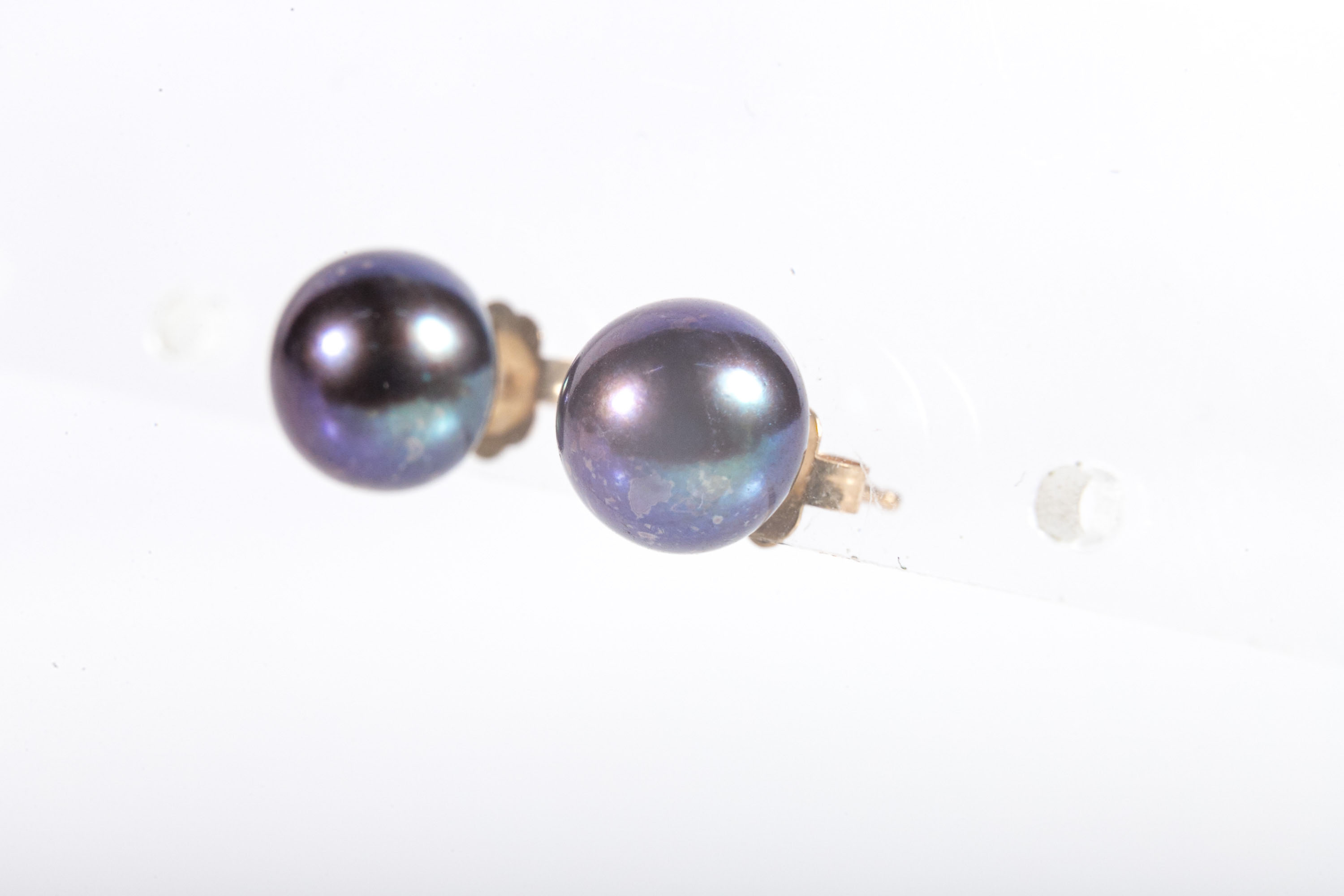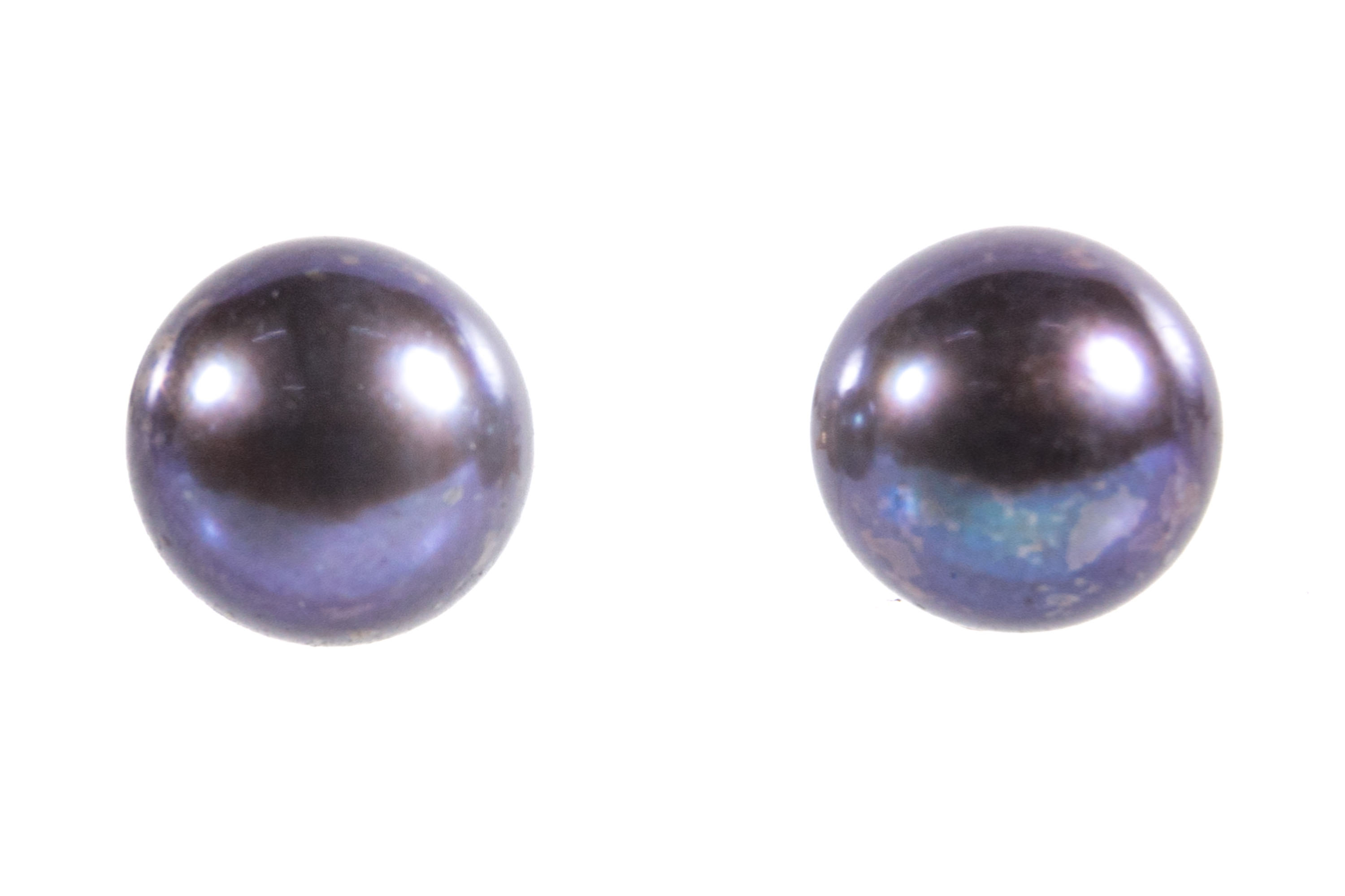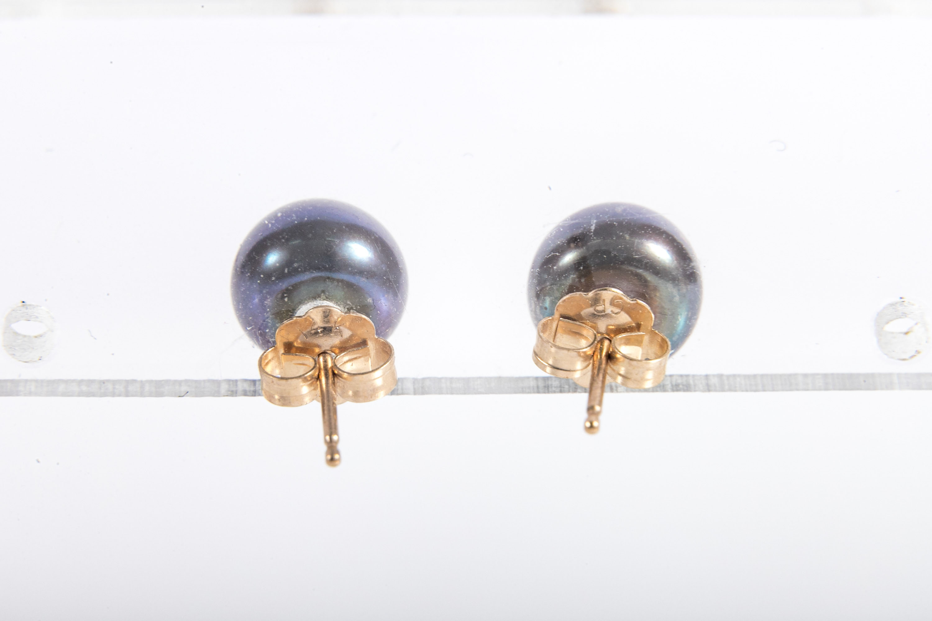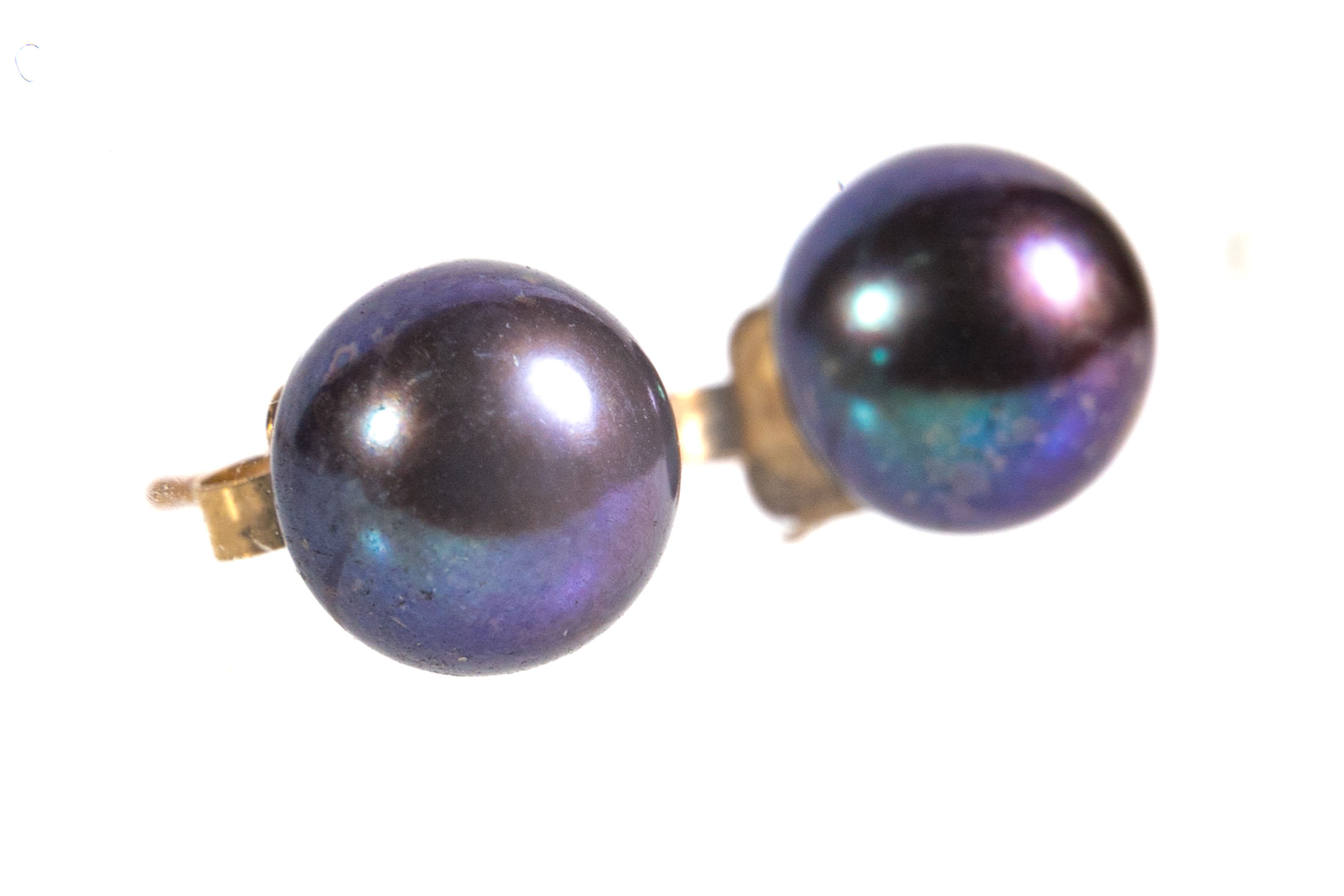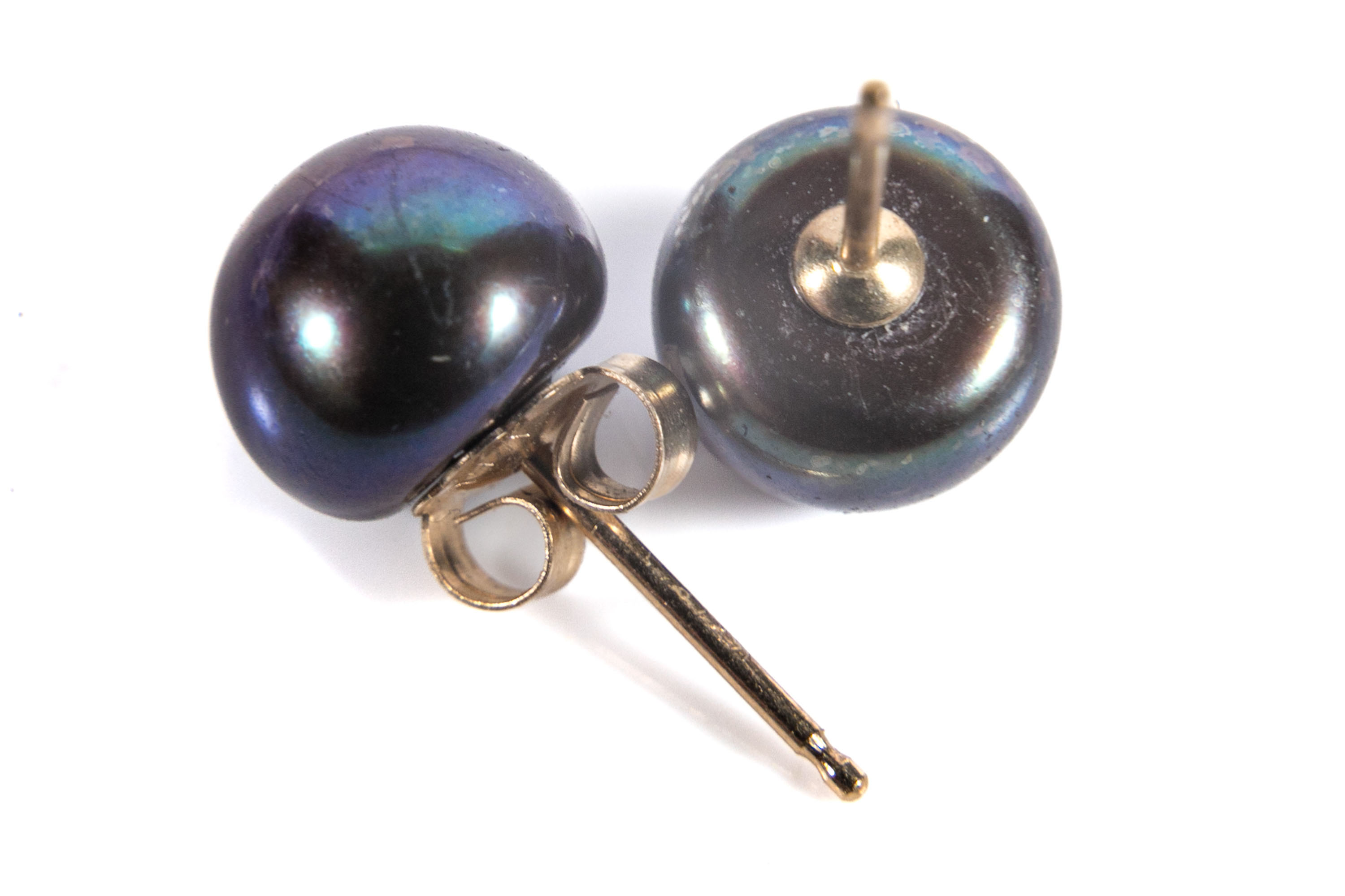 A pair of lovely yellow gold studs displaying black cultured button pearls with beautiful iridescent undertones of purple, green, and mauve.