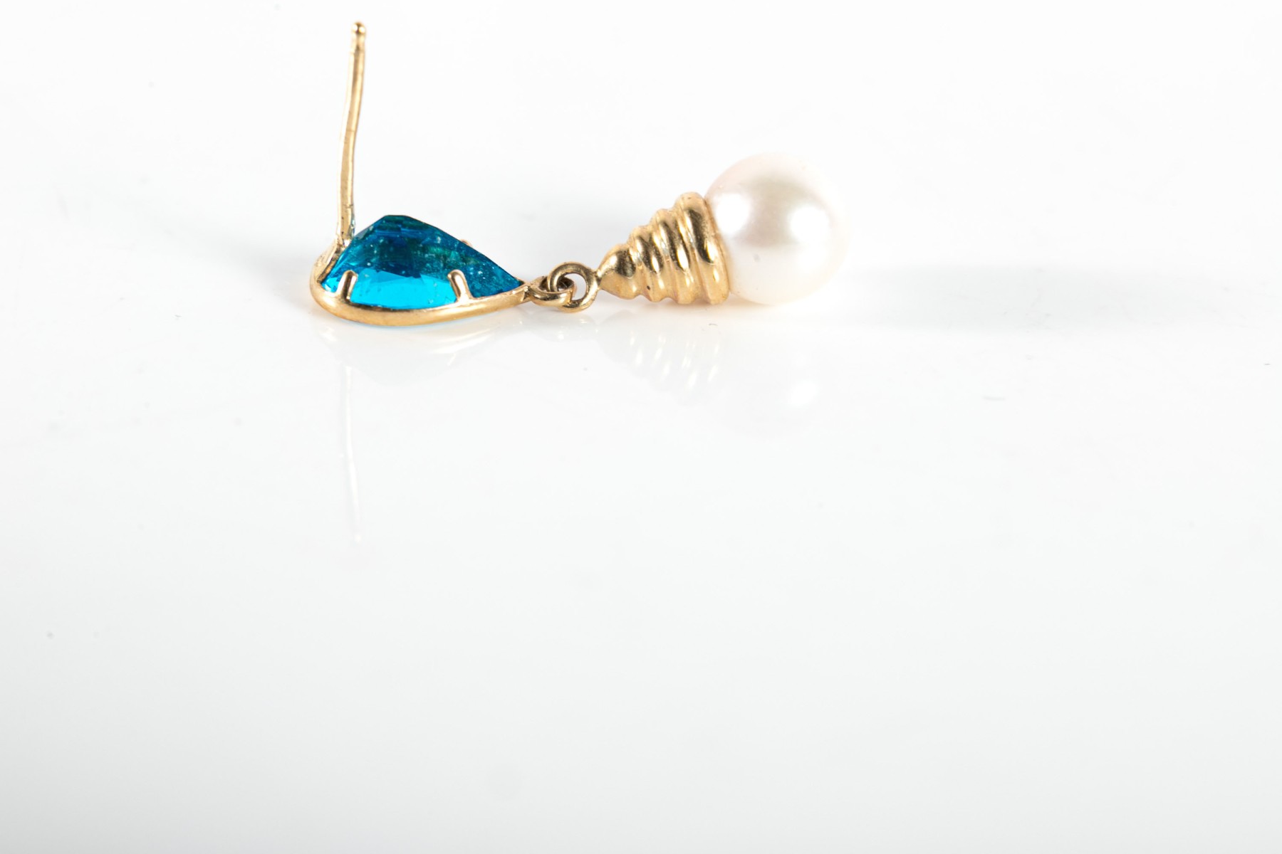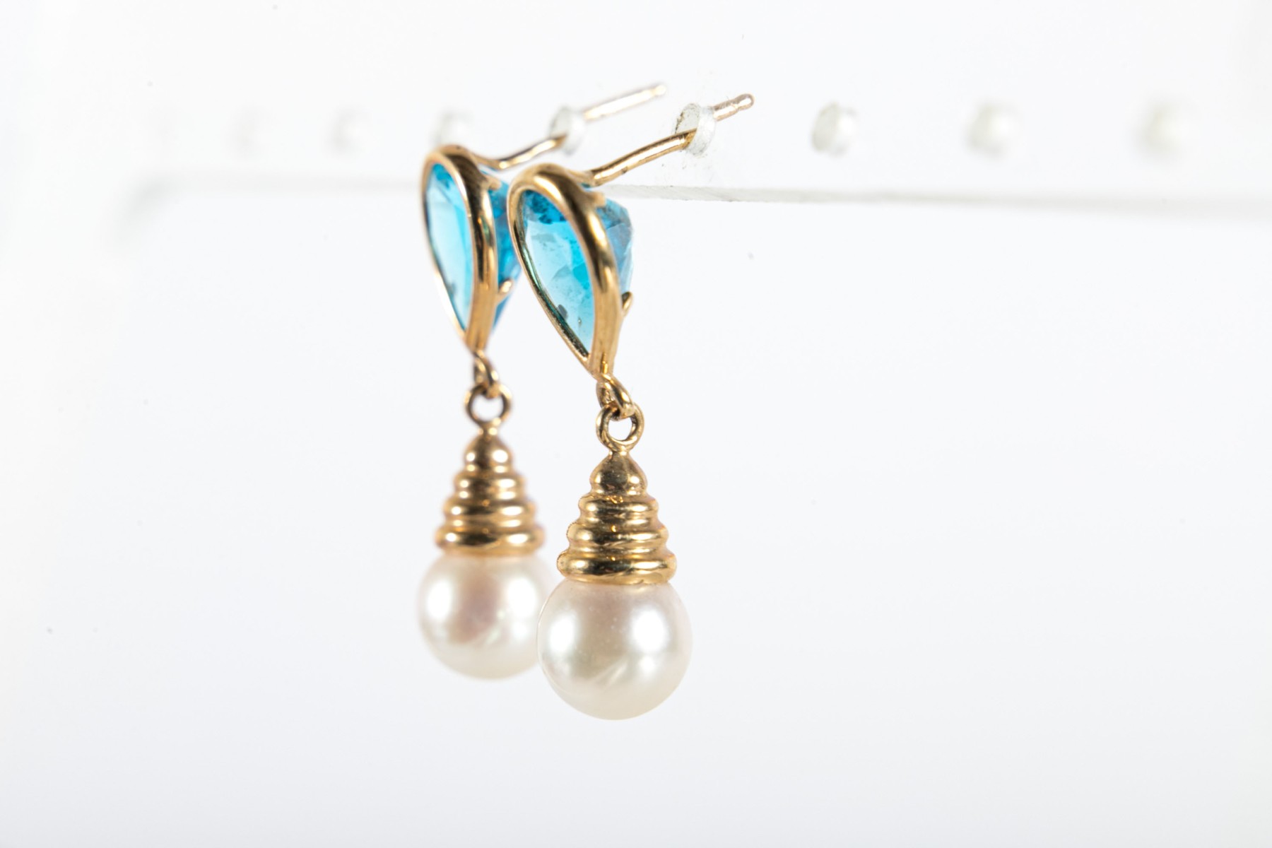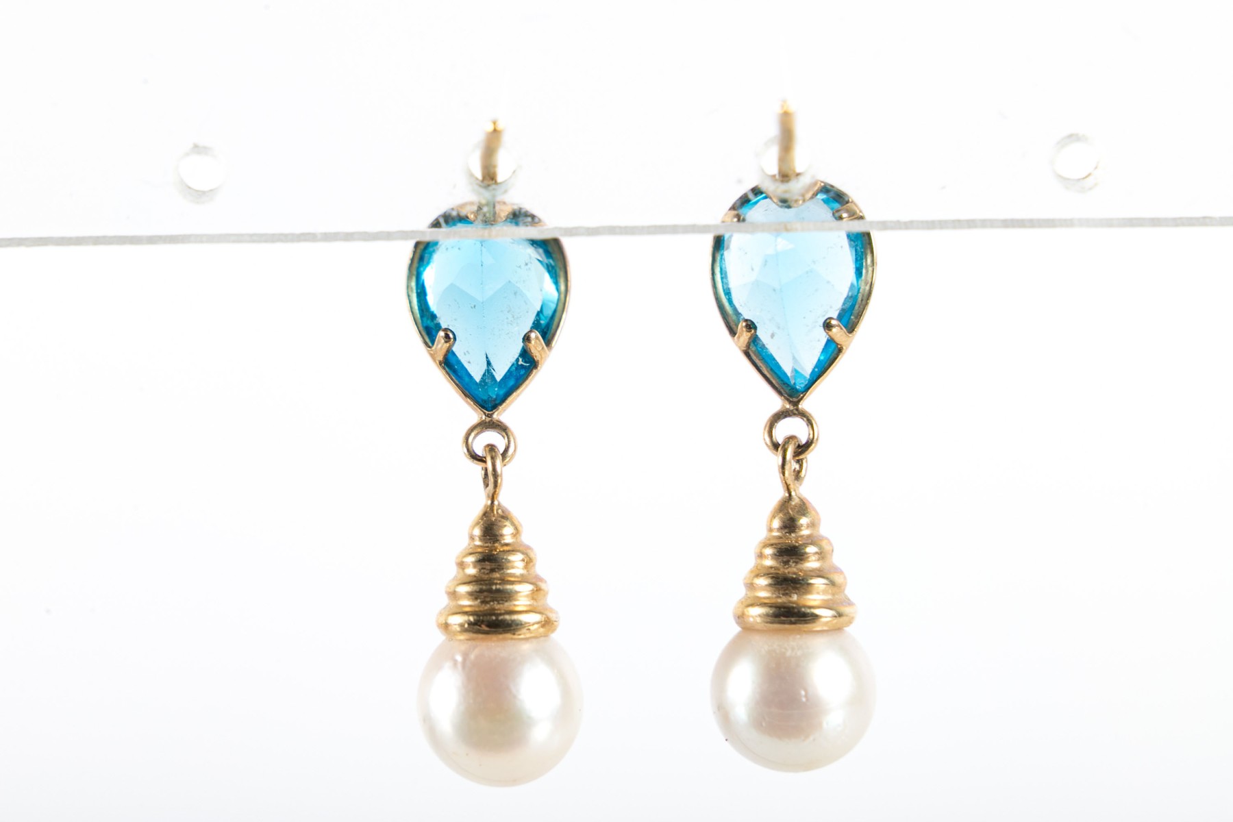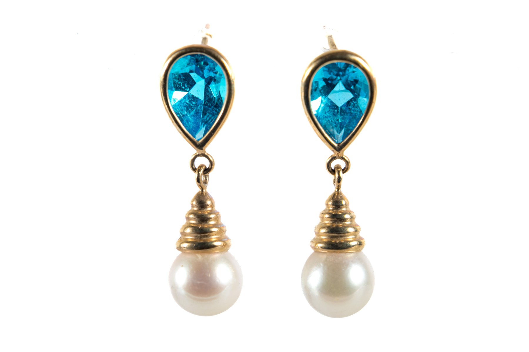 A pair of yellow gold earrings displaying bezel-set pear-shaped blue topazes leading to beehive-shaped caps over white cultured pearls.
