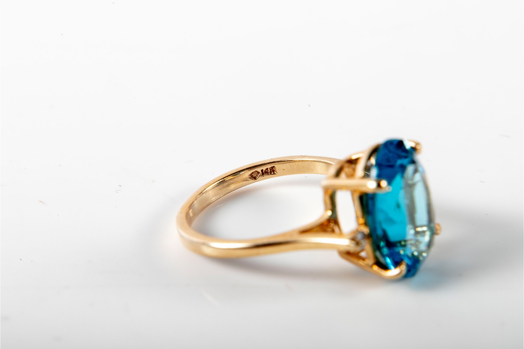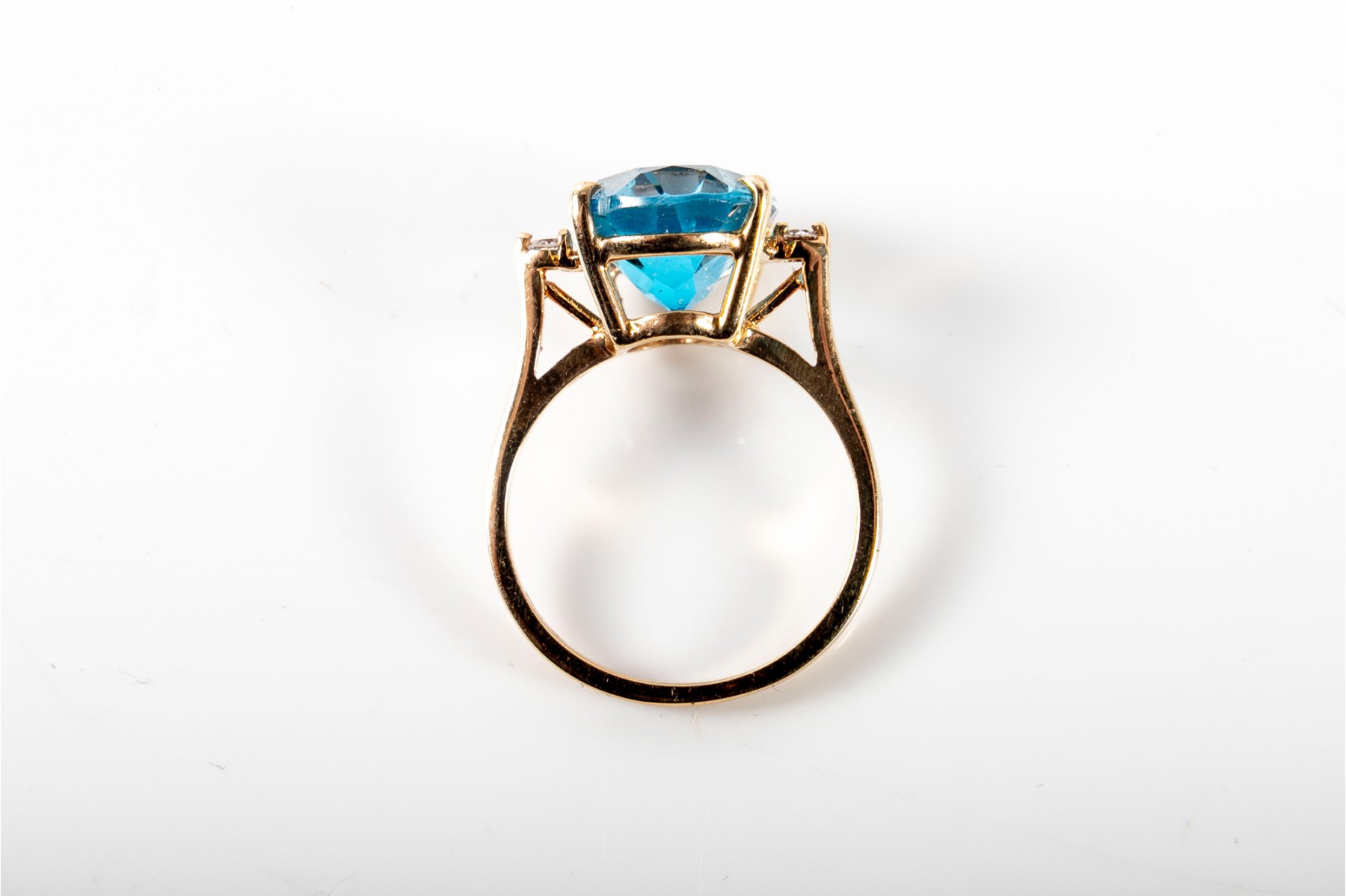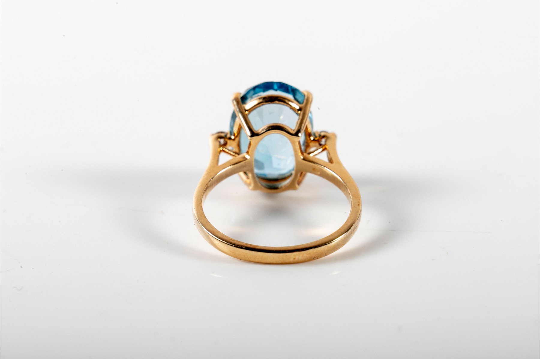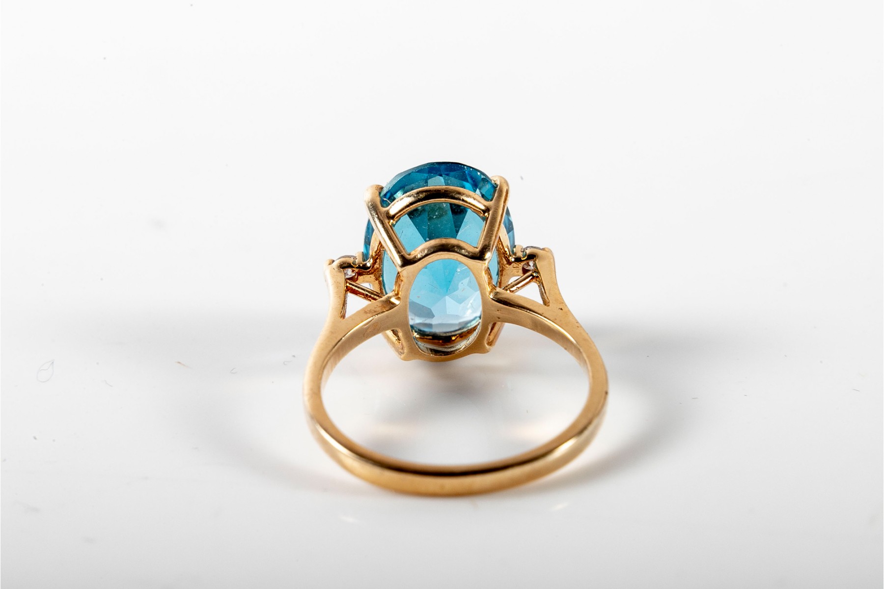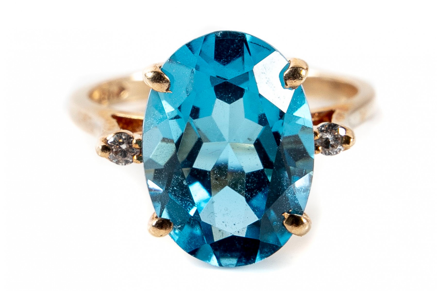 A beautiful yellow gold ring displaying an oval blue topaz flanked by round diamonds on high shoulders.
