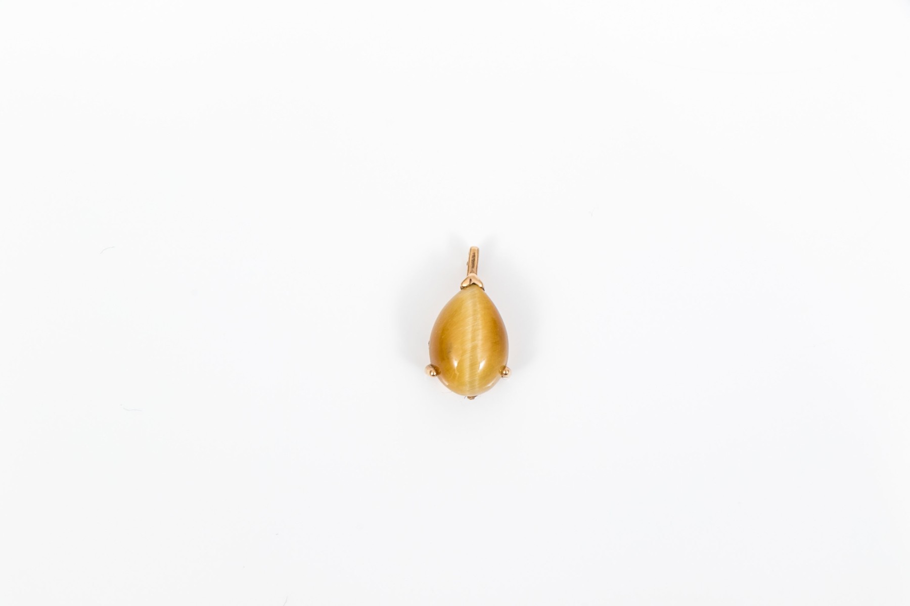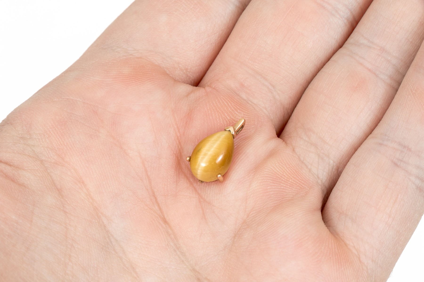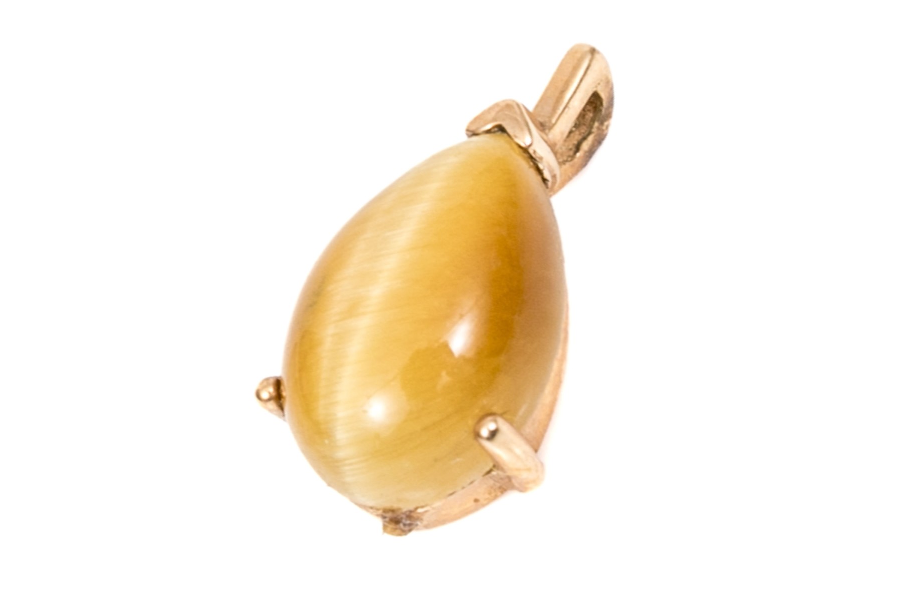14k yellow gold cabachon tan to brown cats eye pendant, prong set, finished with a solid style bale