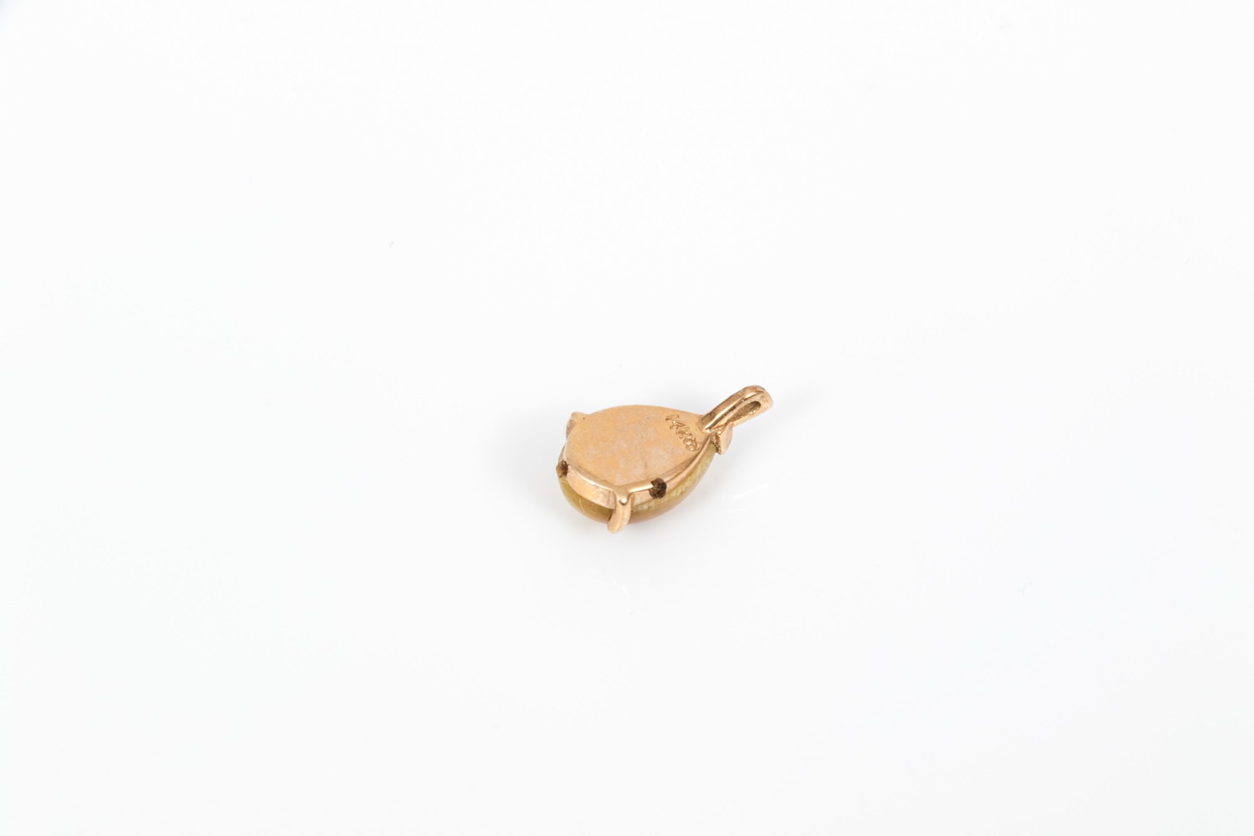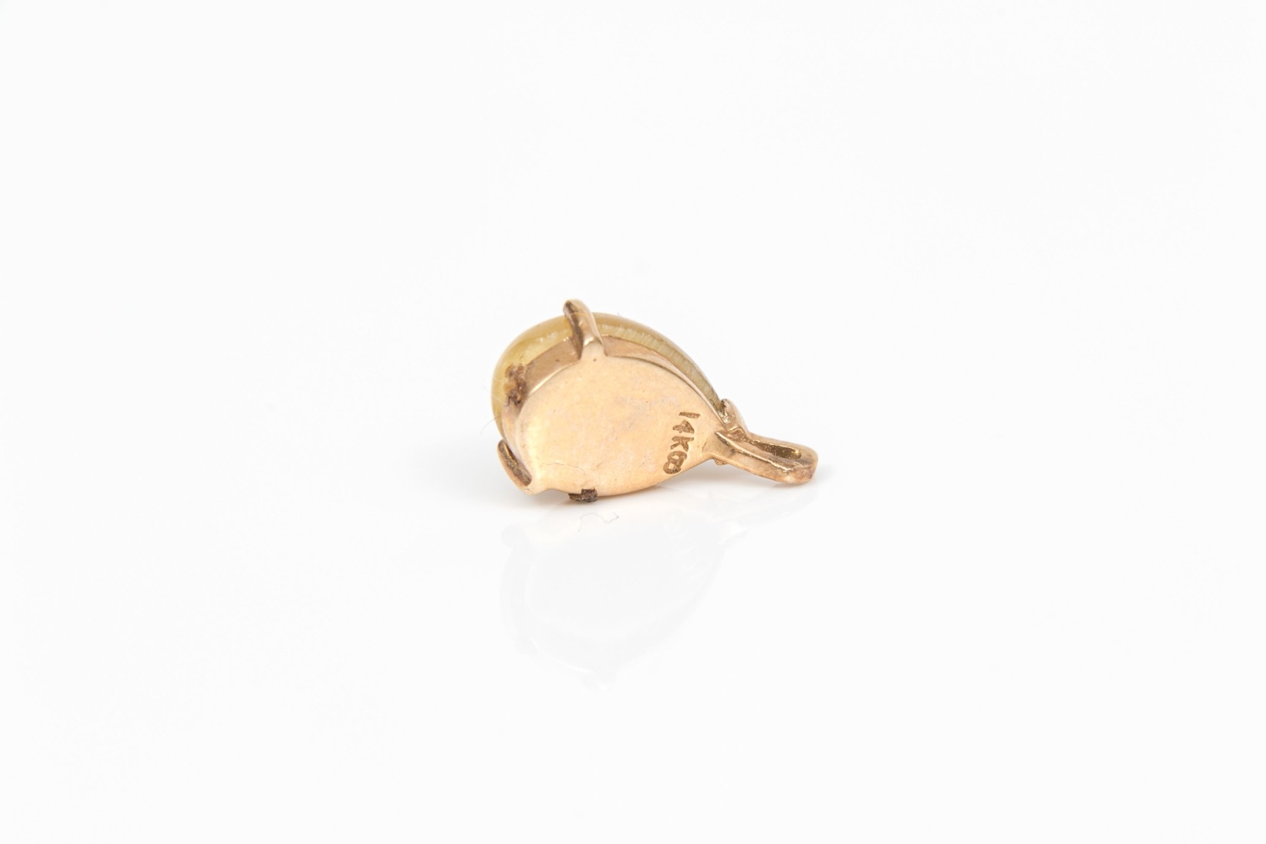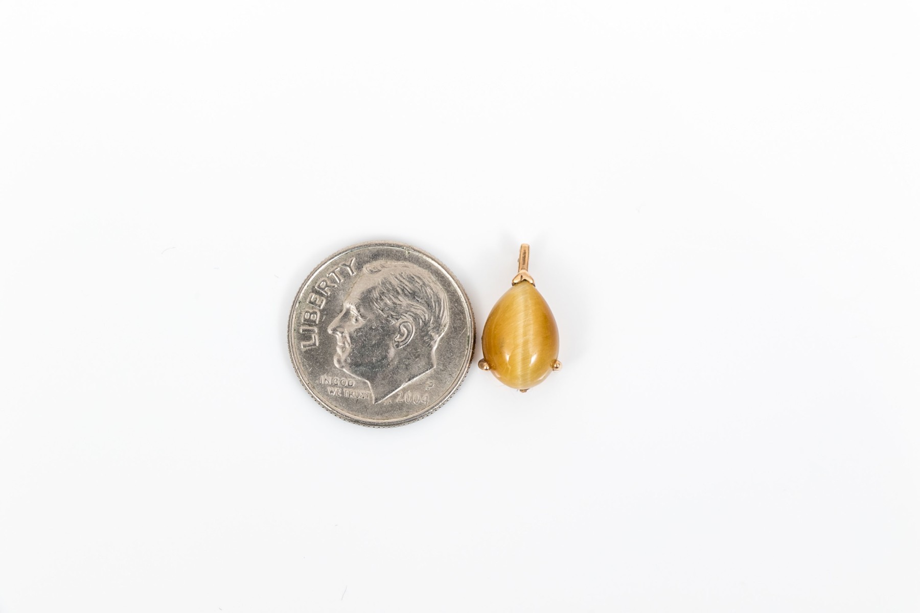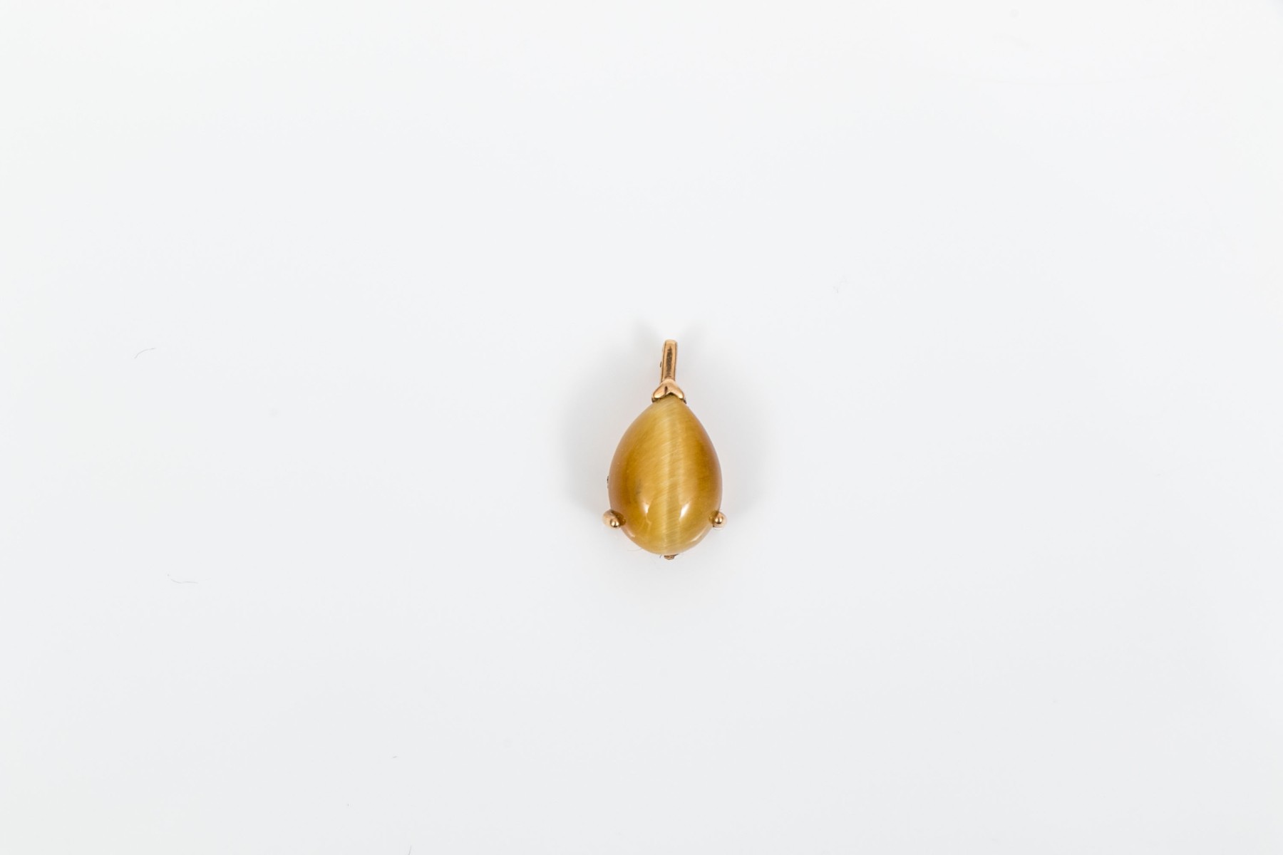 14k yellow gold cabachon tan to brown cats eye pendant, prong set, finished with a solid style bale