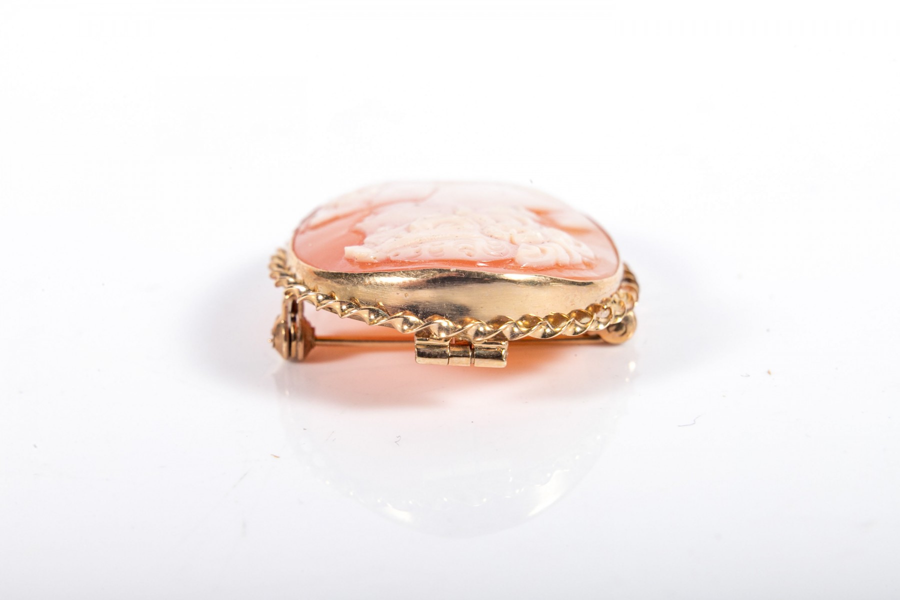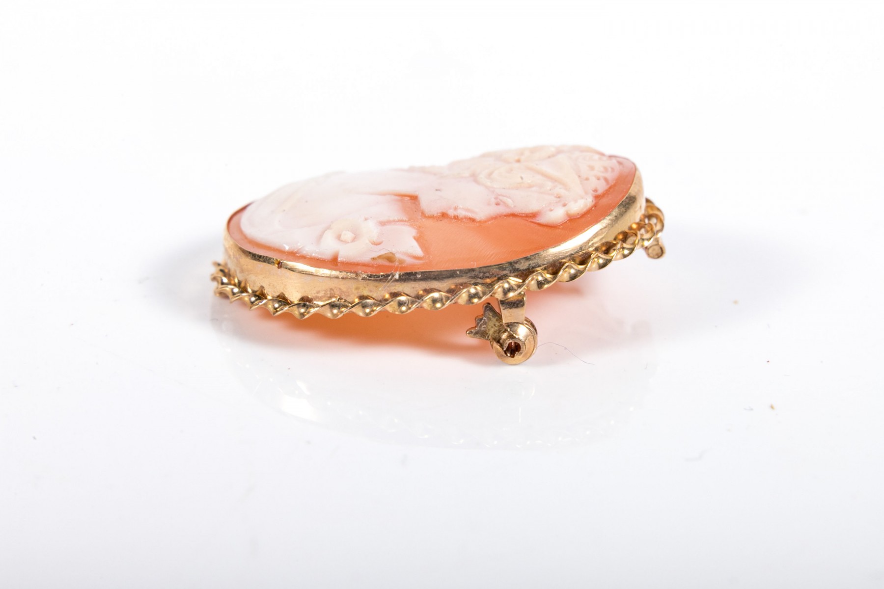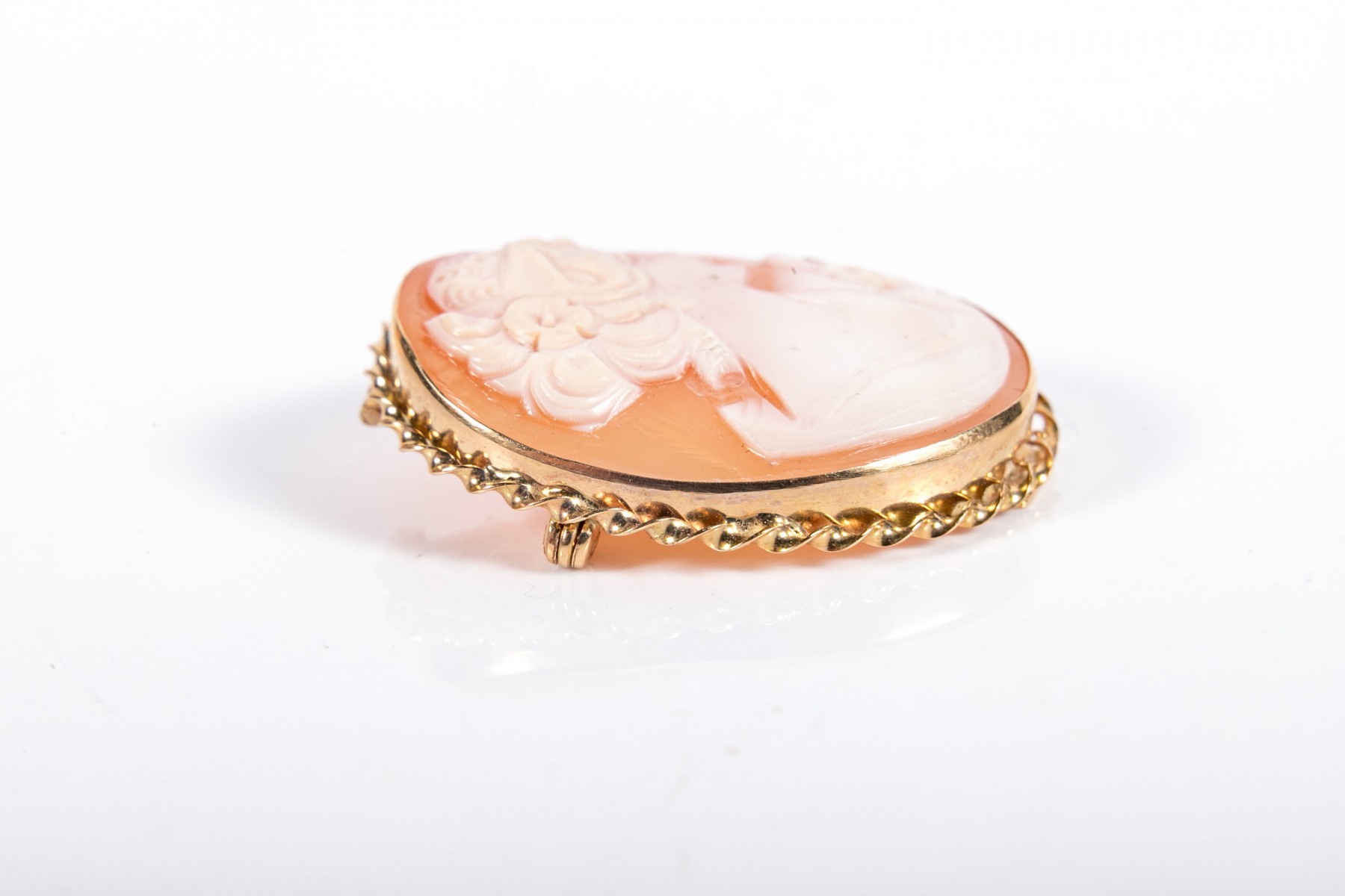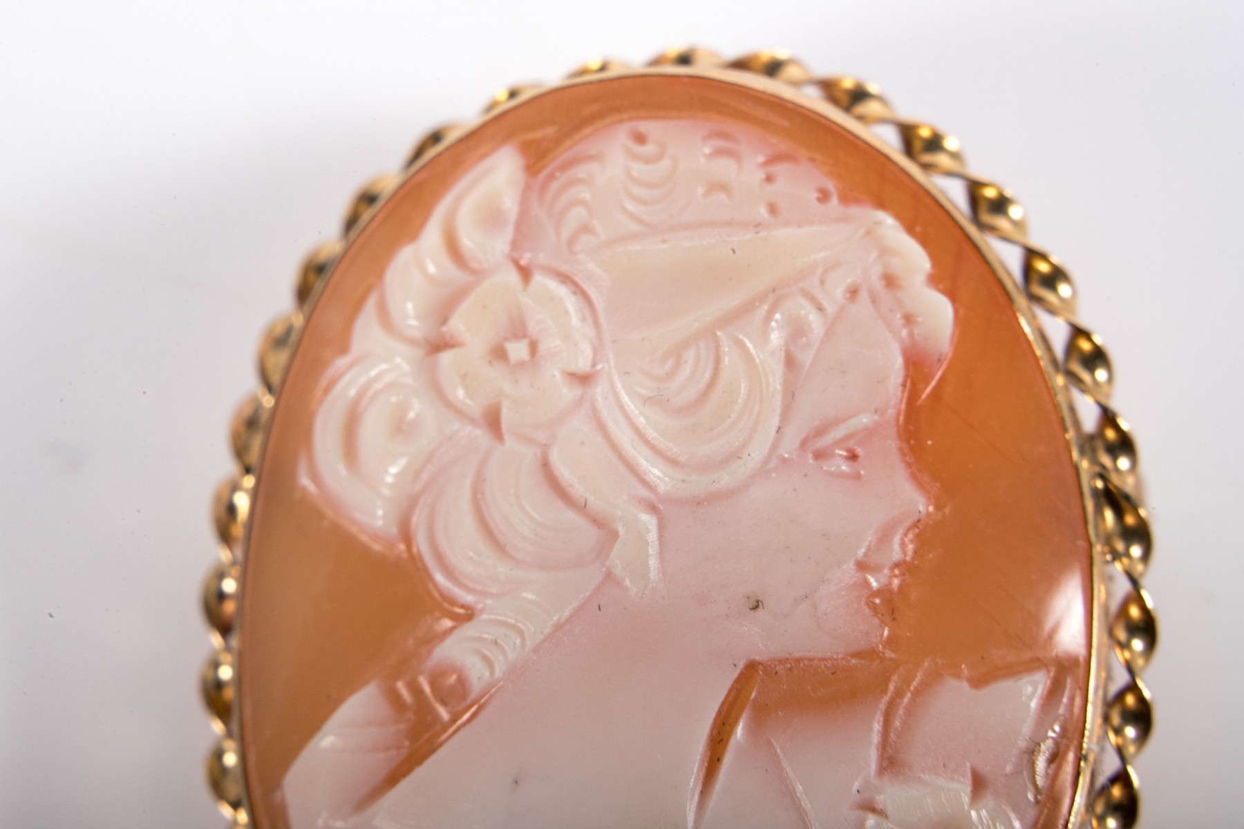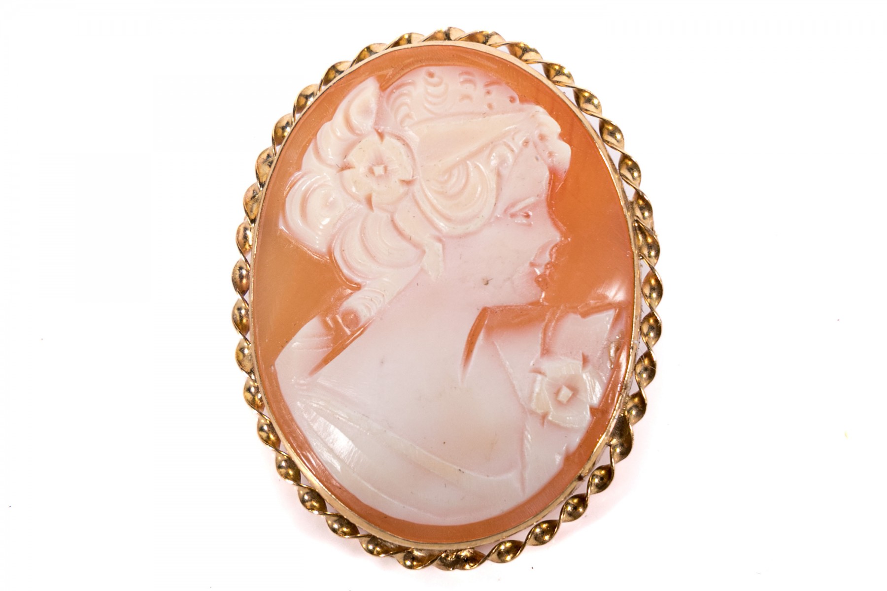 Lovely white-to-pink cameo brooch depicting a young woman in profile with a floral updo, displayed in a bezel setting with a rope-twist border topped with a pear-shaped bail and a pin back.