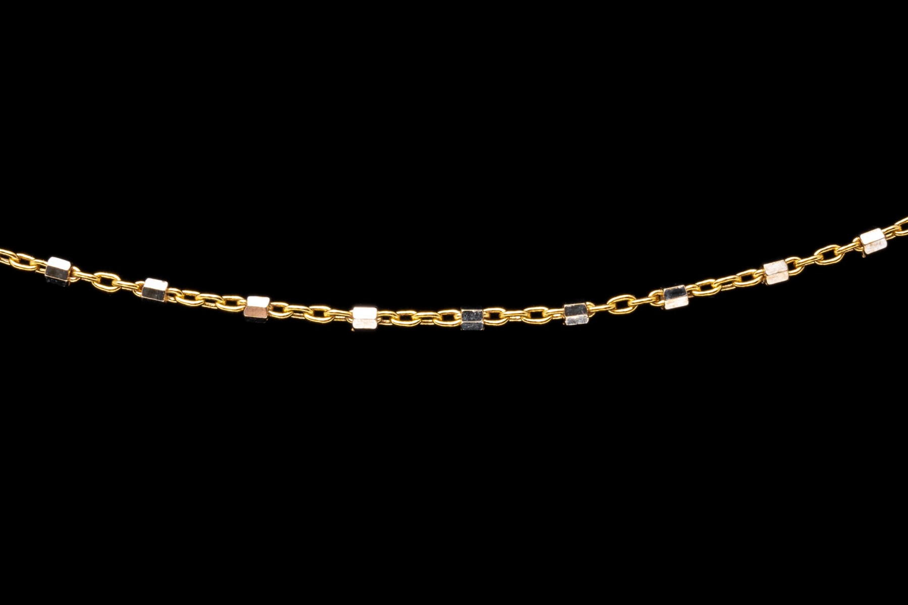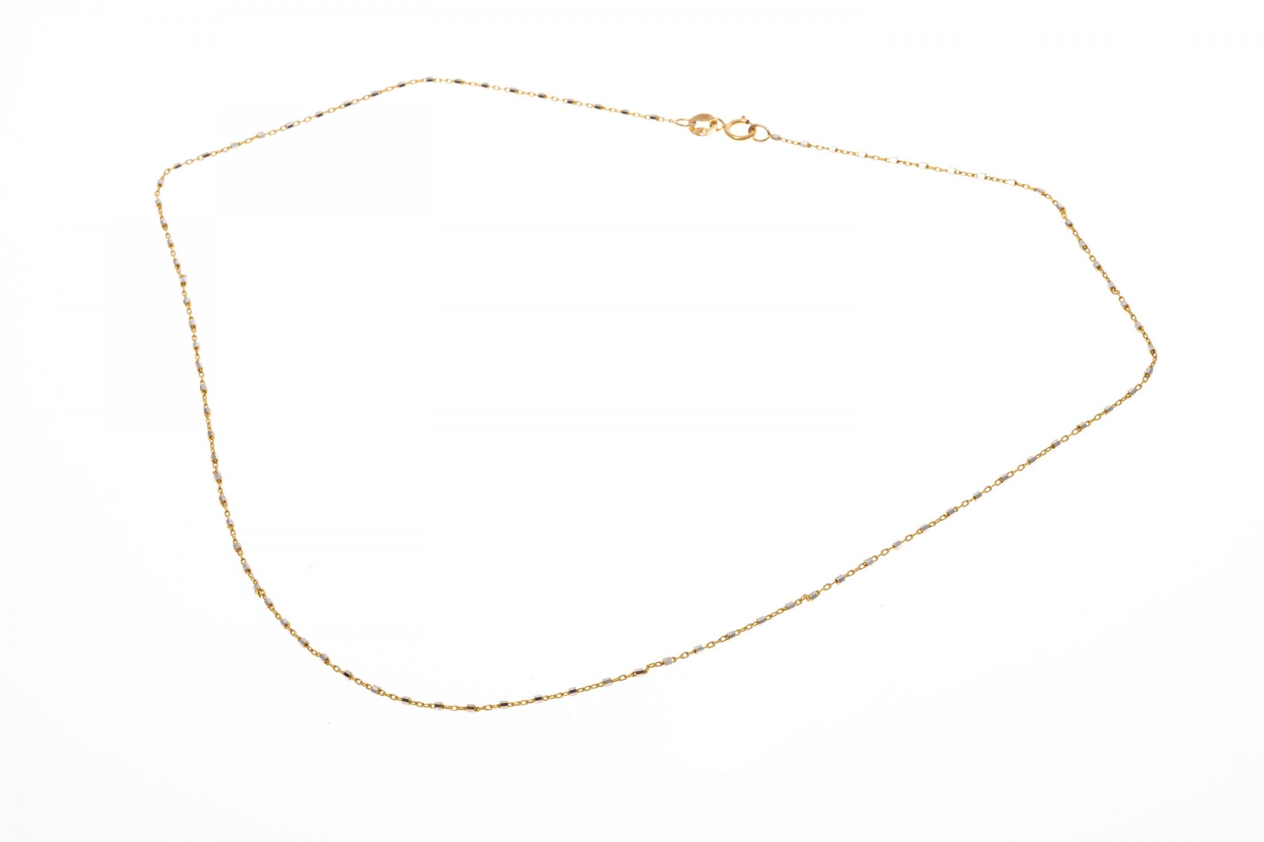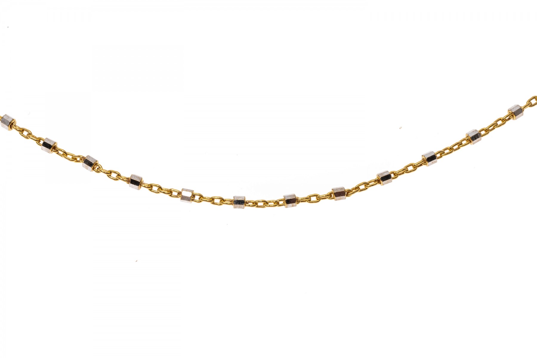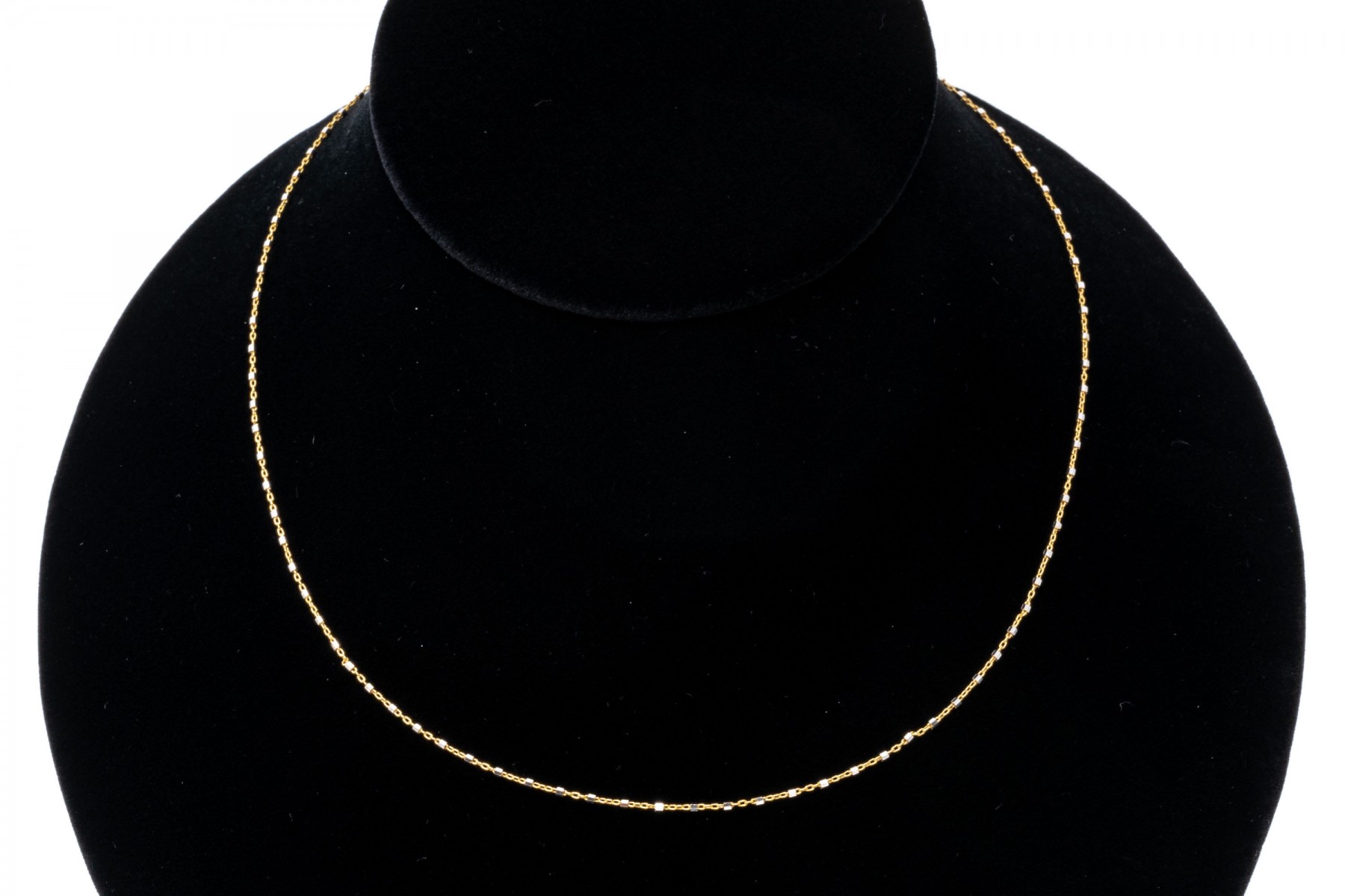 14k necklace. This handsome yellow and white gold fine link necklace has faceted, white gold diamond cut links, alternating with yellow gold curb link chain. The necklace is finished with a lobster claw clasp.
