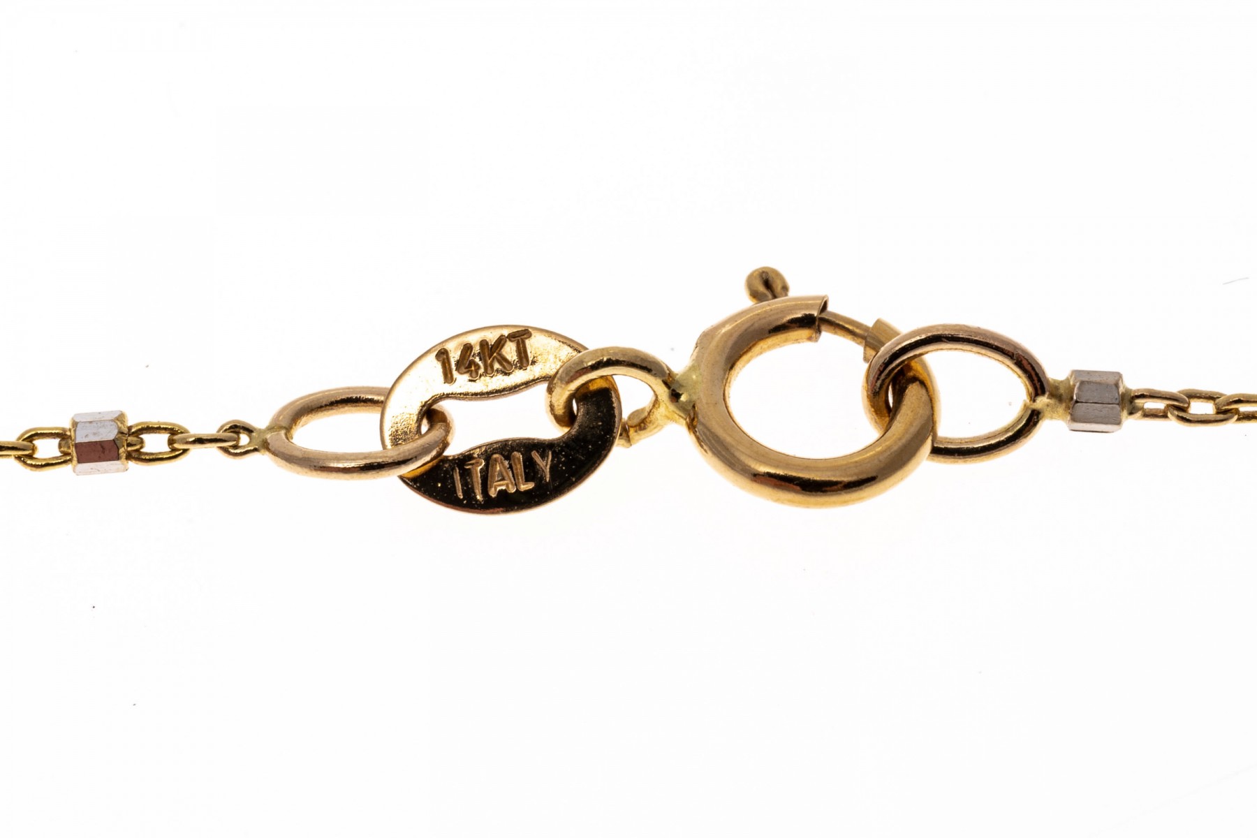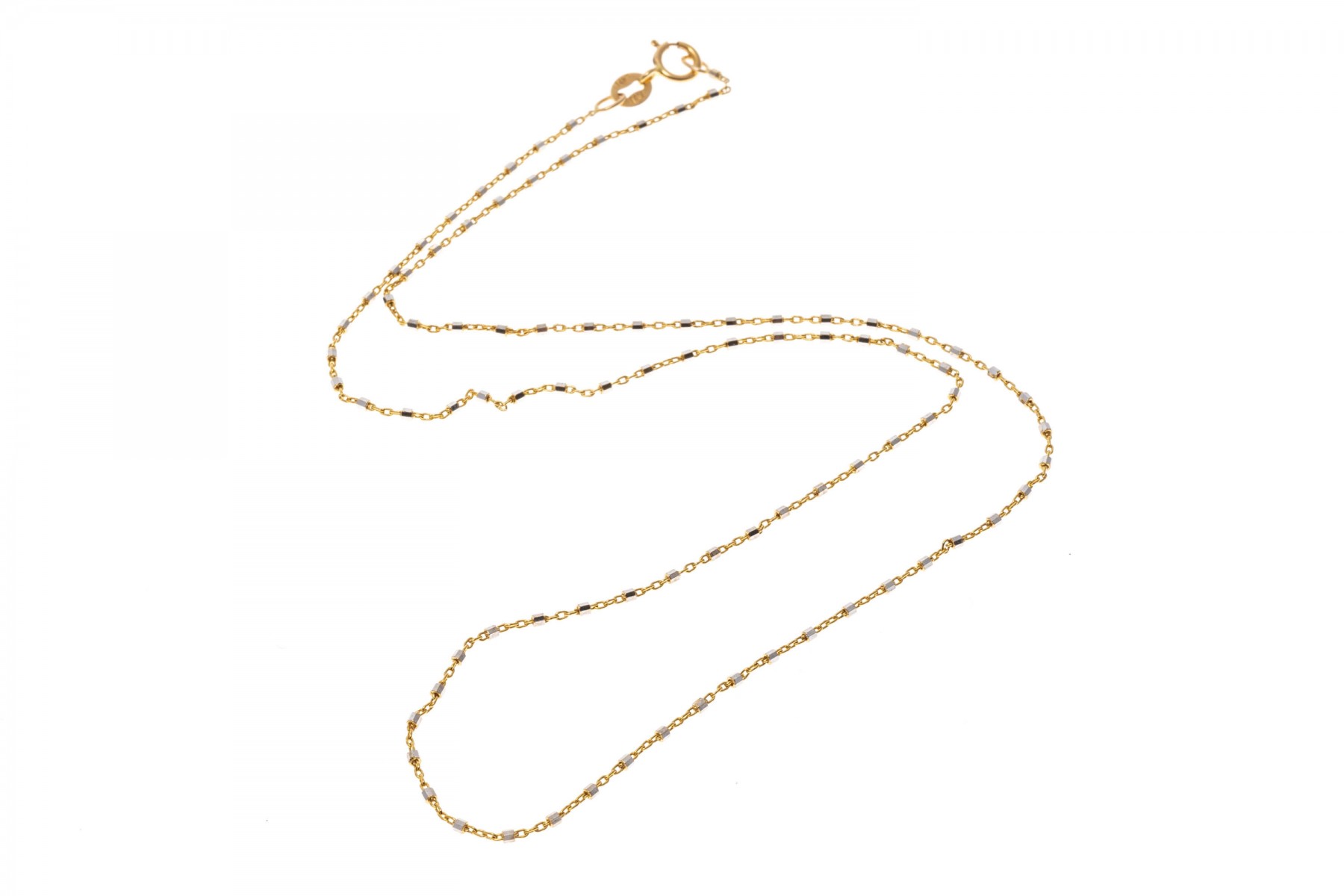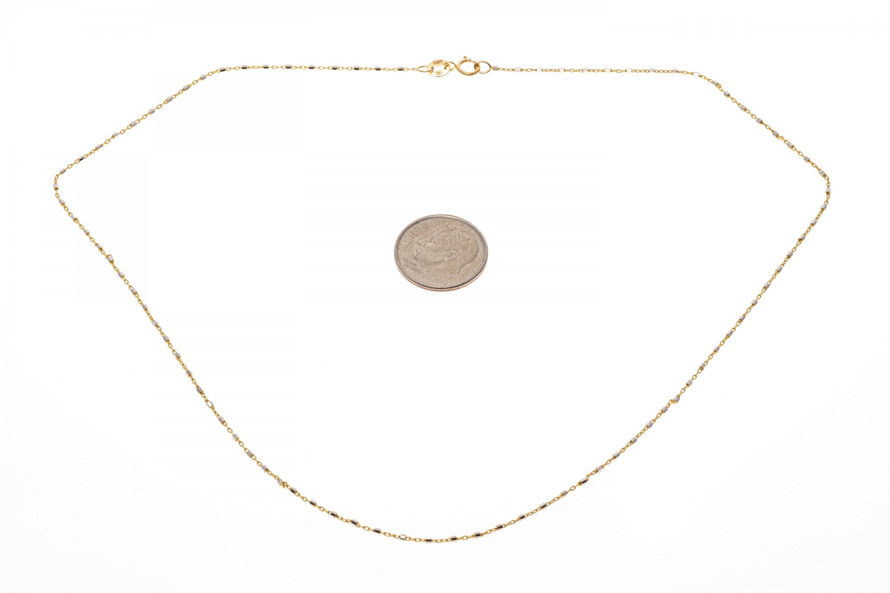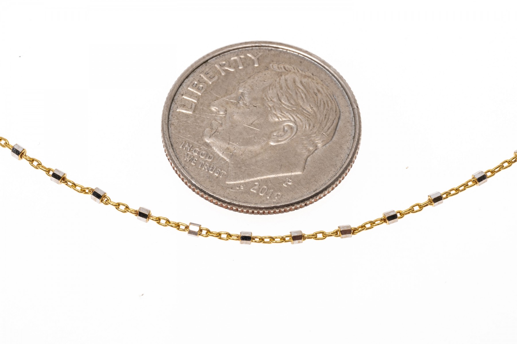 14k necklace. This handsome yellow and white gold fine link necklace has faceted, white gold diamond cut links, alternating with yellow gold curb link chain. The necklace is finished with a lobster claw clasp.