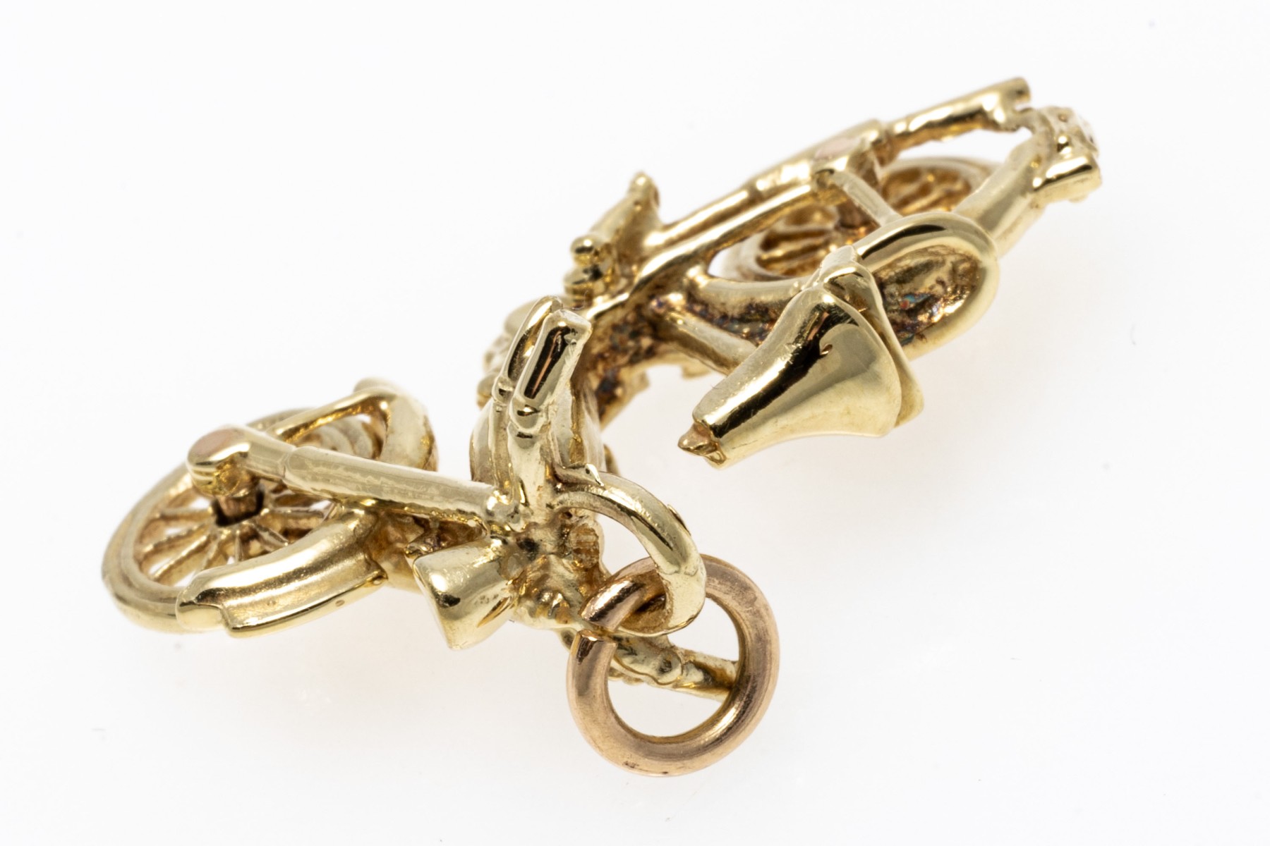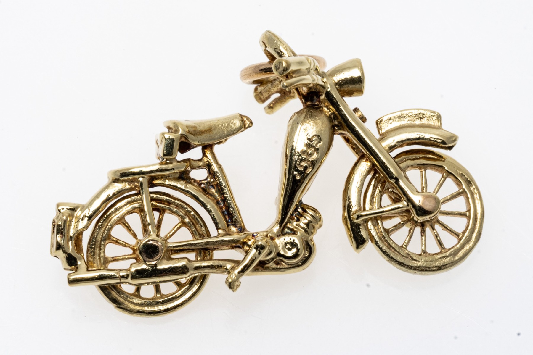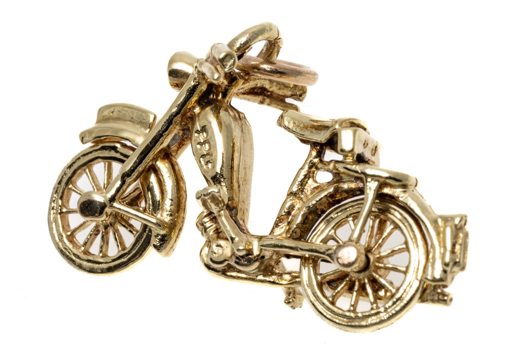 14k yellow gold charming pedal motorcycle charm, with moveable wheels, finished with a jump ring style bale