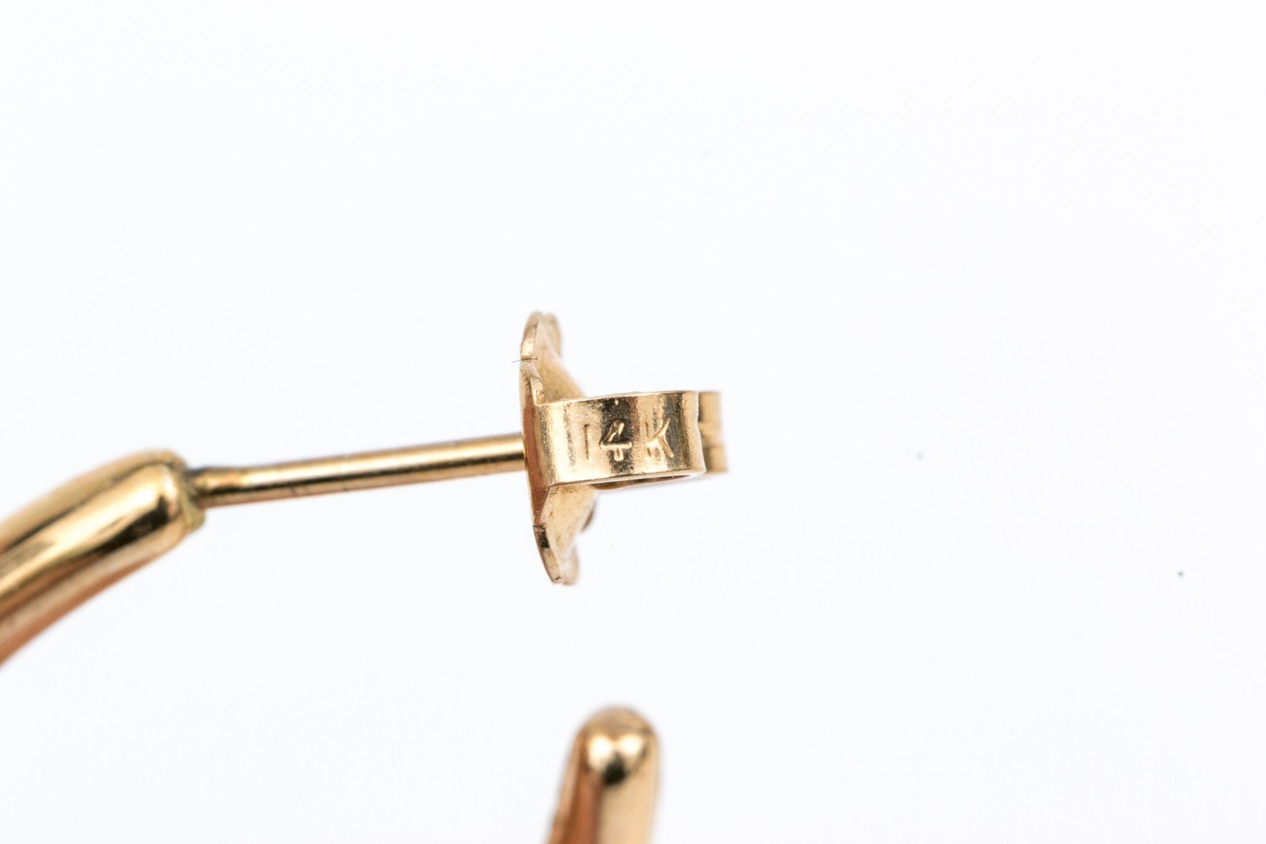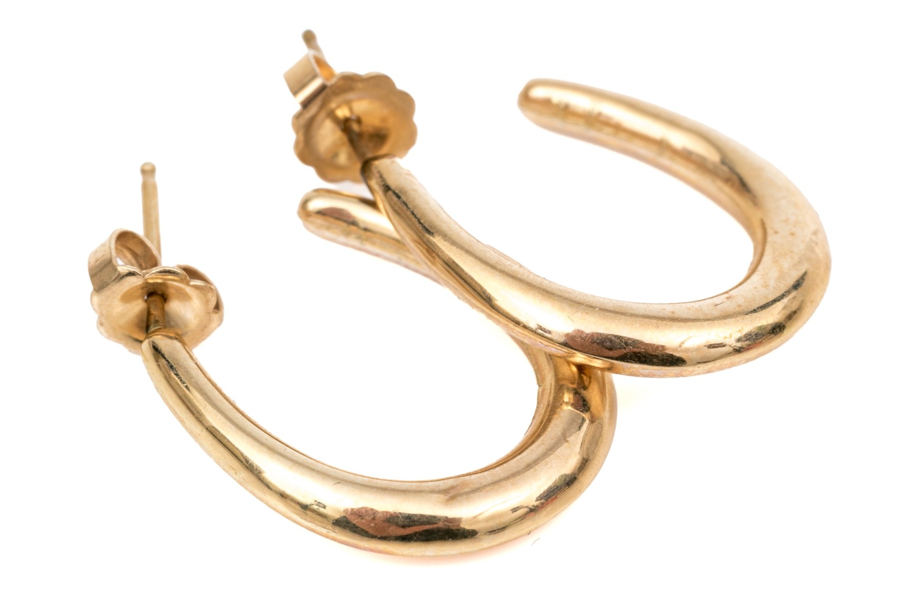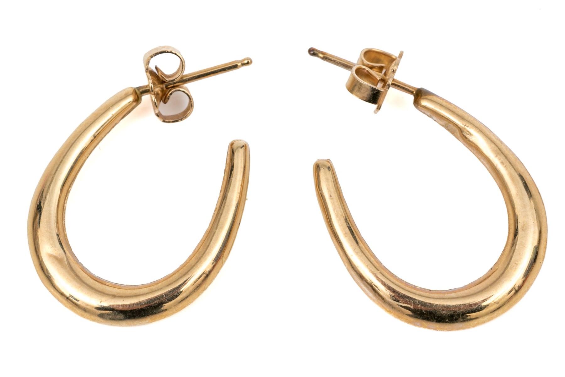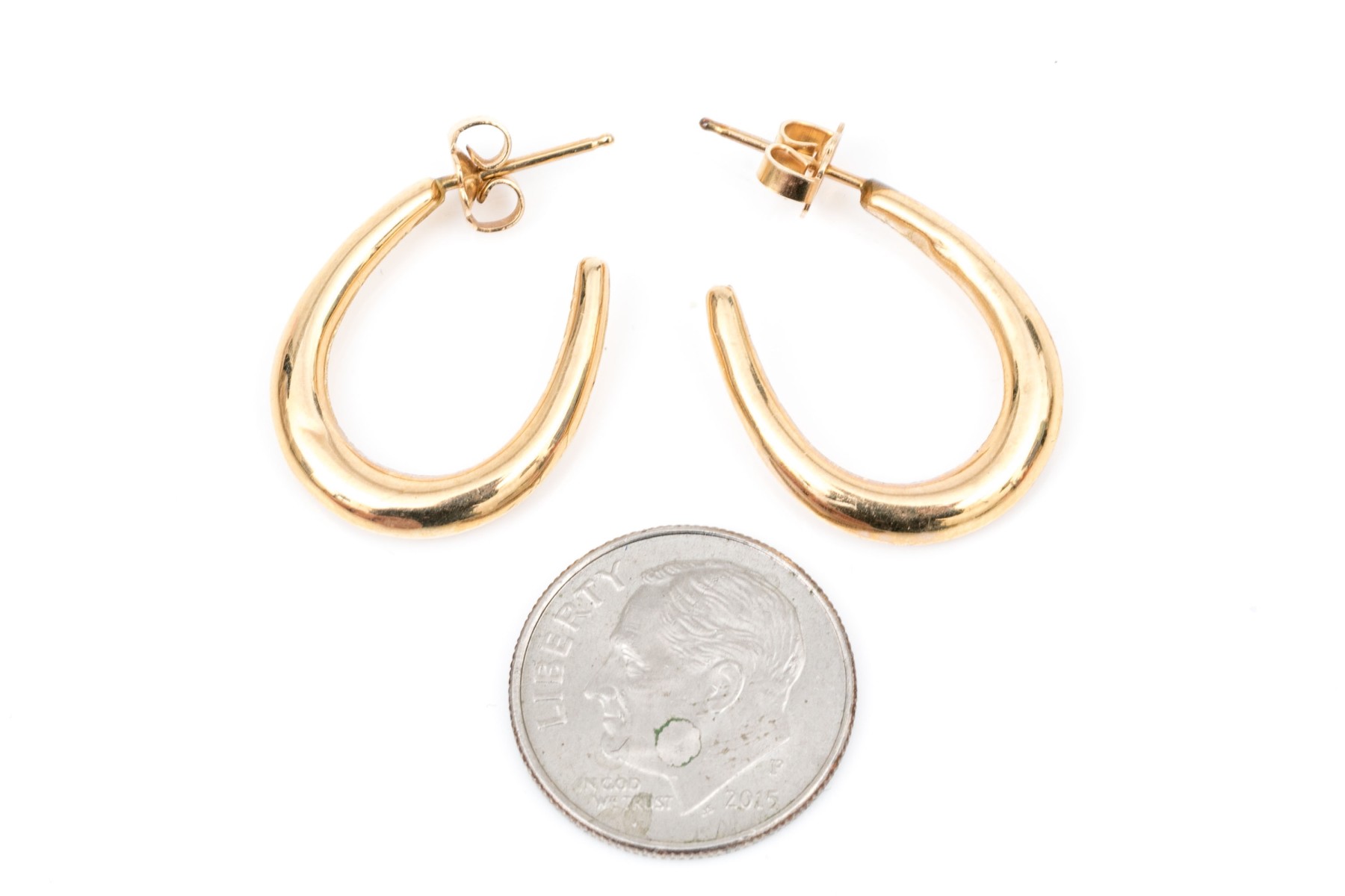 14k yellow gold chic high polished puffed oval hoop earrings. The earrings are finished by posts with clutch style backs