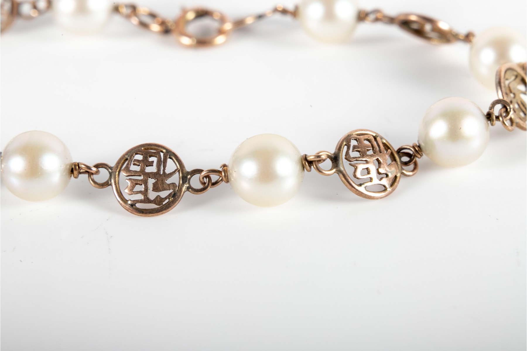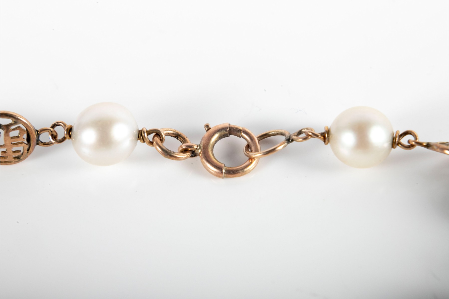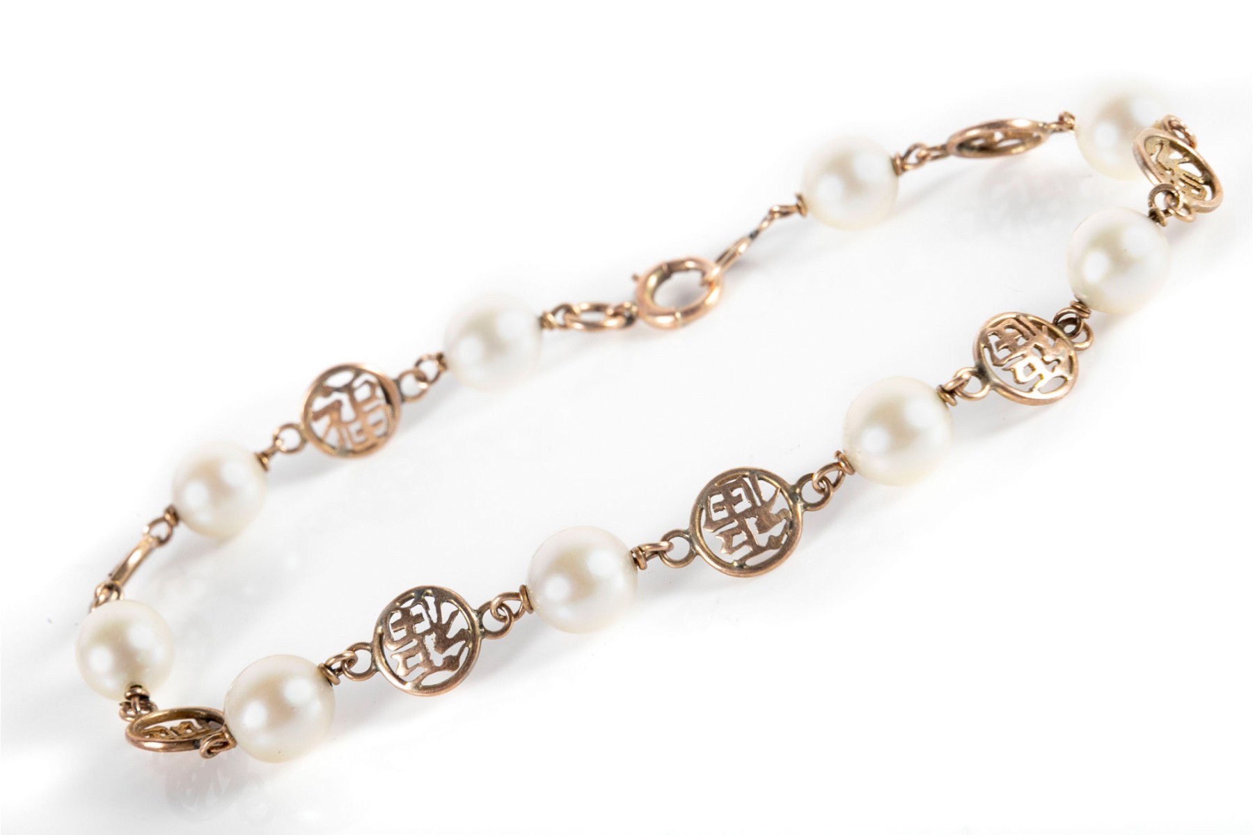 A lovely yellow gold bracelet displaying round white cultured pearls alternating between pierced Chinese character medallions.