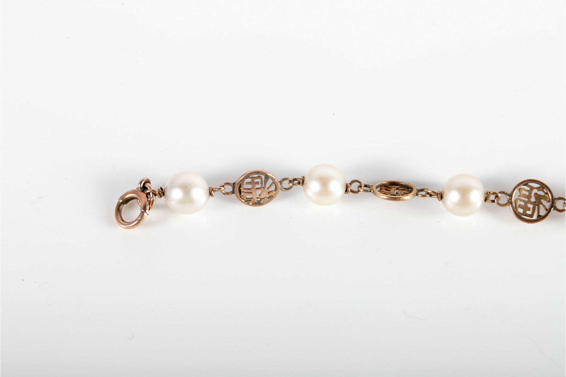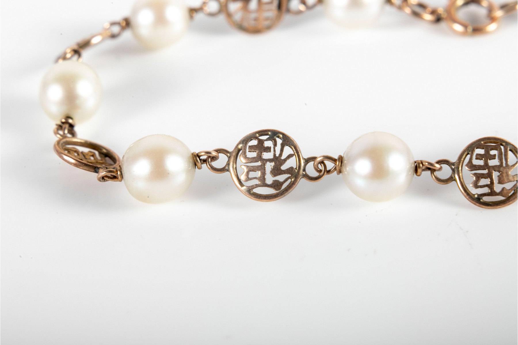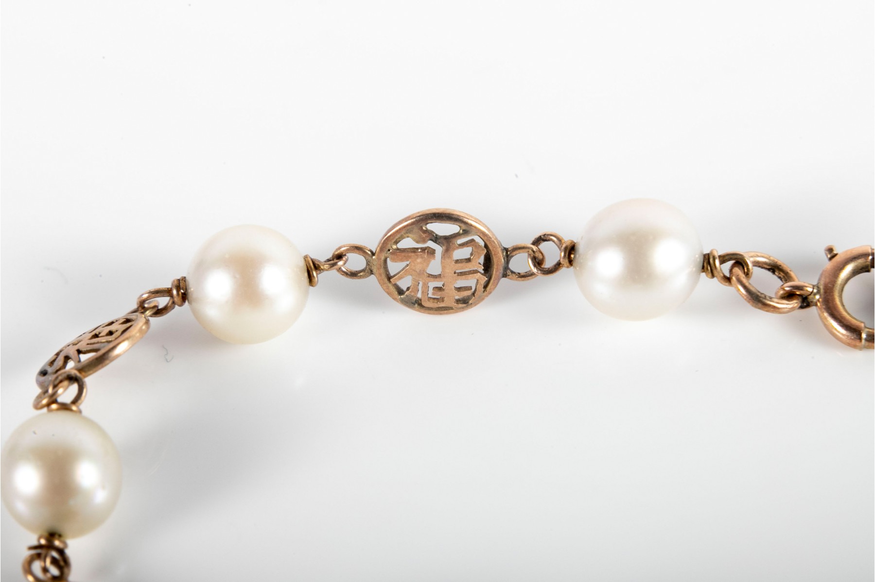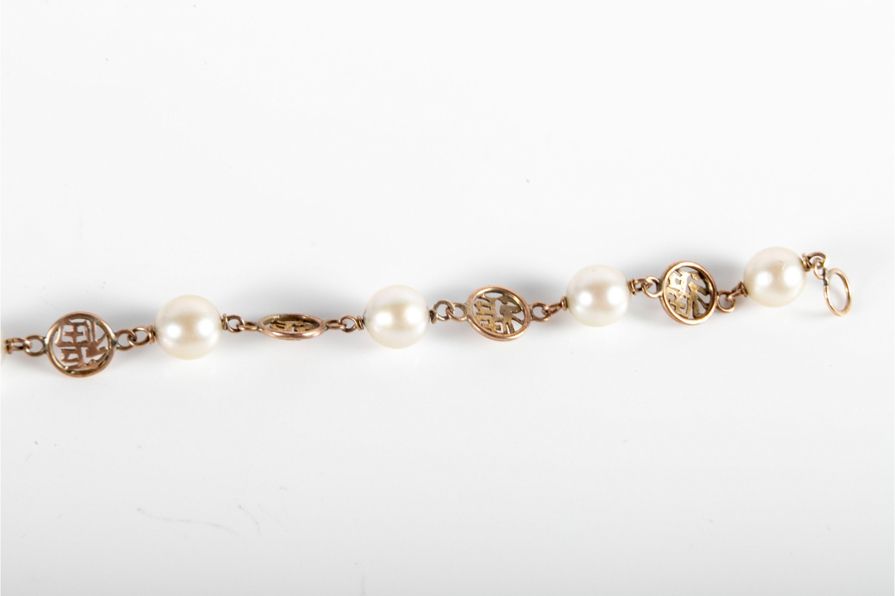 A lovely yellow gold bracelet displaying round white cultured pearls alternating between pierced Chinese character medallions.