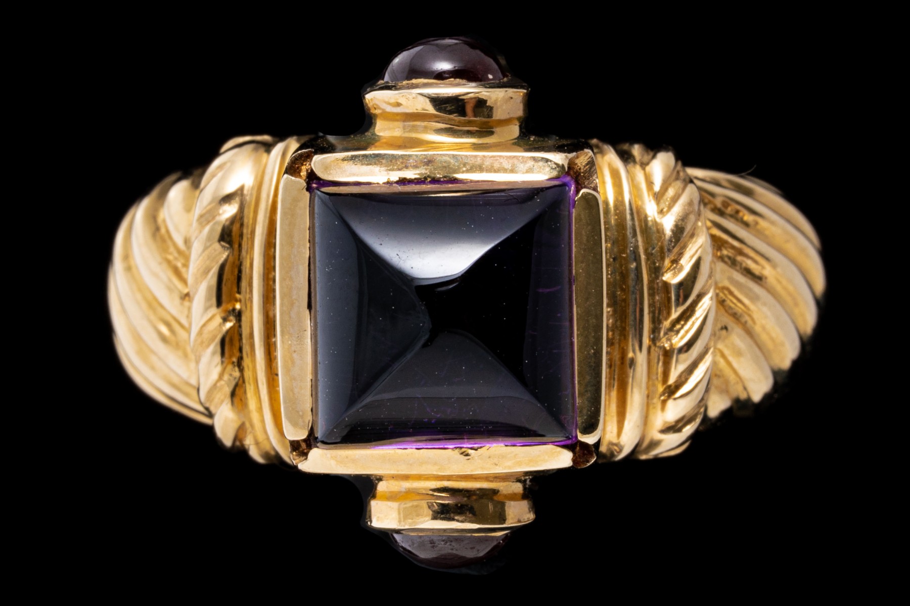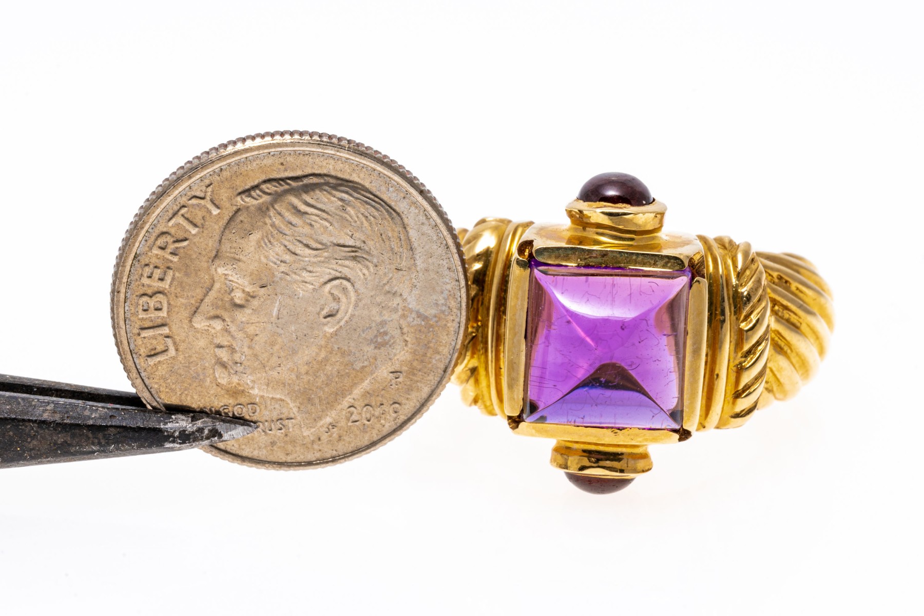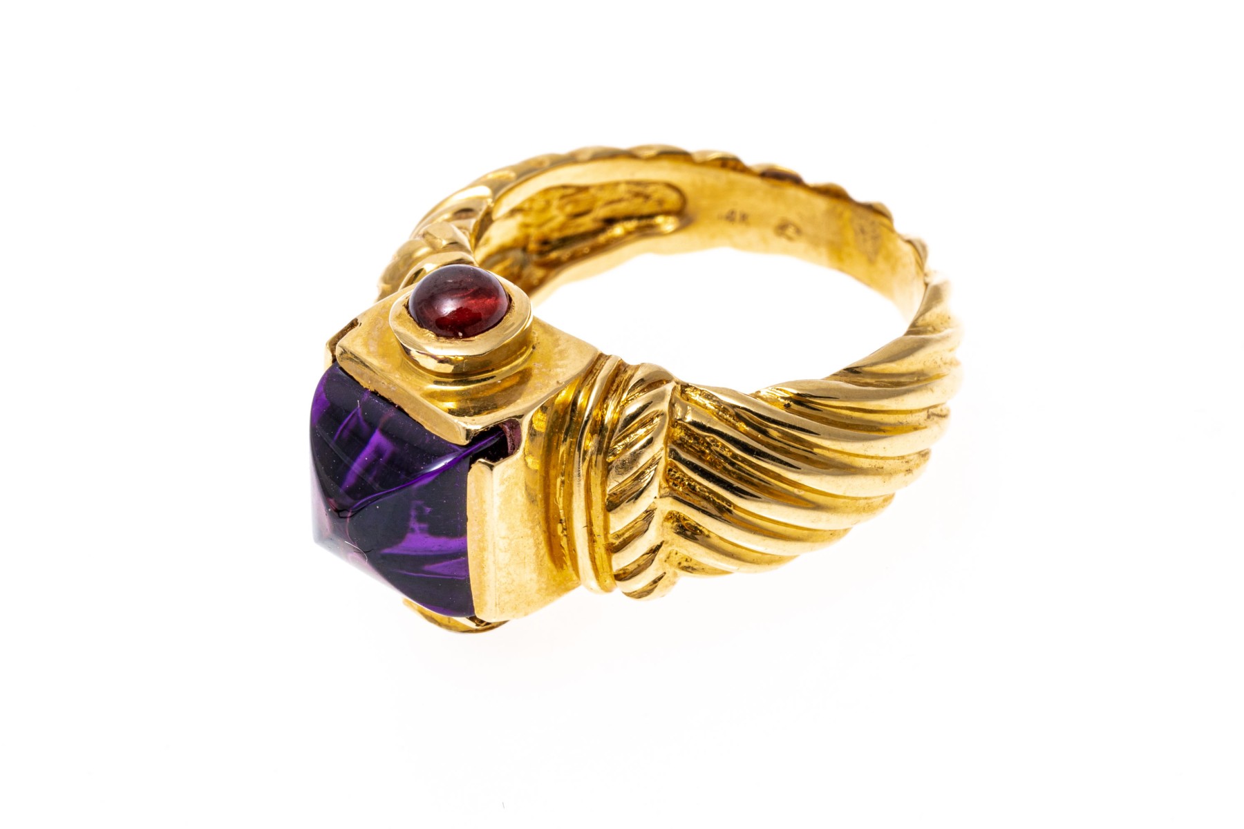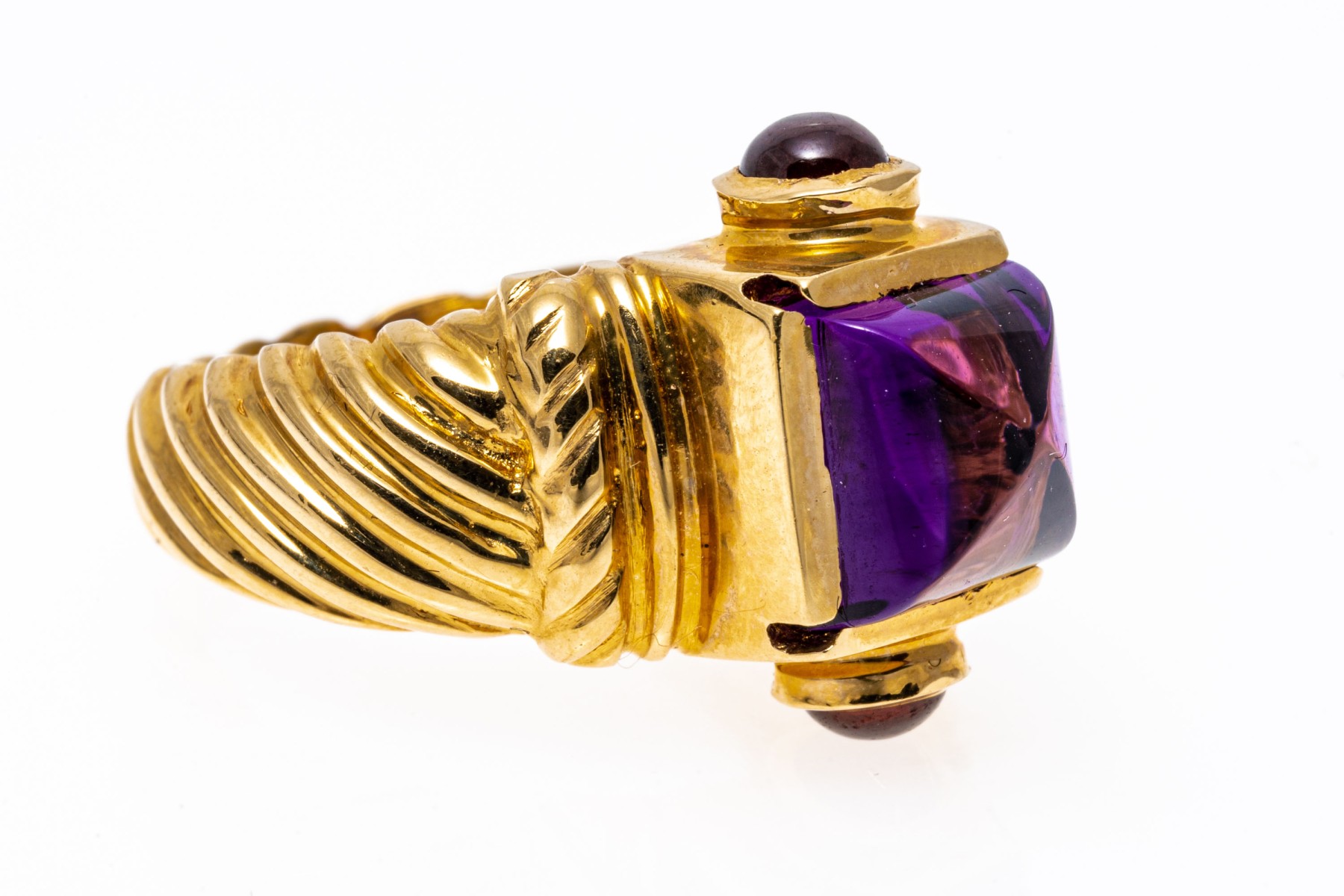 This handsome yellow gold ring has a square sugarloaf cabochon amethyst center stone, medium to light purple color, bezel set and adorned by round cabochon cut, light burgundy color garnets, bezel set on the gallery. The shoulders are decorated with a ribbed pattern that leads into the back of the shank.