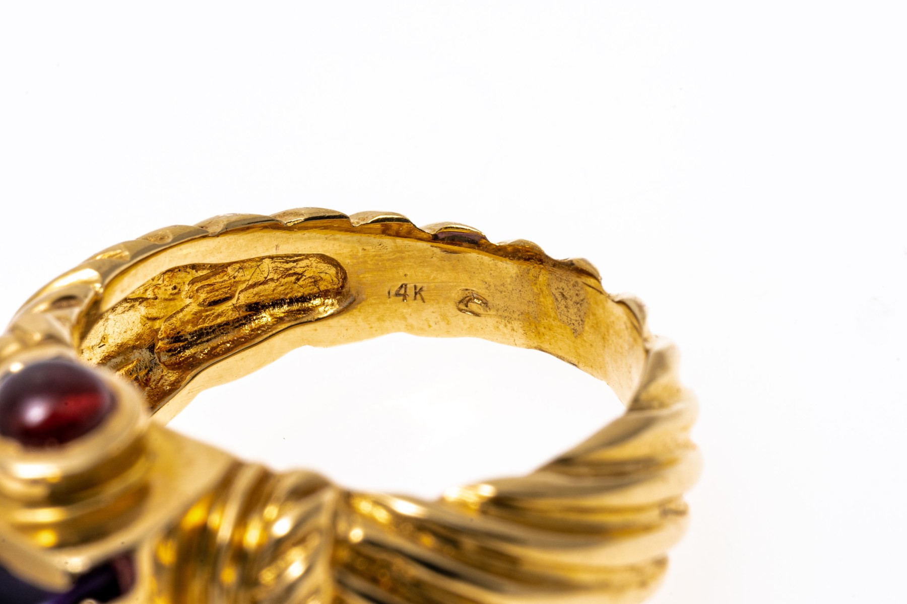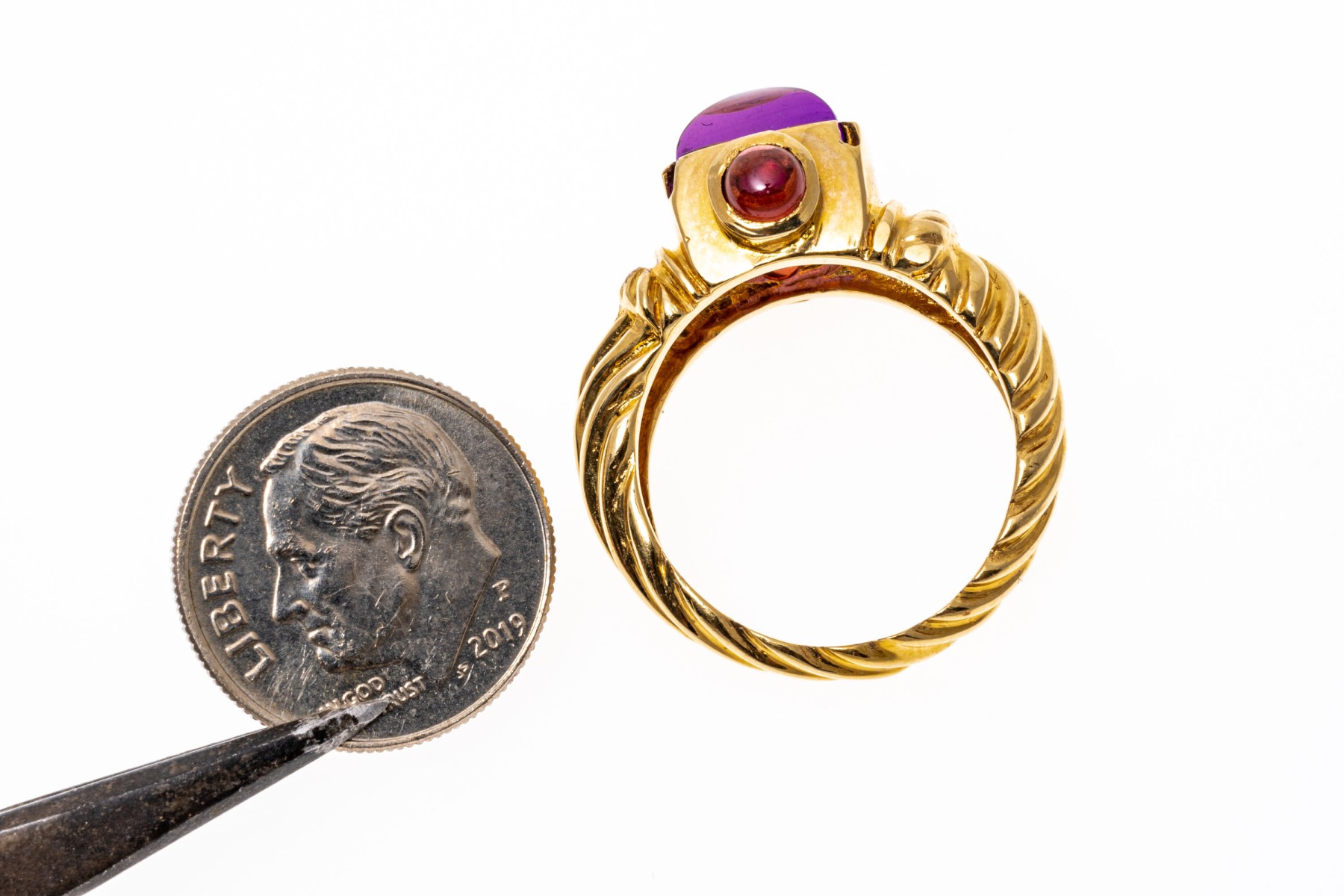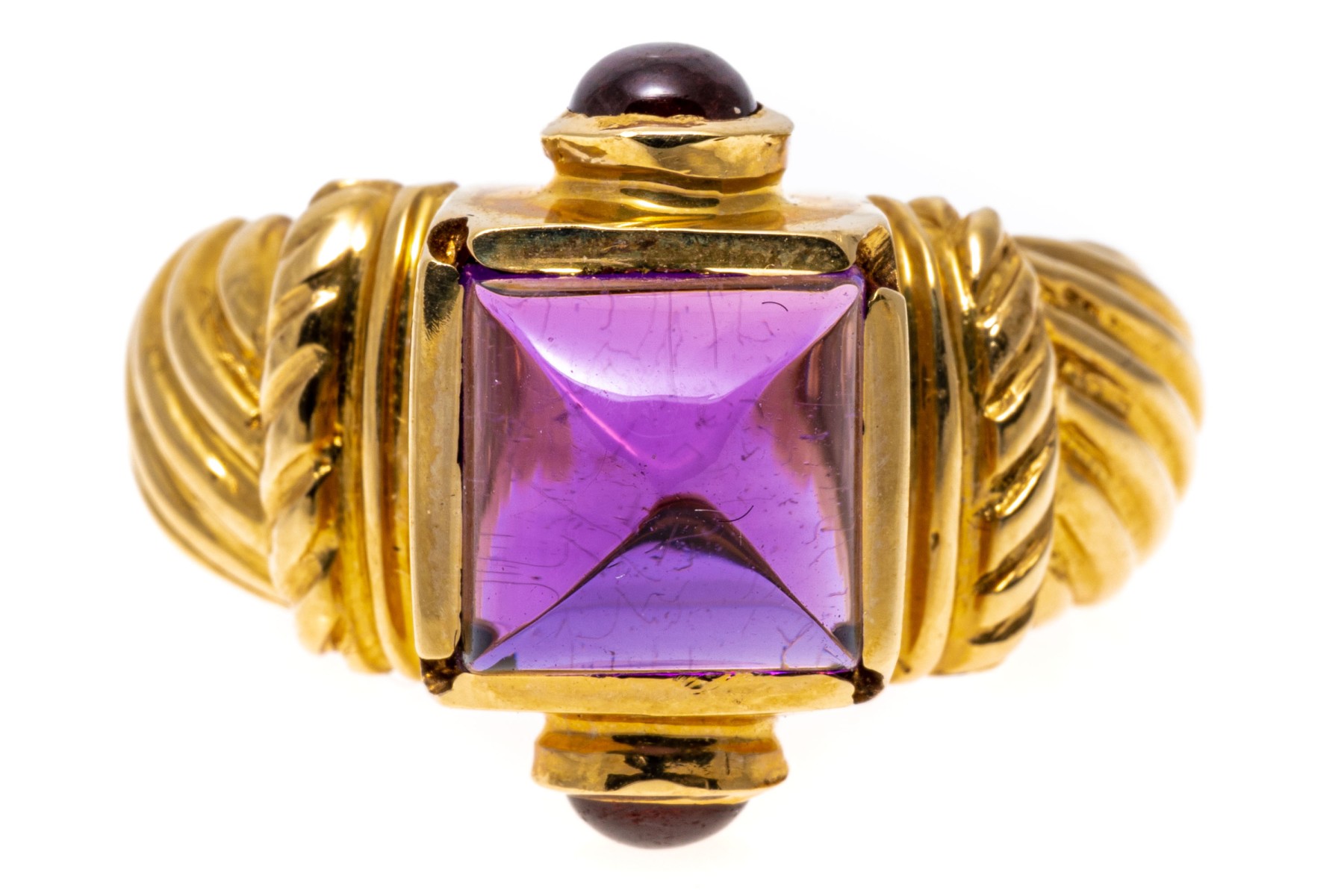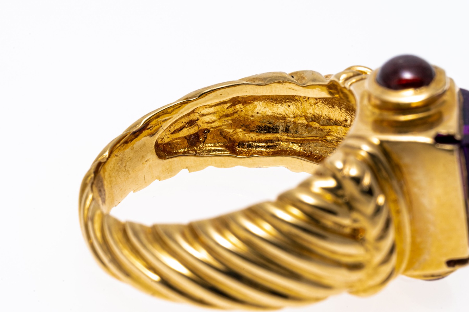This handsome yellow gold ring has a square sugarloaf cabochon amethyst center stone, medium to light purple color, bezel set and adorned by round cabochon cut, light burgundy color garnets, bezel set on the gallery. The shoulders are decorated with a ribbed pattern that leads into the back of the shank.