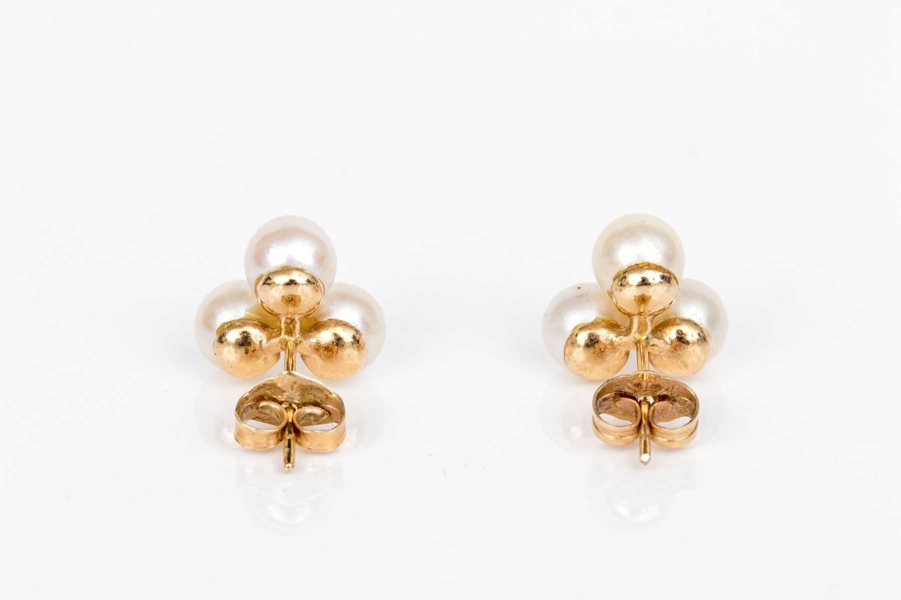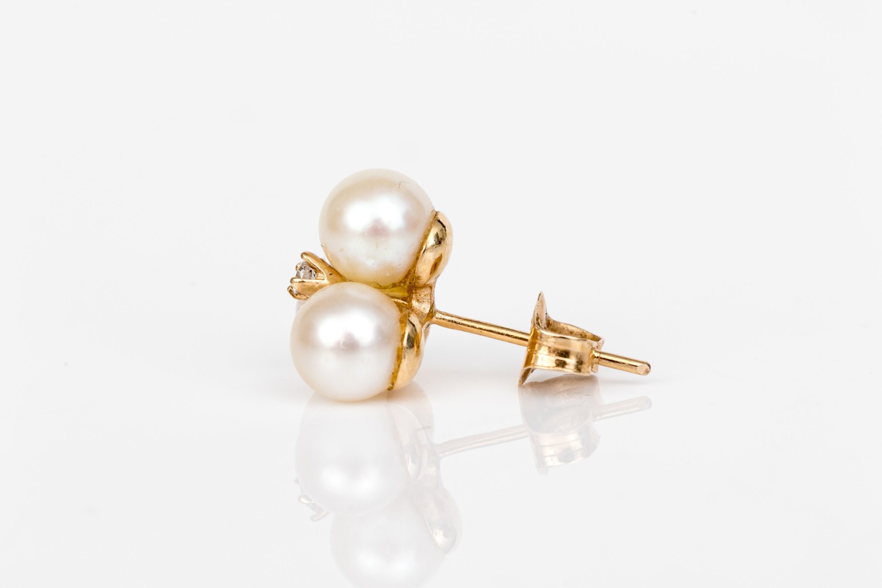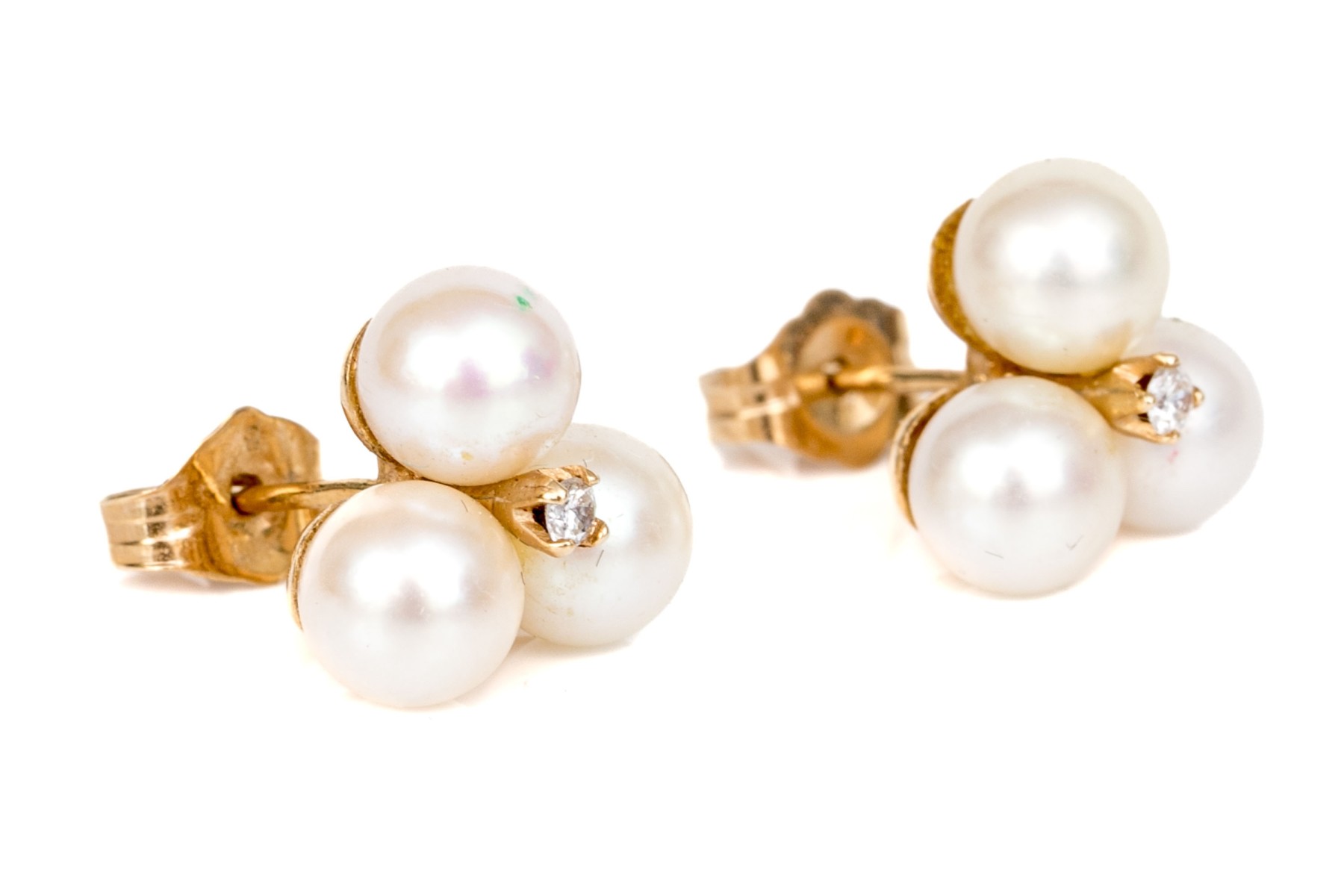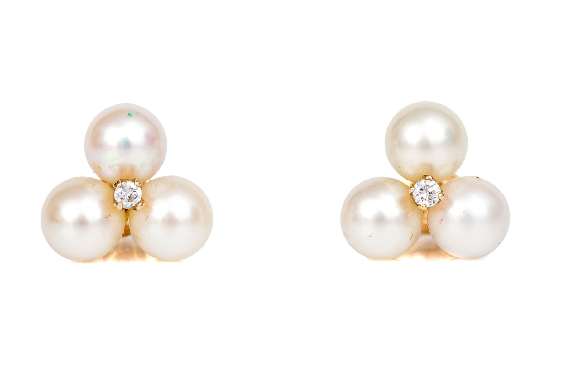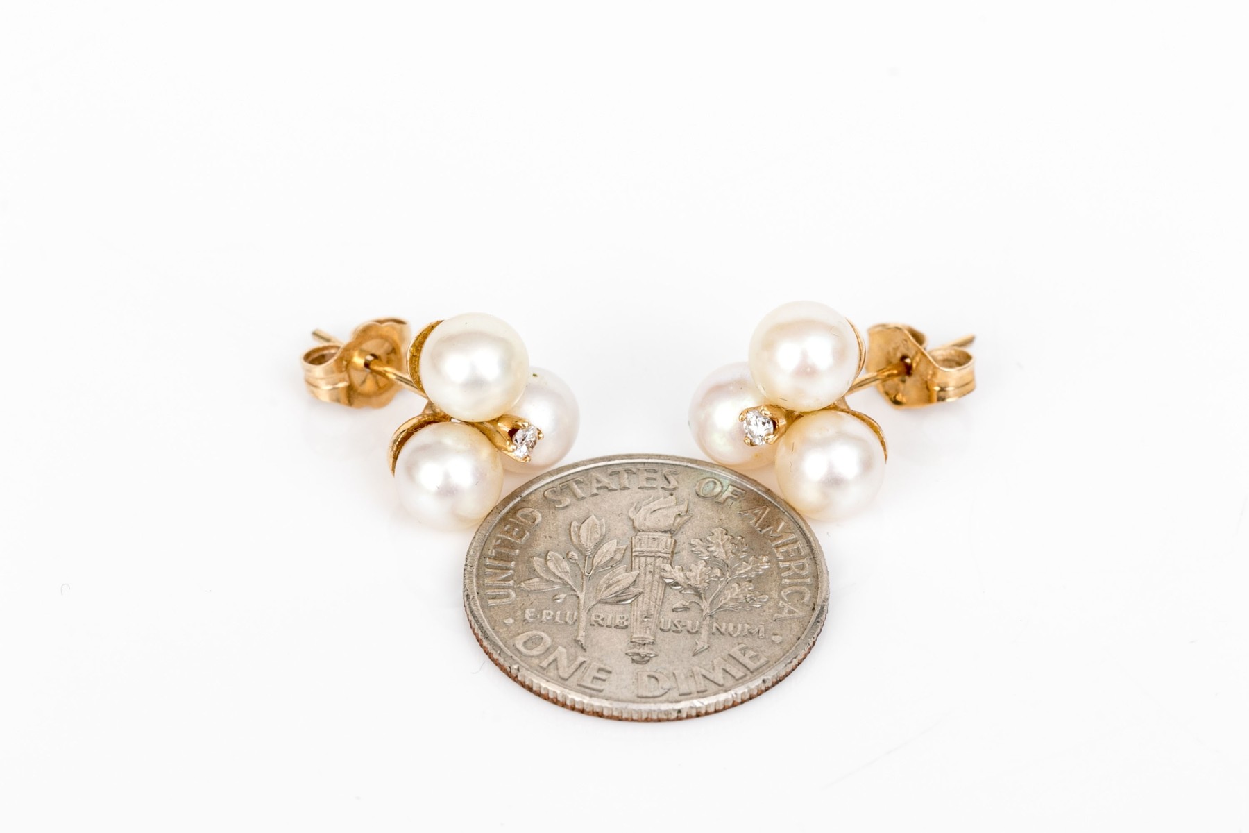 14k yellow gold classic 5.25mm trefoil cultured pearl earrings, with diamond centers, app. 0.03 TCW, prong set. The earrings are finished with posts and clutch style backs