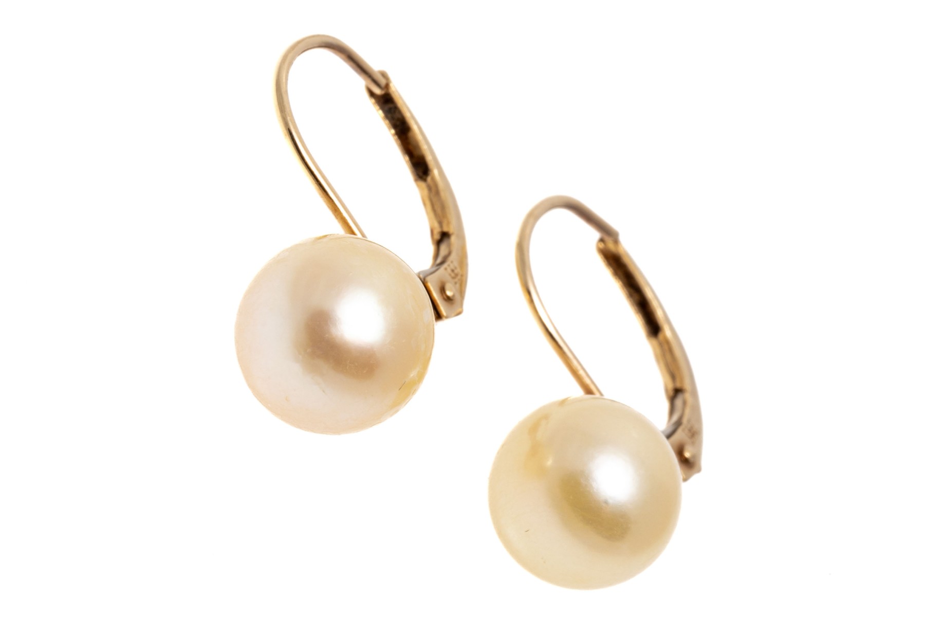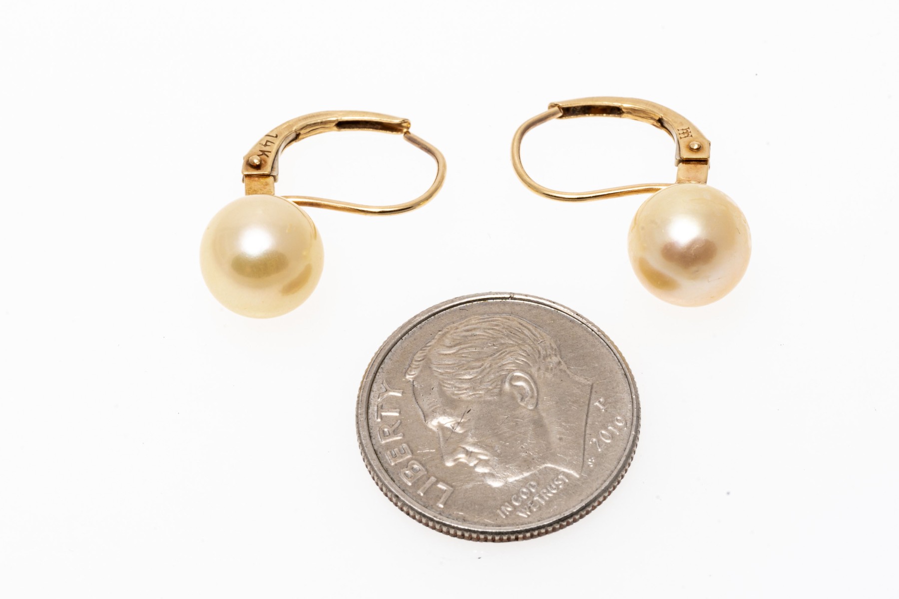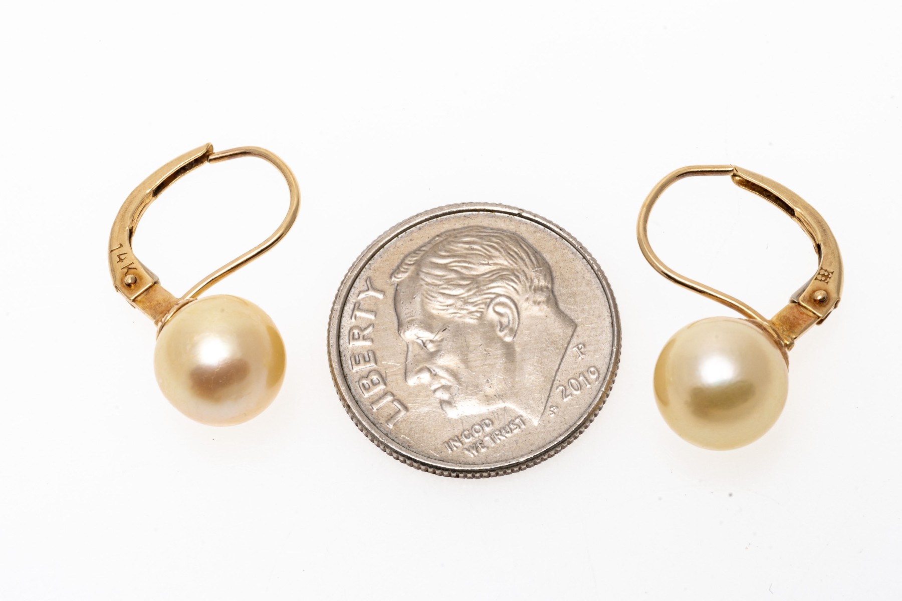 14k yellow gold classic 7.75 mm cultured pearl drop earrings, finished by wires with lever style backs