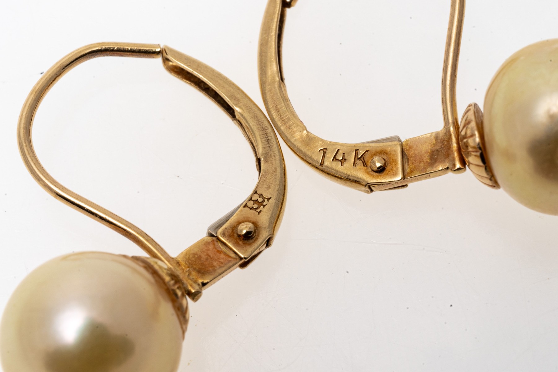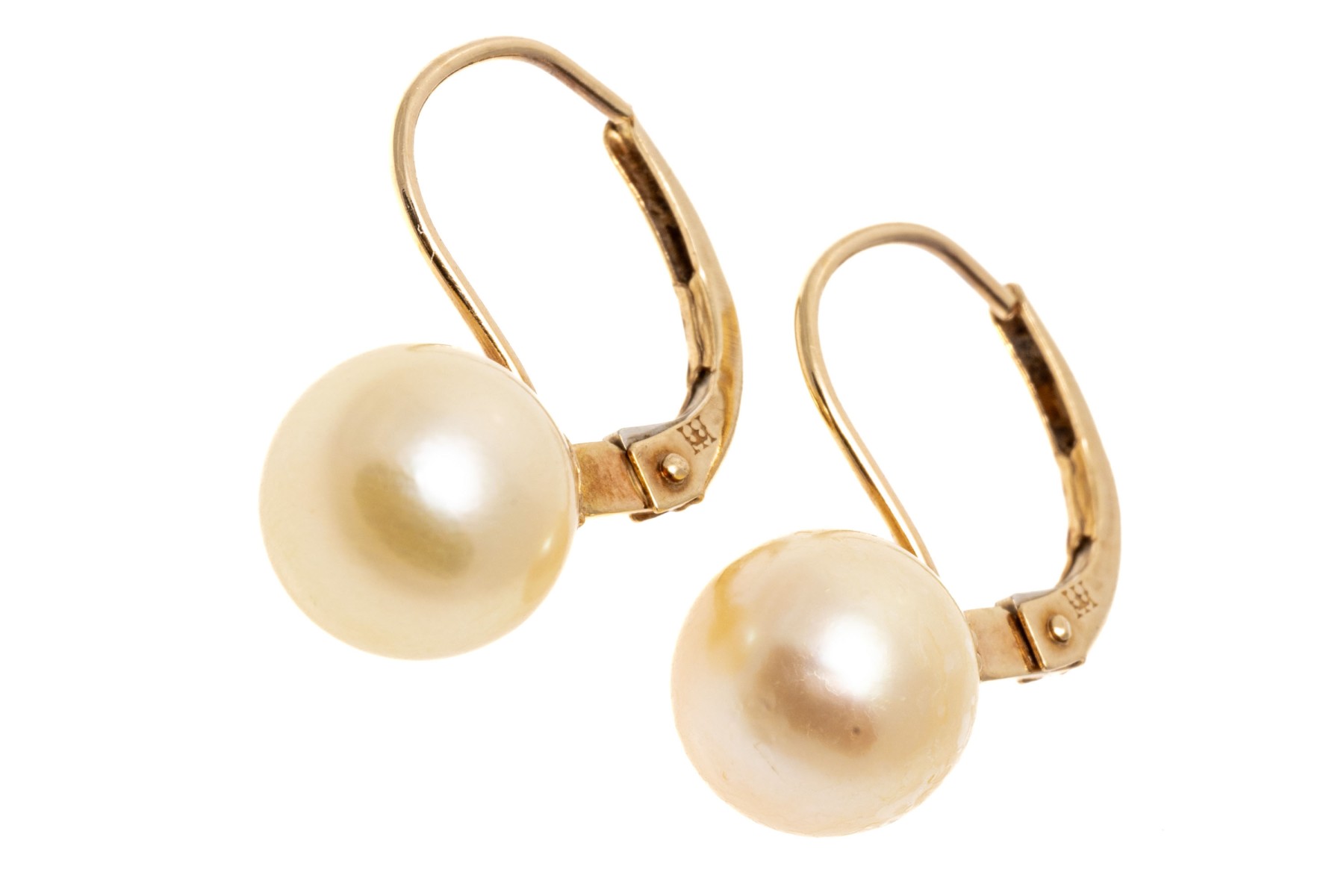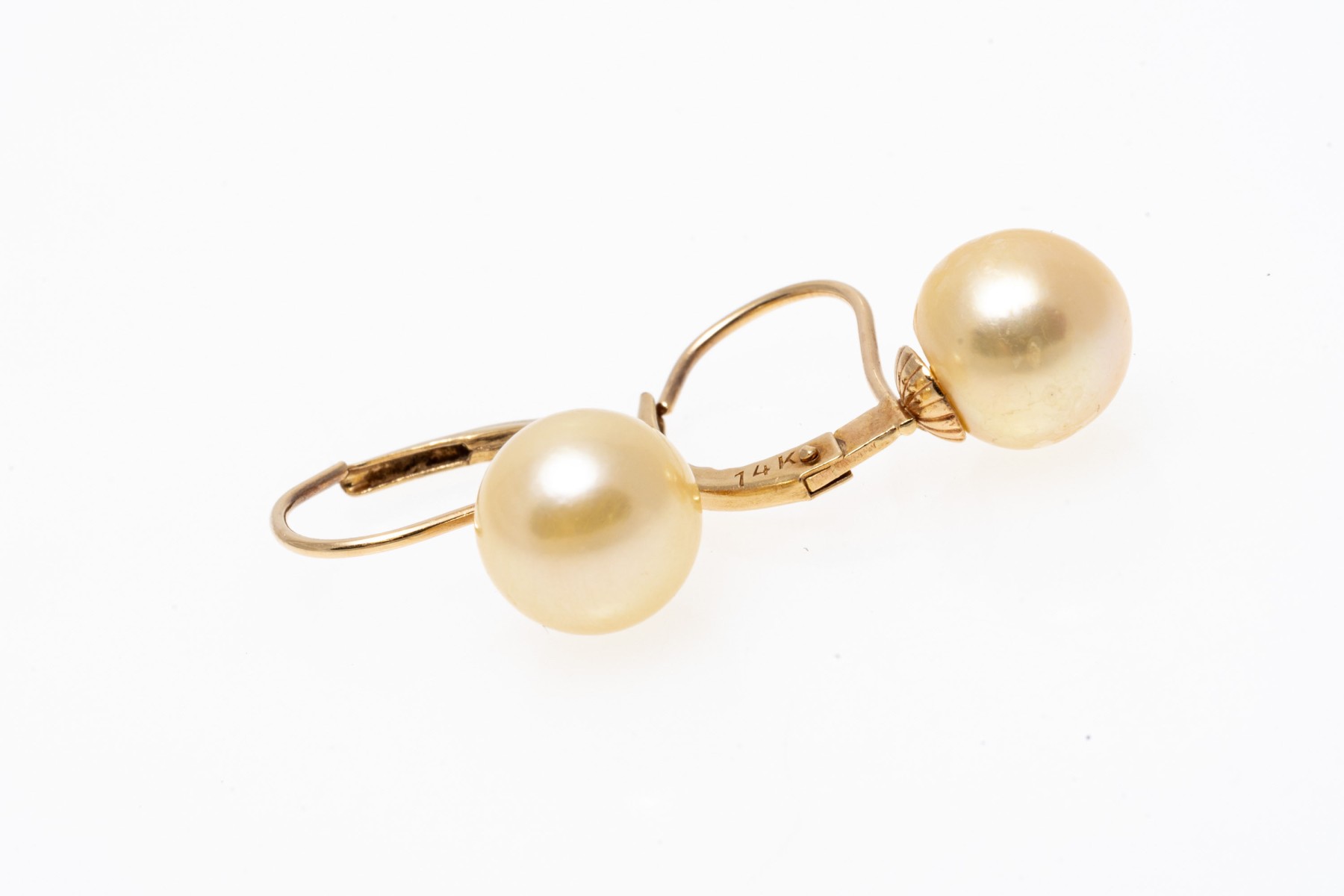 14k yellow gold classic 7.75 mm cultured pearl drop earrings, finished by wires with lever style backs