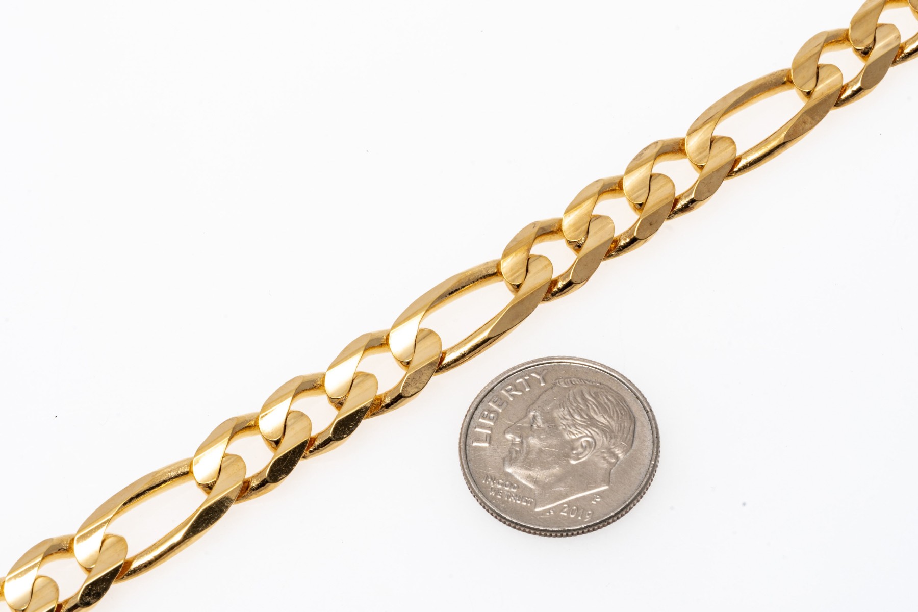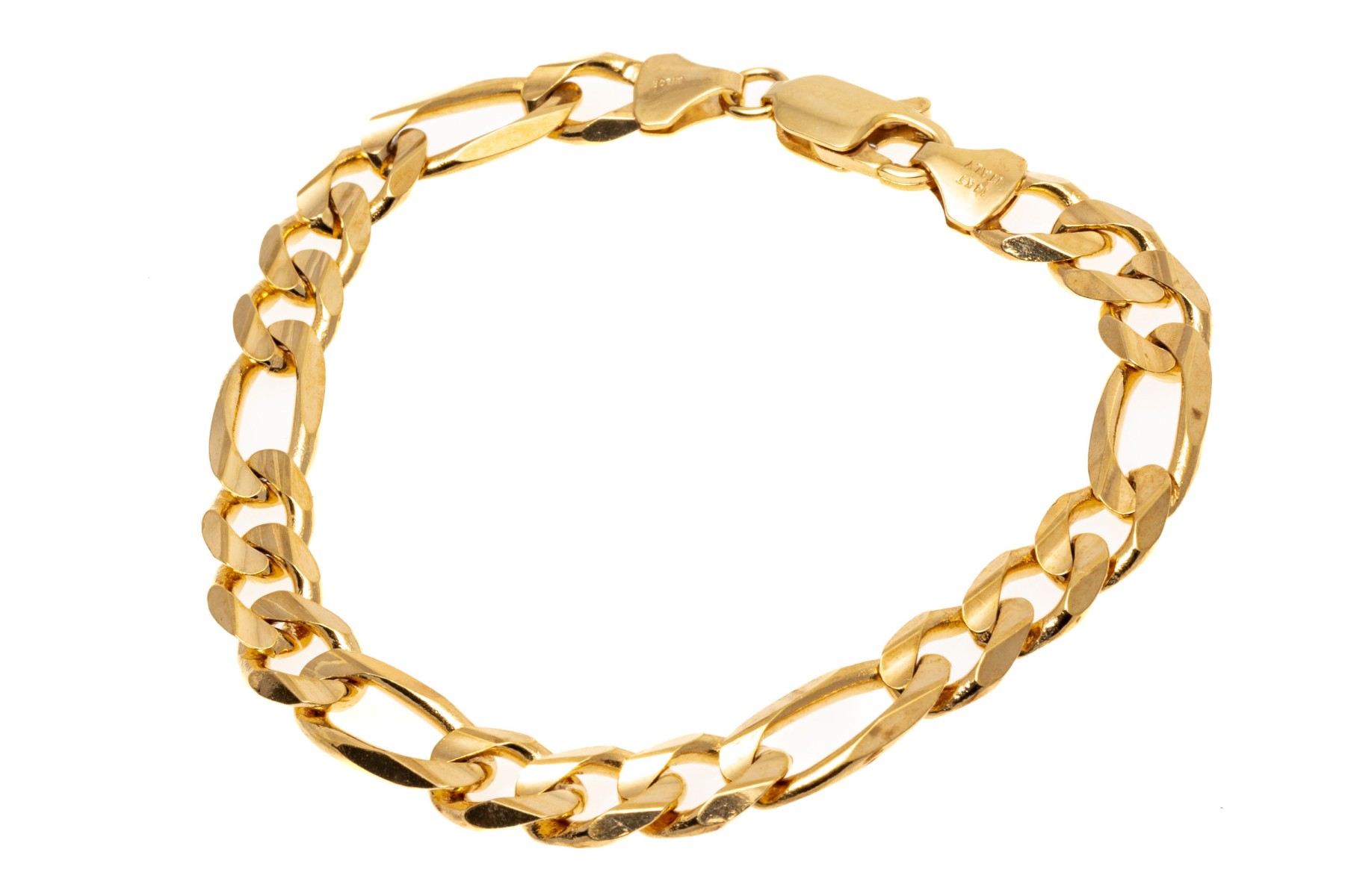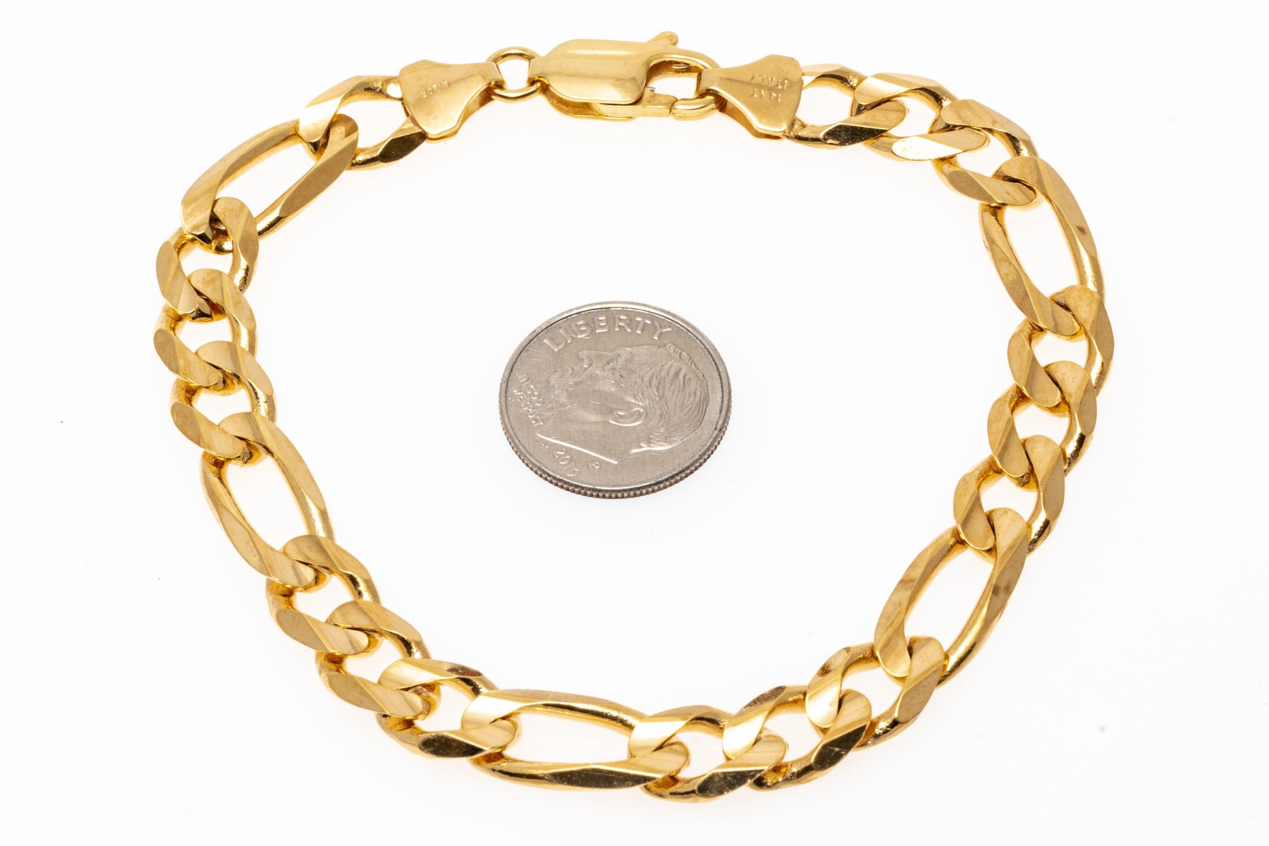 14k yellow gold classic chunky figaro style link bracelet, high polished. The bracelet is finished with a lobster claw style clasp