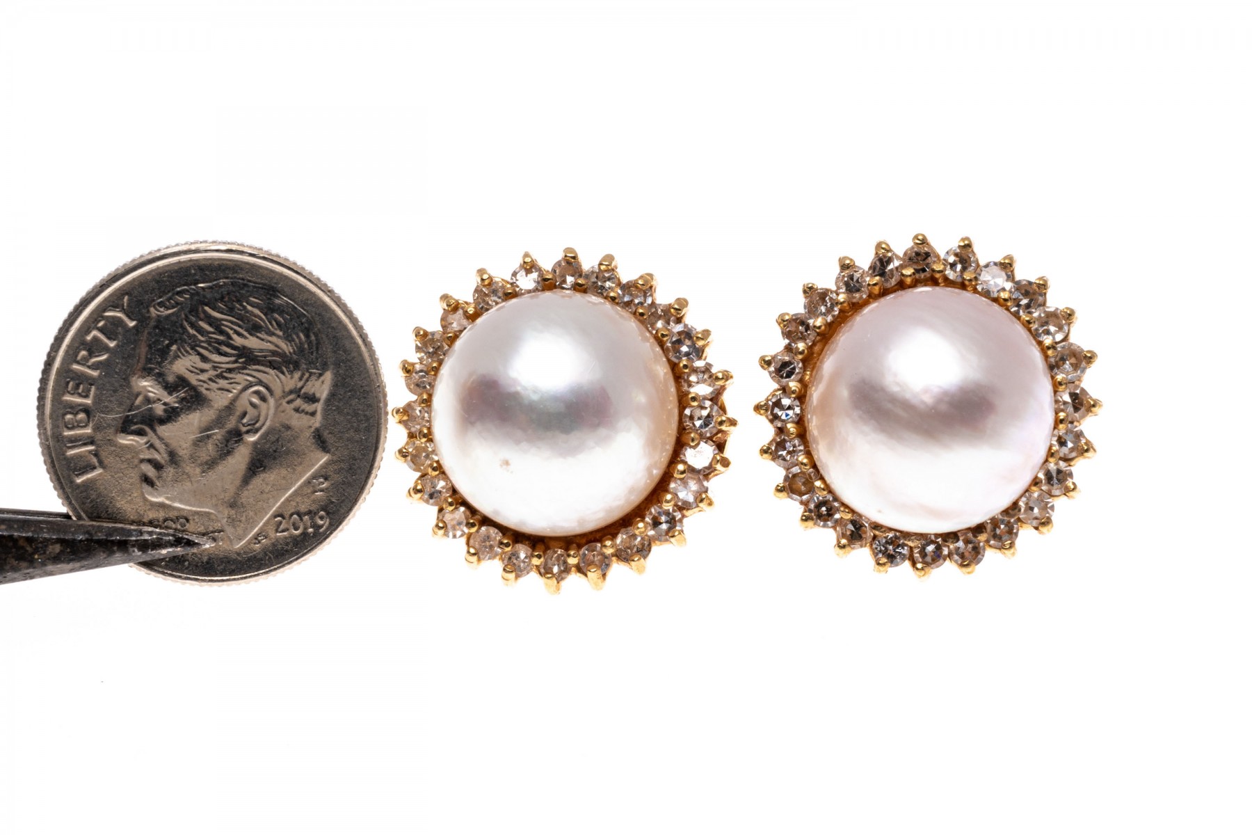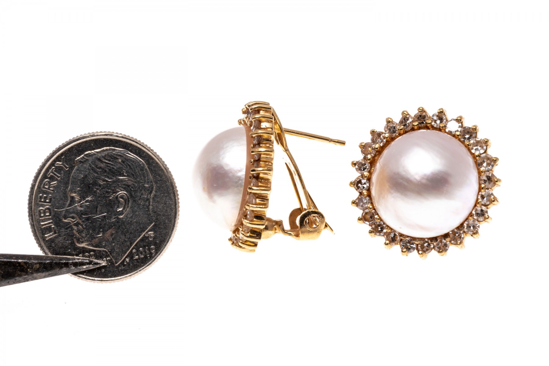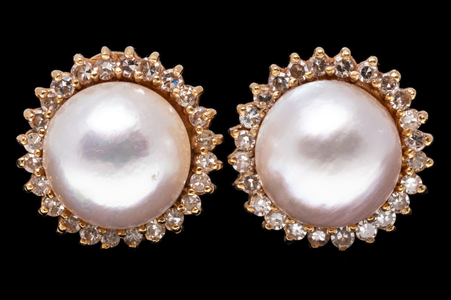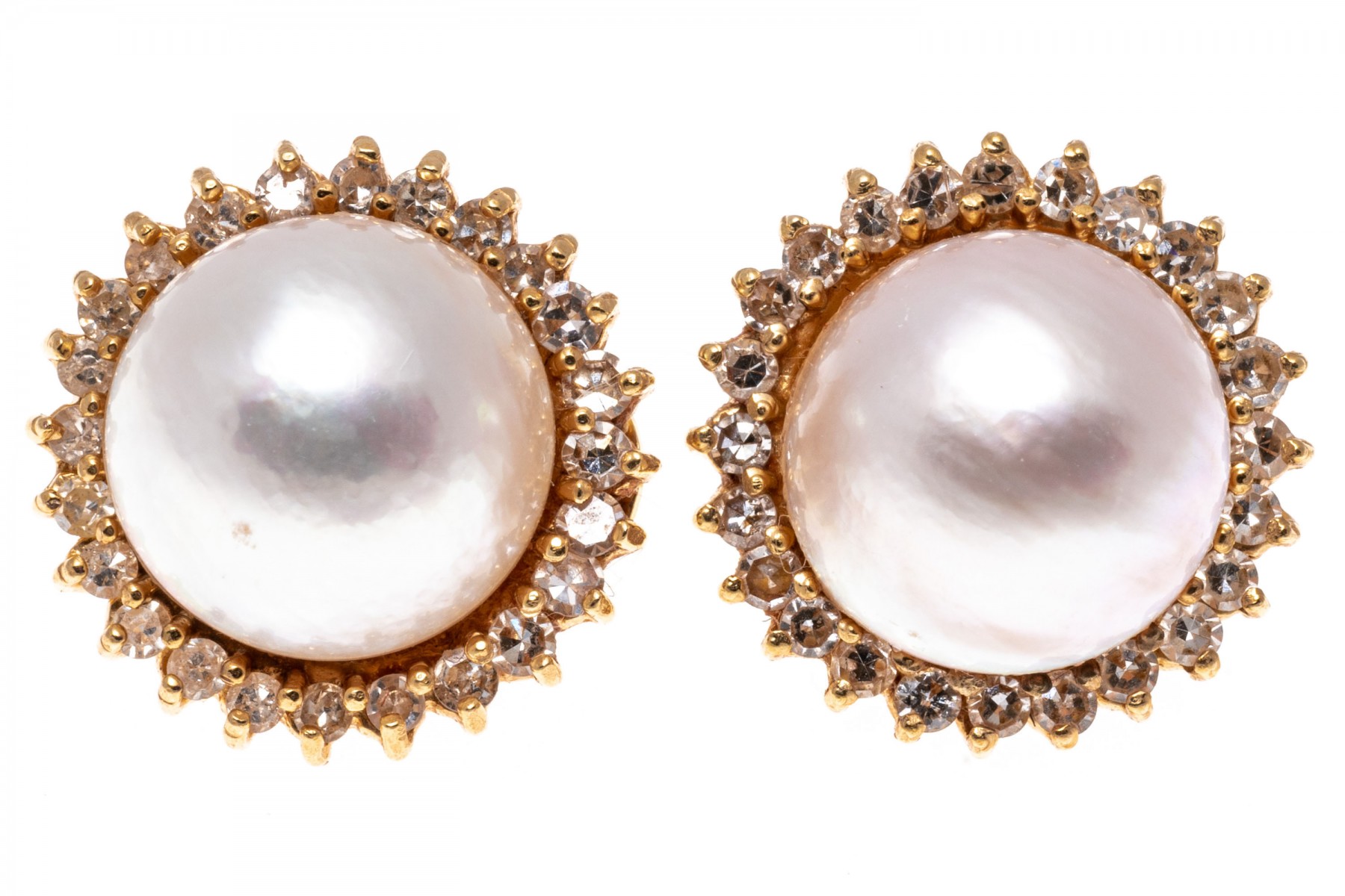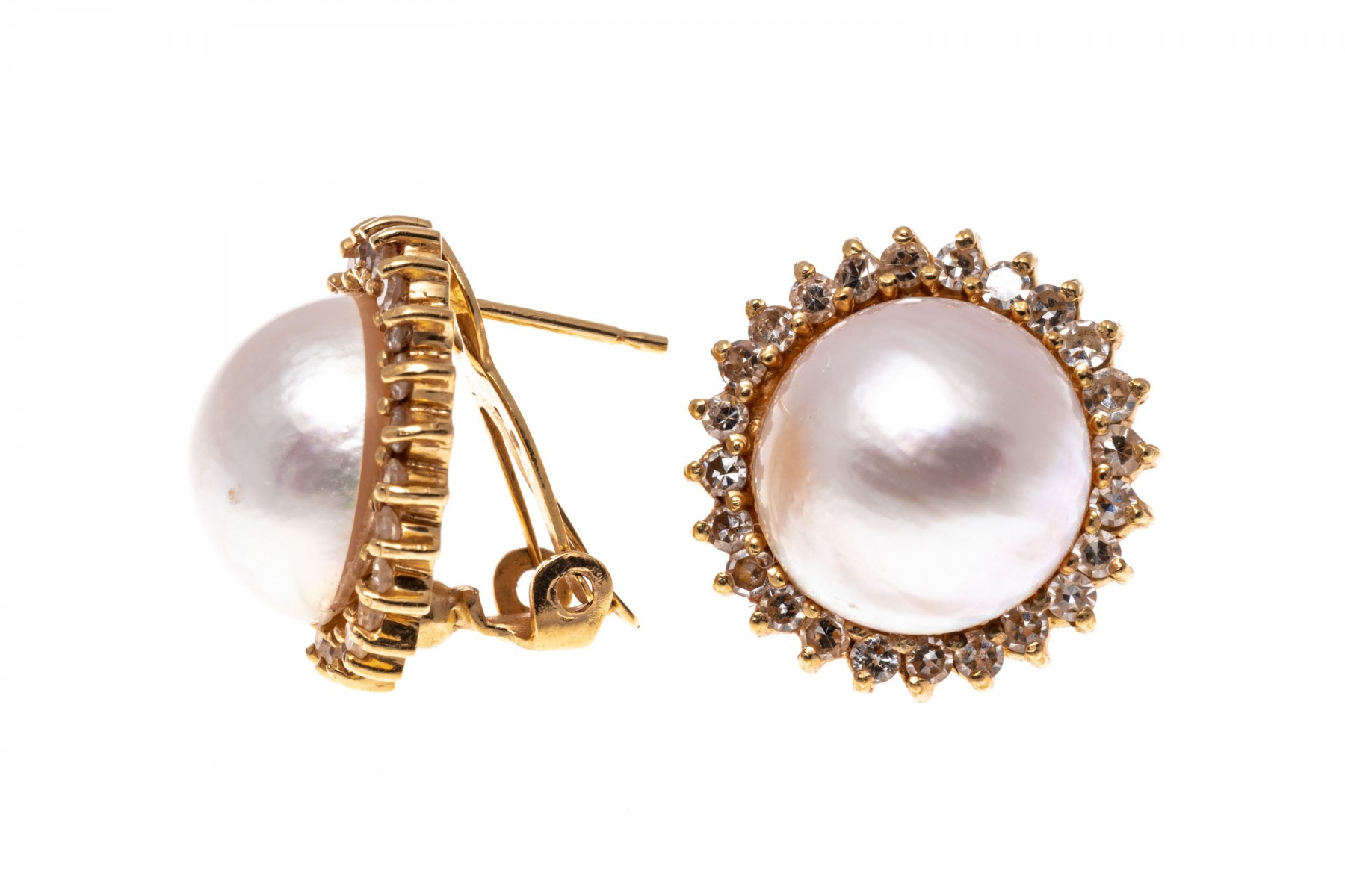 14k yellow gold earrings. These classic earrings are cultured, white color mabe pearls, decorated with a border of round faceted diamonds, prong set, approximately 0.72 TCW. The earrings have posts, with omega style backs.