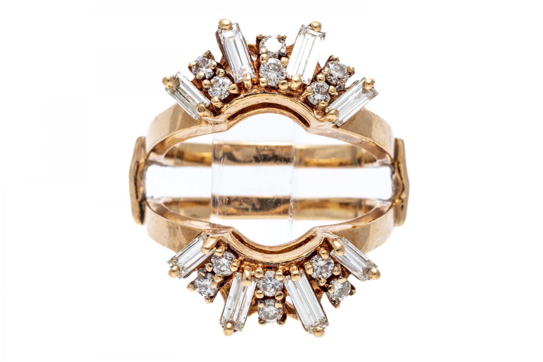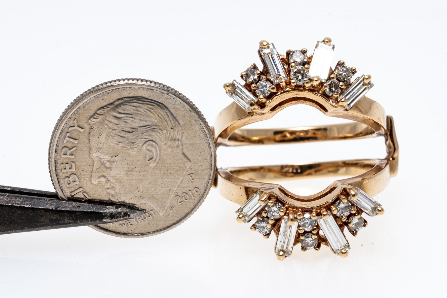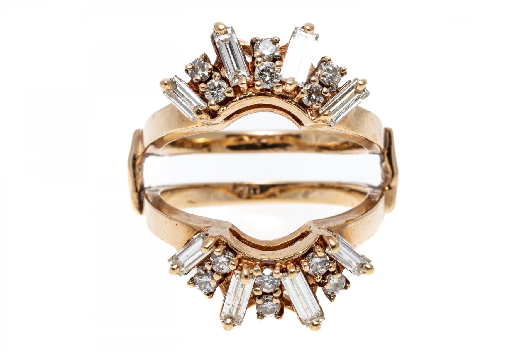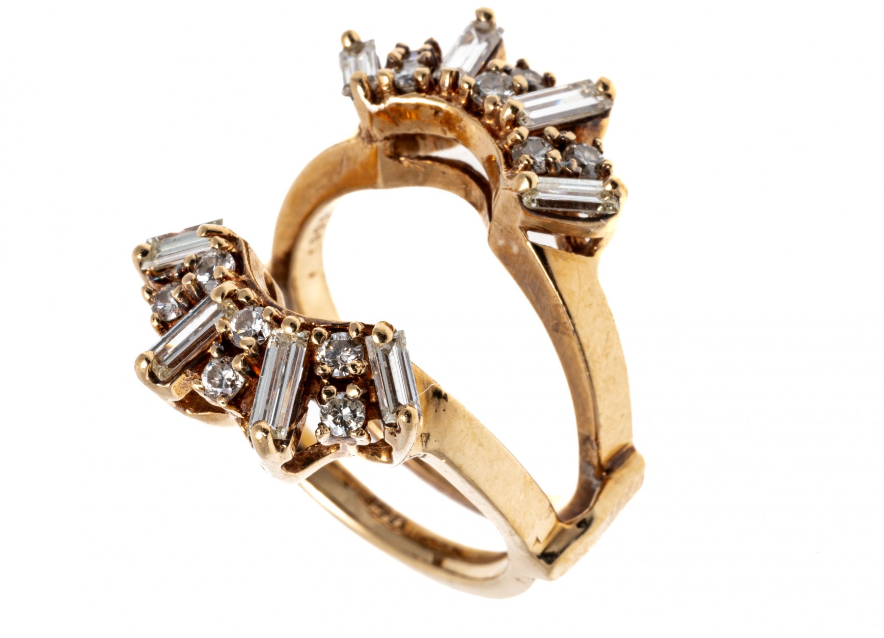 14k yellow gold ring. This classic yellow gold ring is a guard style, set with baguette cut diamonds, approximately 0.26 TCW and decorated with alternating round faceted diamonds, approximately 0.21 TCW, prong set.