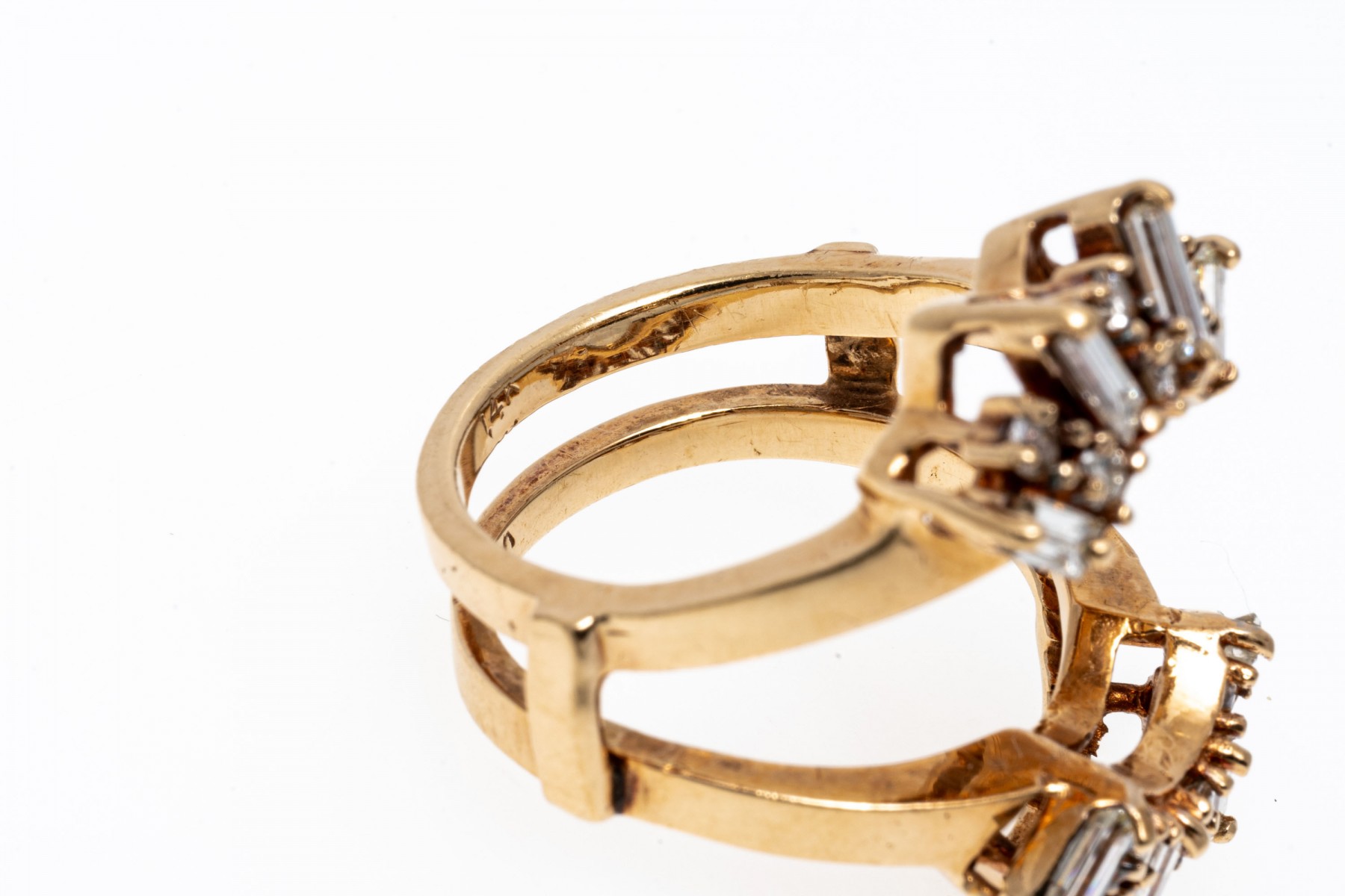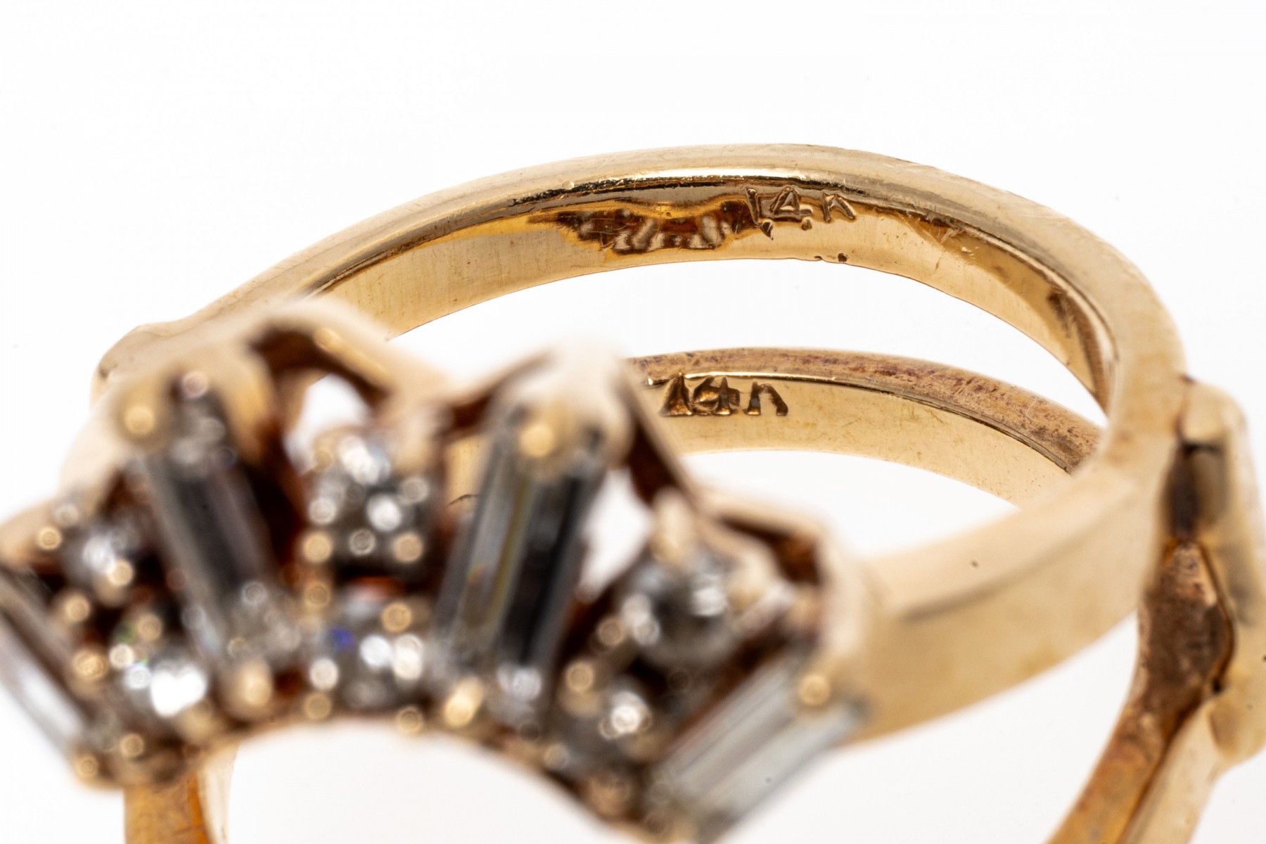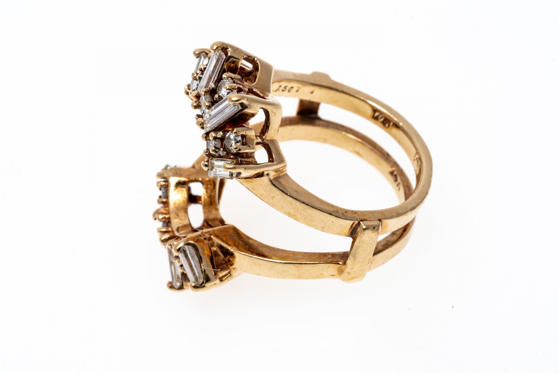 14k yellow gold ring. This classic yellow gold ring is a guard style, set with baguette cut diamonds, approximately 0.26 TCW and decorated with alternating round faceted diamonds, approximately 0.21 TCW, prong set.