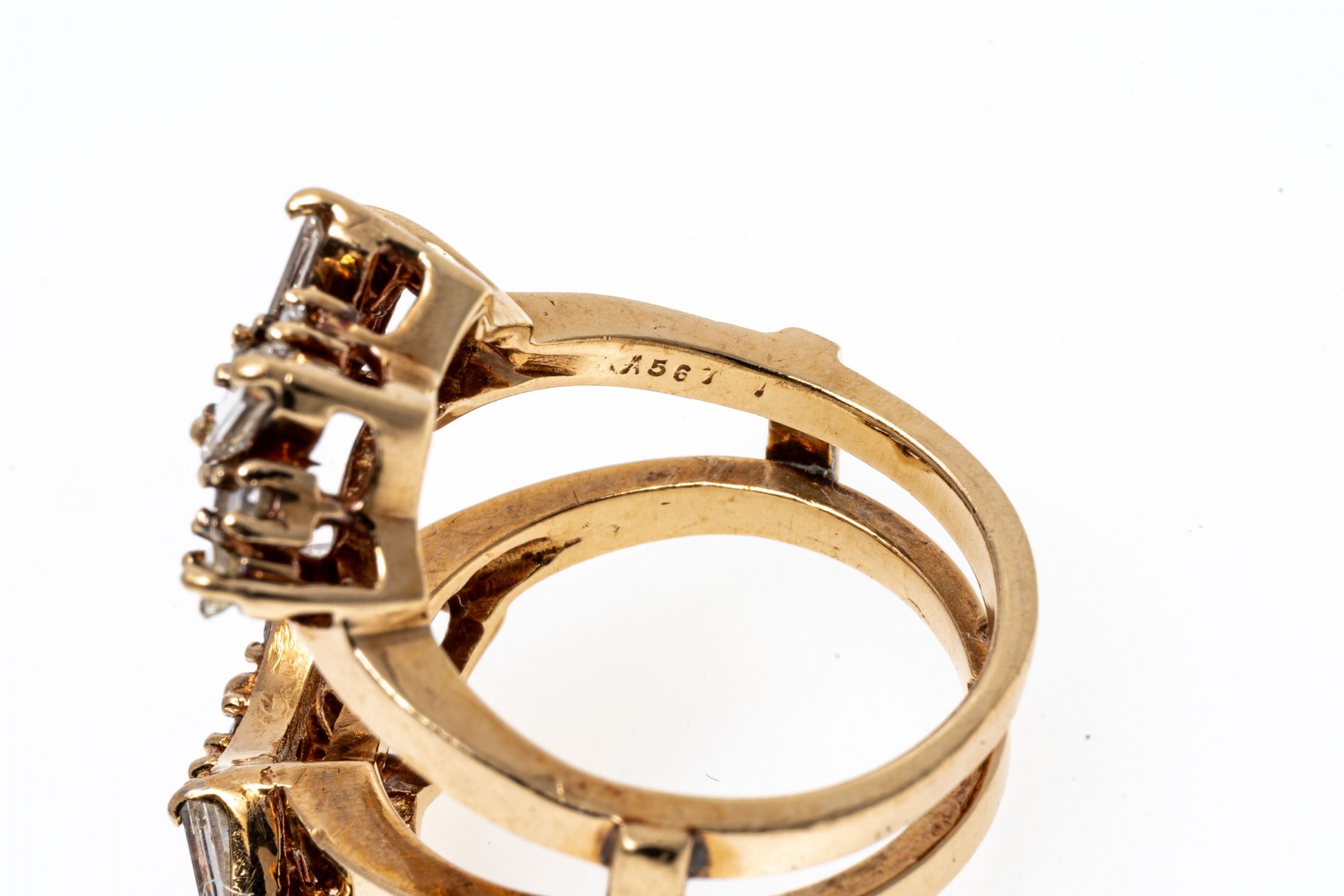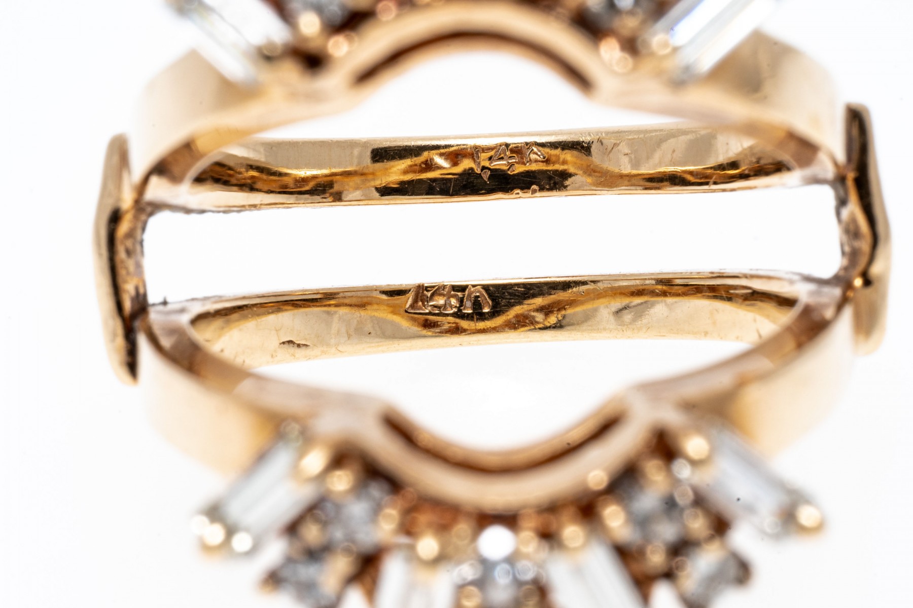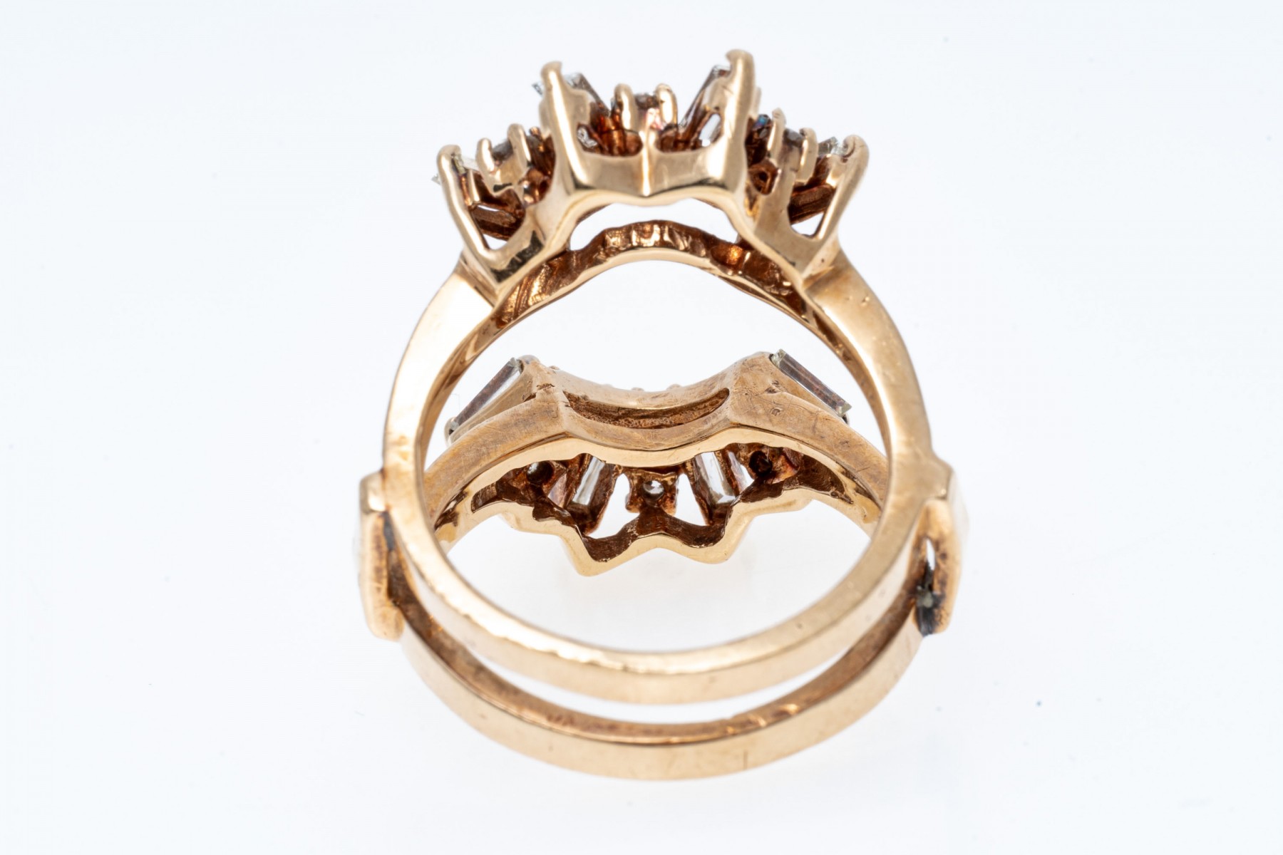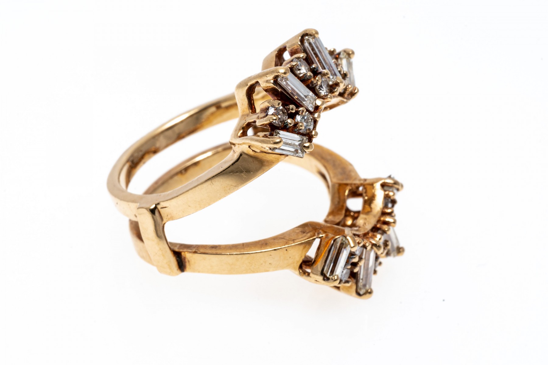14k yellow gold ring. This classic yellow gold ring is a guard style, set with baguette cut diamonds, approximately 0.26 TCW and decorated with alternating round faceted diamonds, approximately 0.21 TCW, prong set.