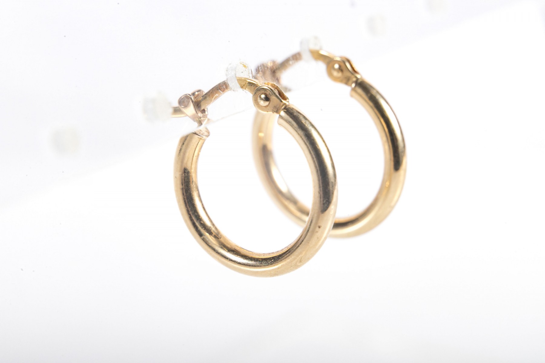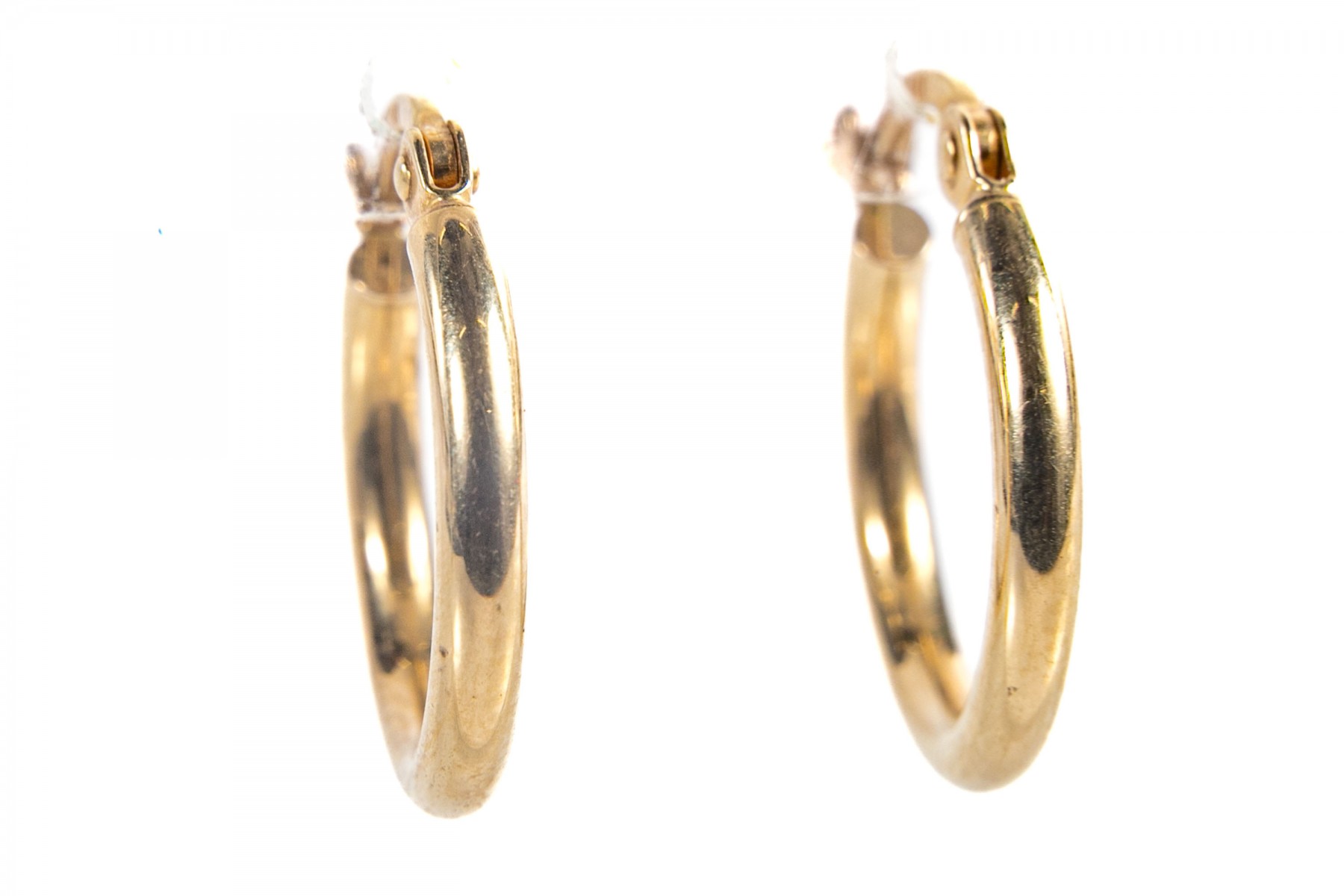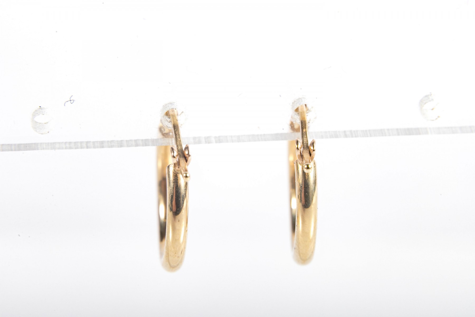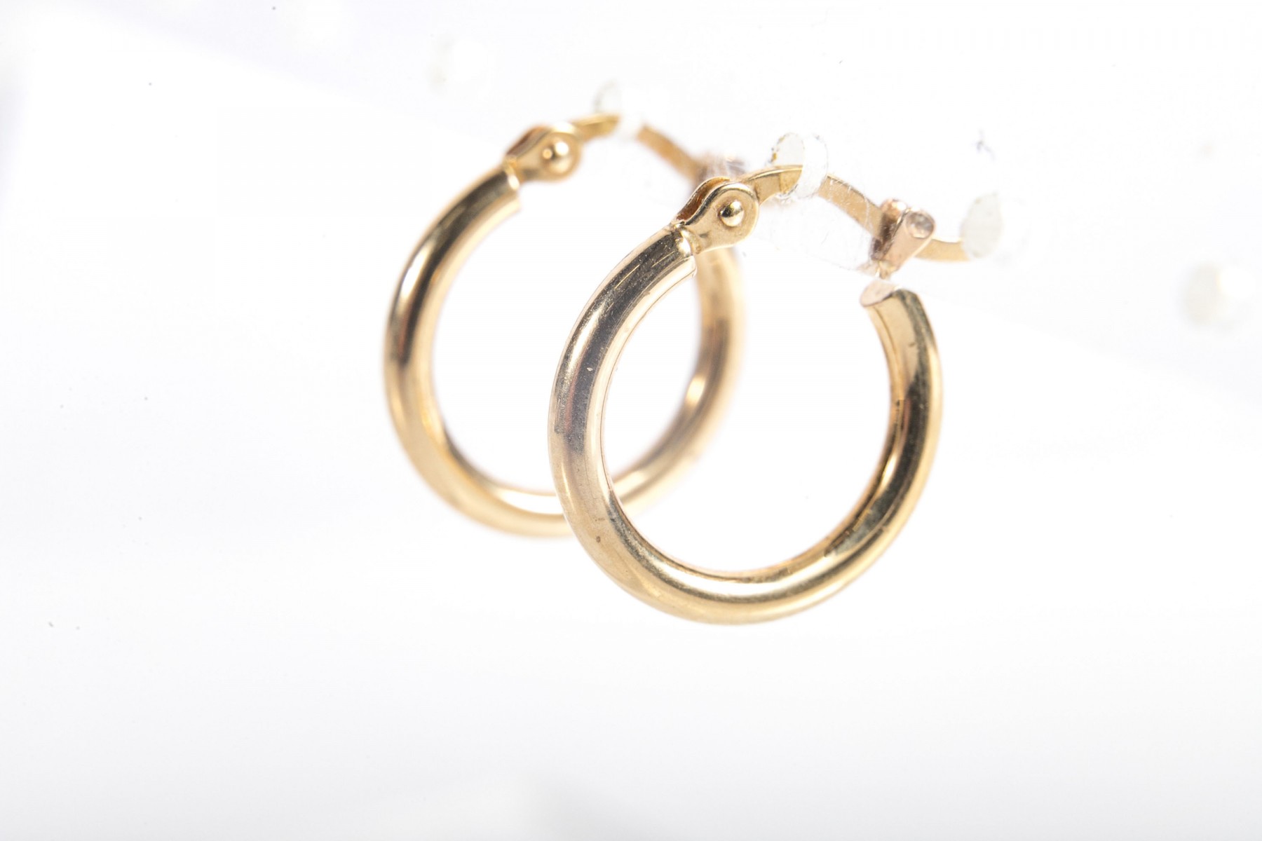 A pair of classic yellow gold huggie hoop earrings in a sleek and simple design.