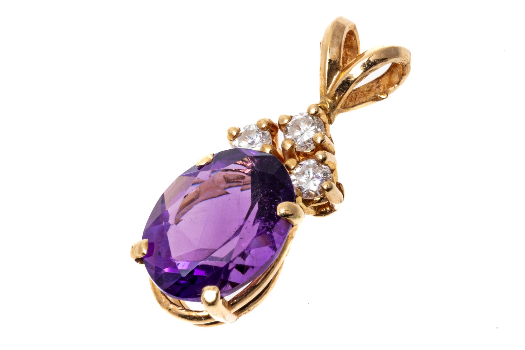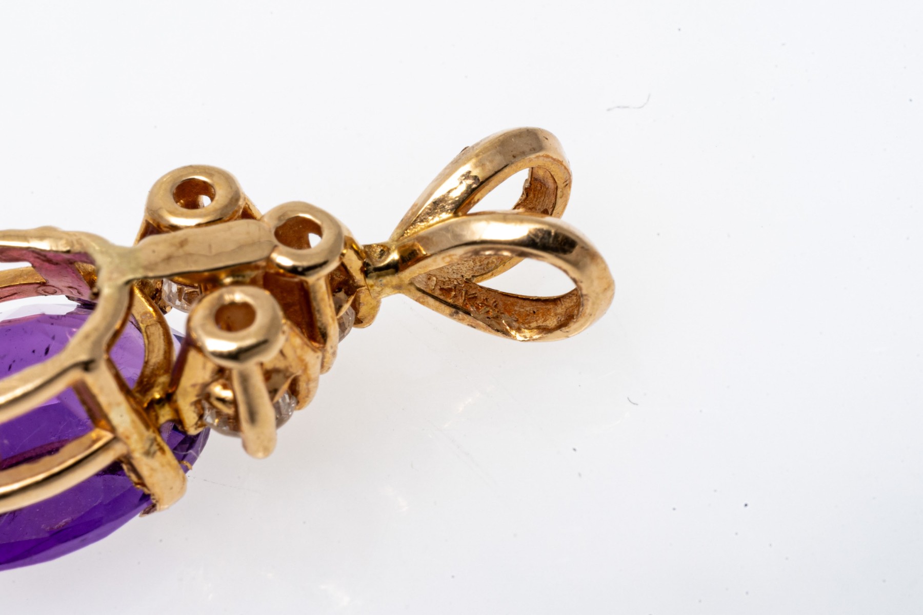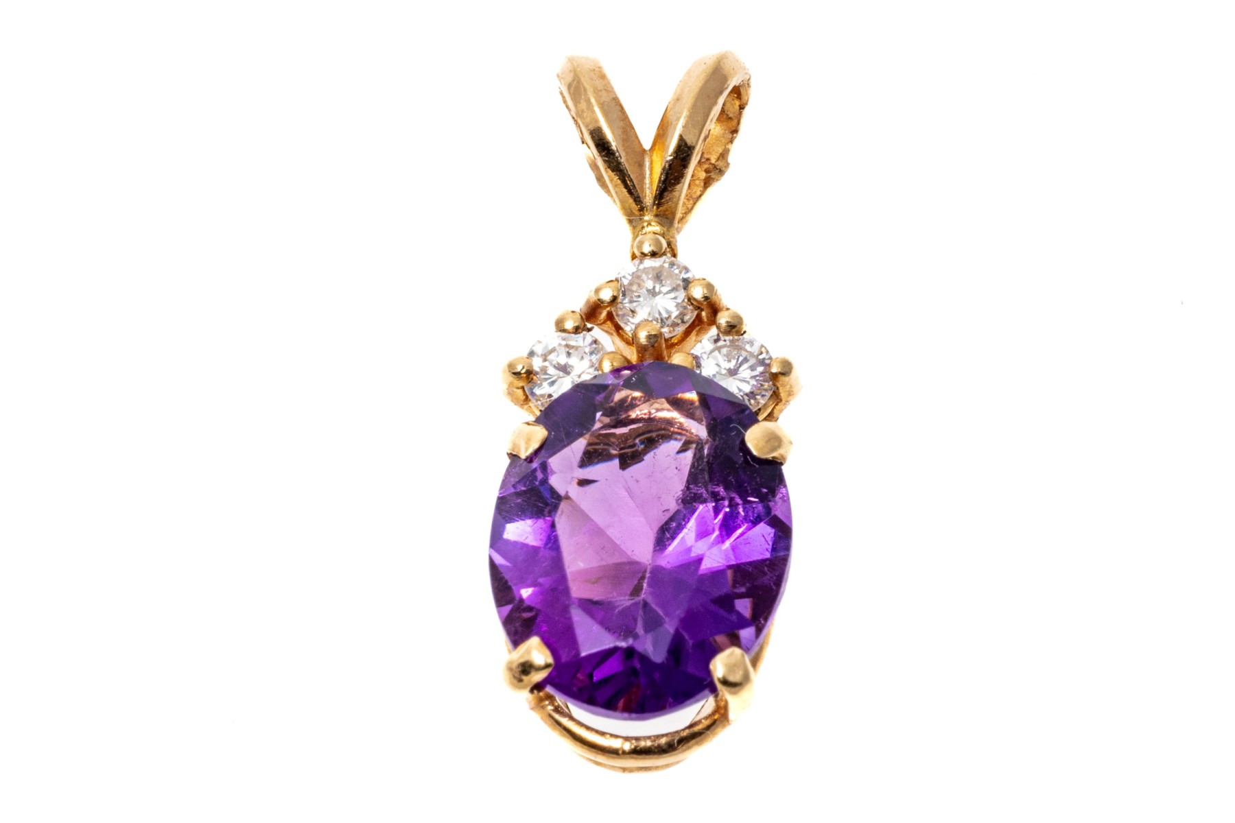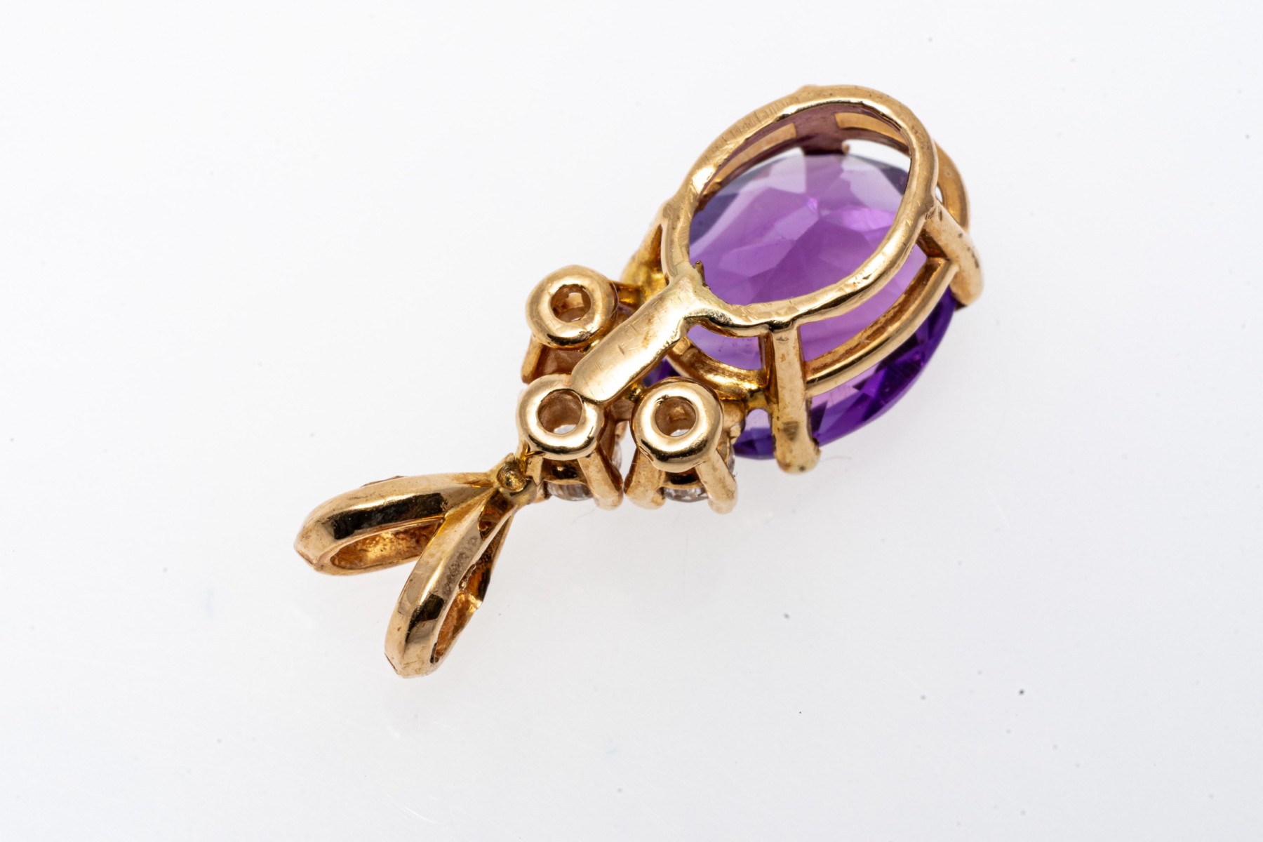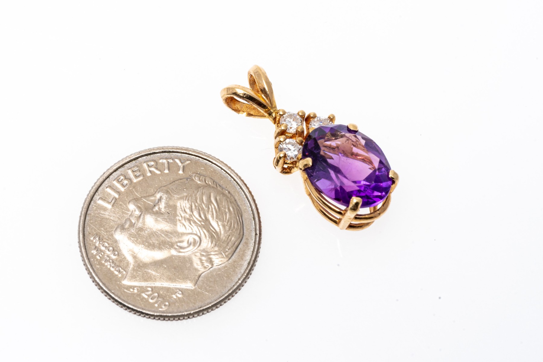 14k Yellow Gold Classic Oval Amethyst And Diamond Topped Pendant. This handsome pendant has an oval faceted center, app. 1.99 CTS, prong set and is topped by round faceted diamonds, app. 0.12 TCW, and is finished with a rabbit ear style bale