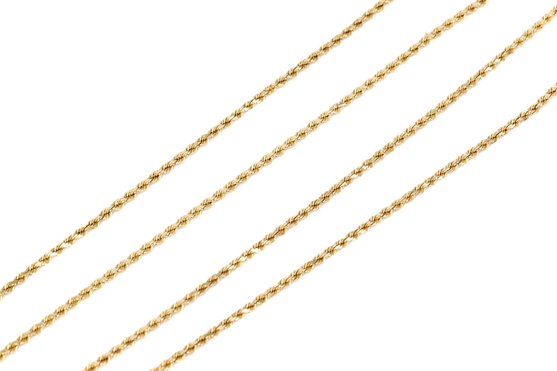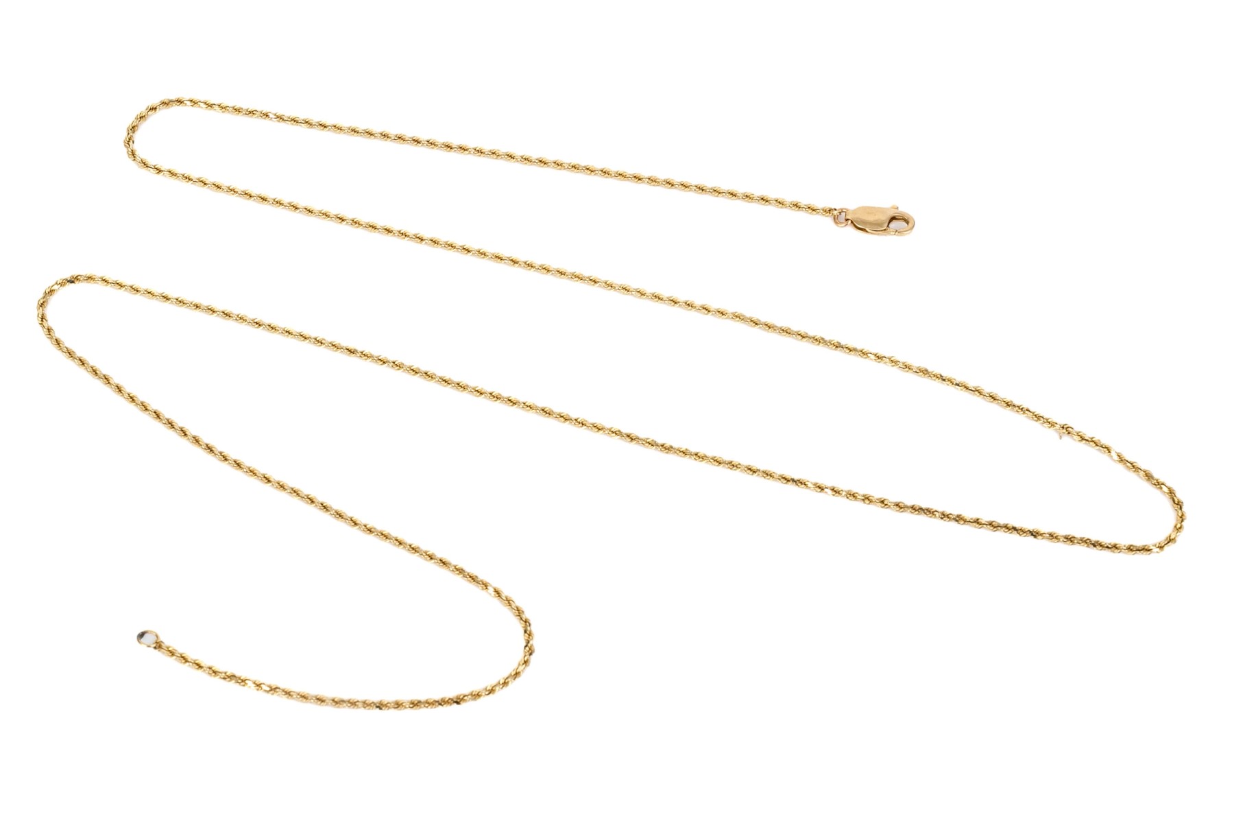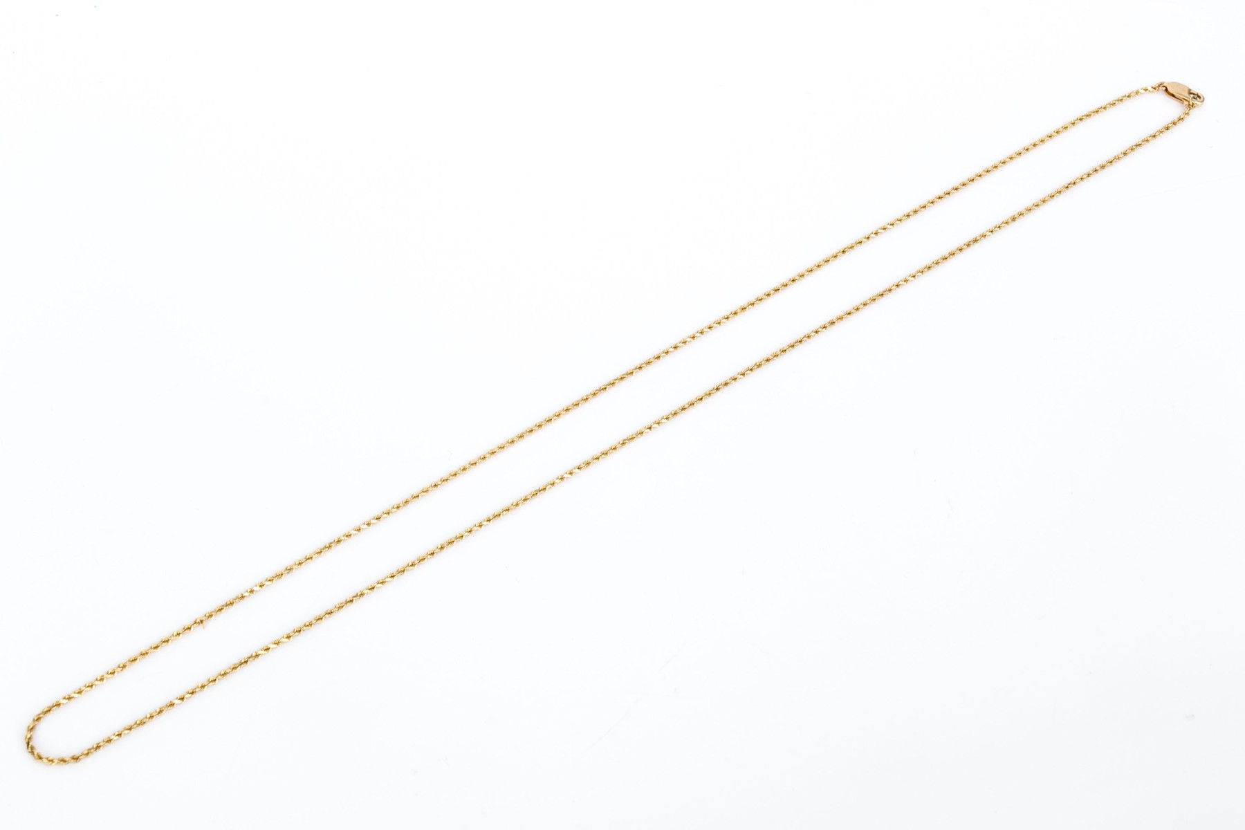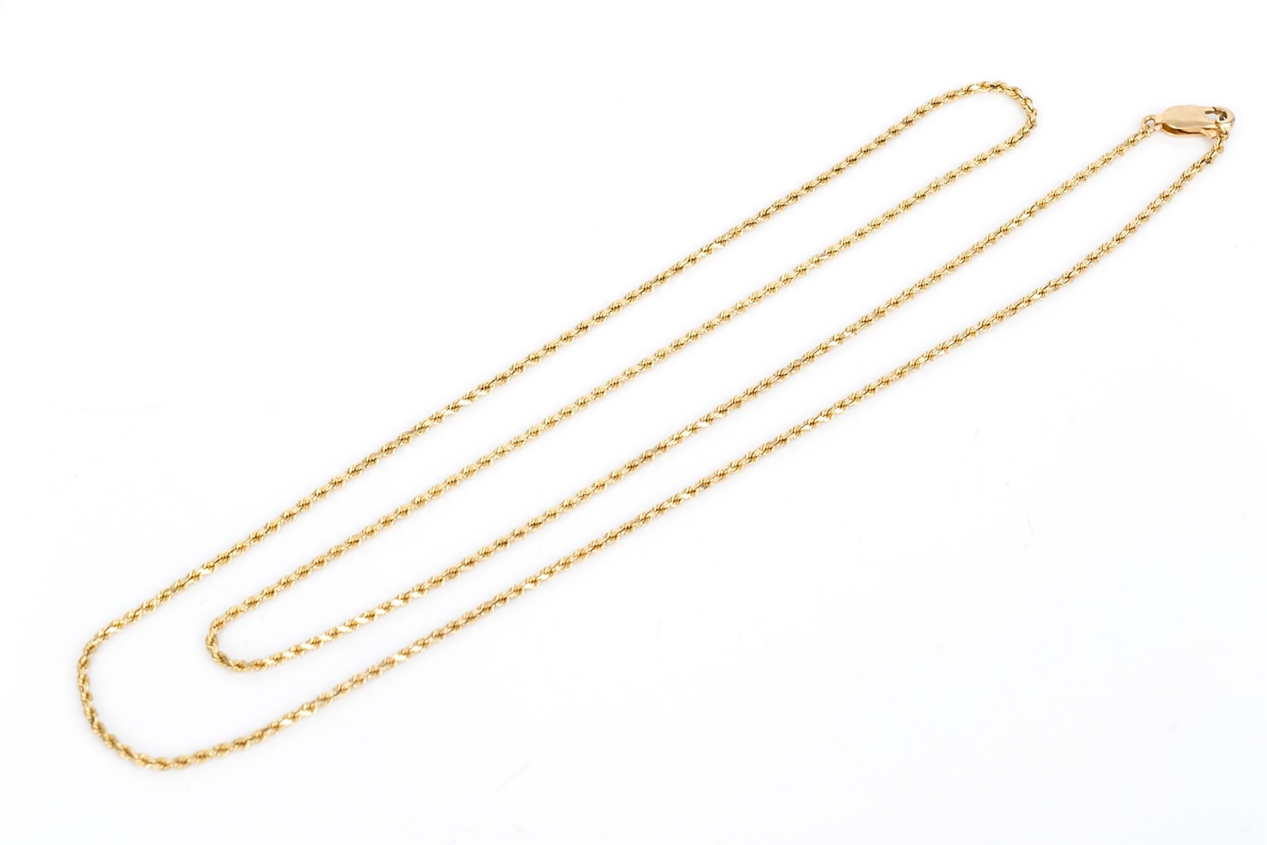 14k yellow gold classic rope link matinee length chain necklace, finished with a lobster claw style clasp