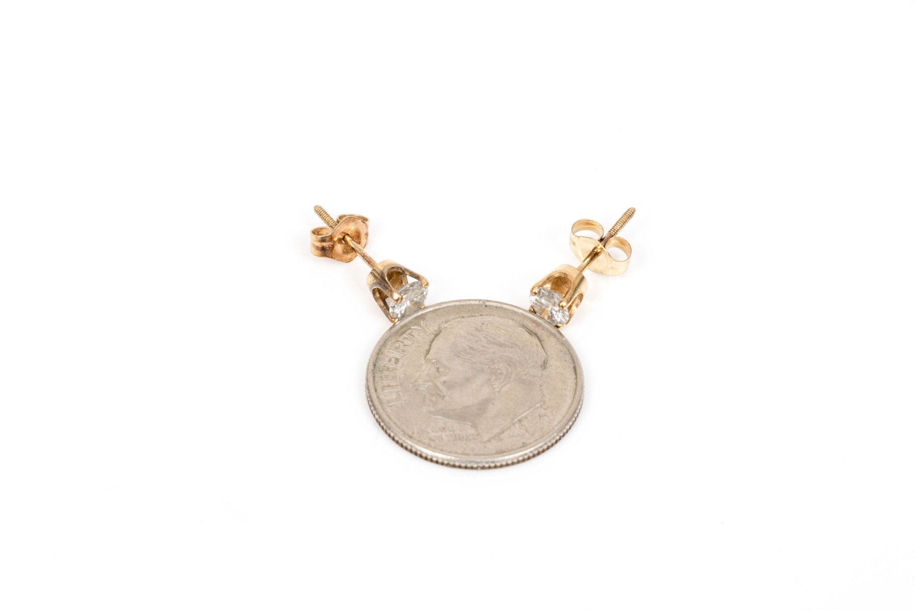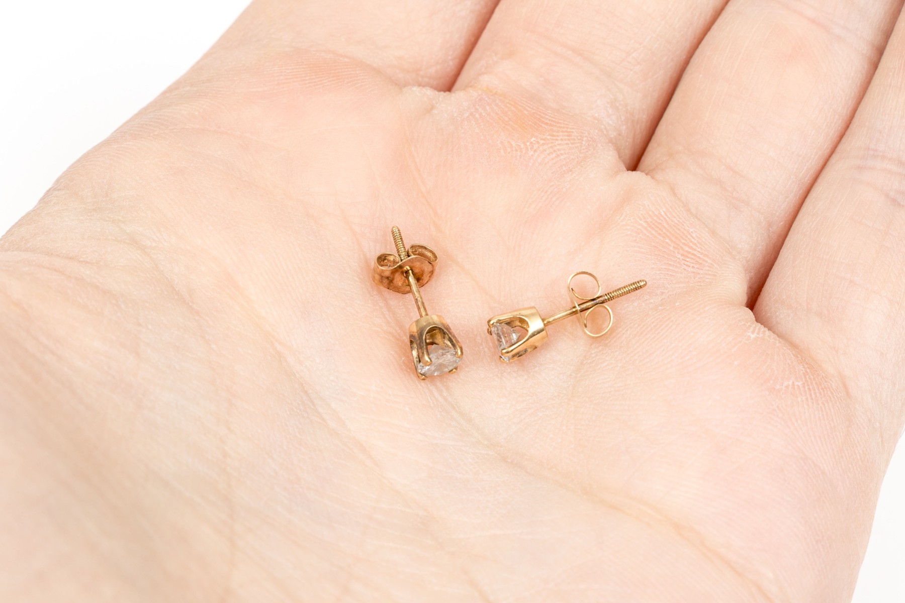 14k yellow gold classic round diamond solitaire earrings, app. 0.35 TCW, I2 clarity, K color, and mounted in four prong settings.