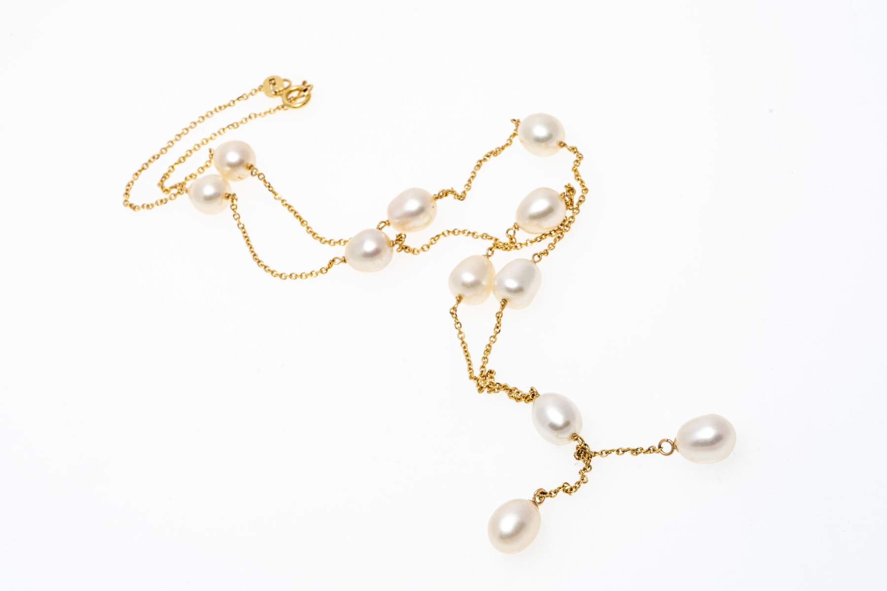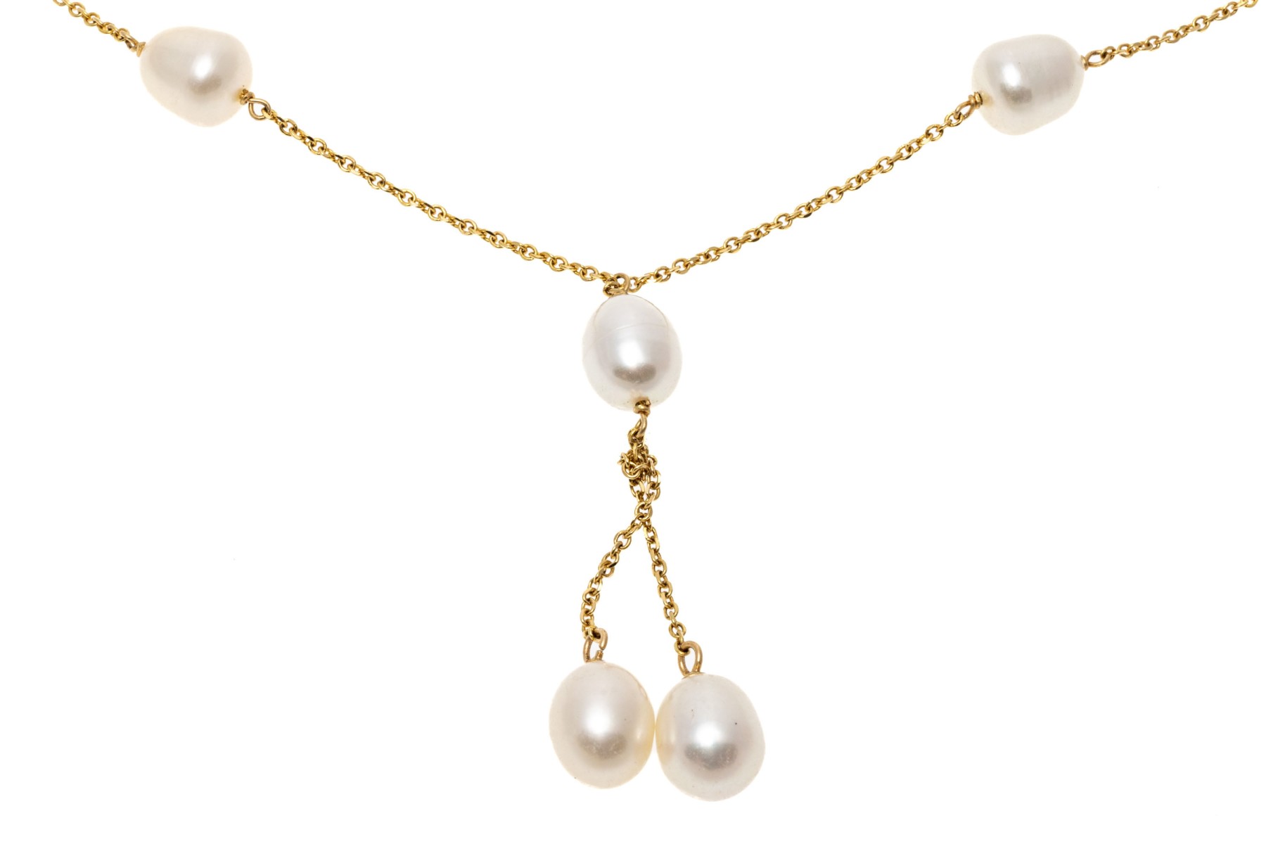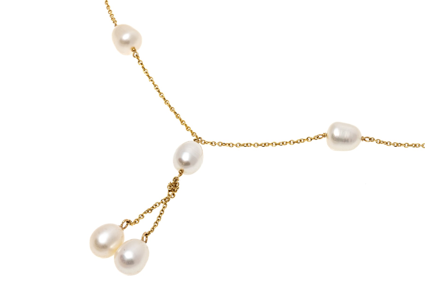 14k yellow gold classic tin cup style "y" necklace, with a curb link style chain and set with cultured freshwater pearl stations, finished with a spring ring style clasp