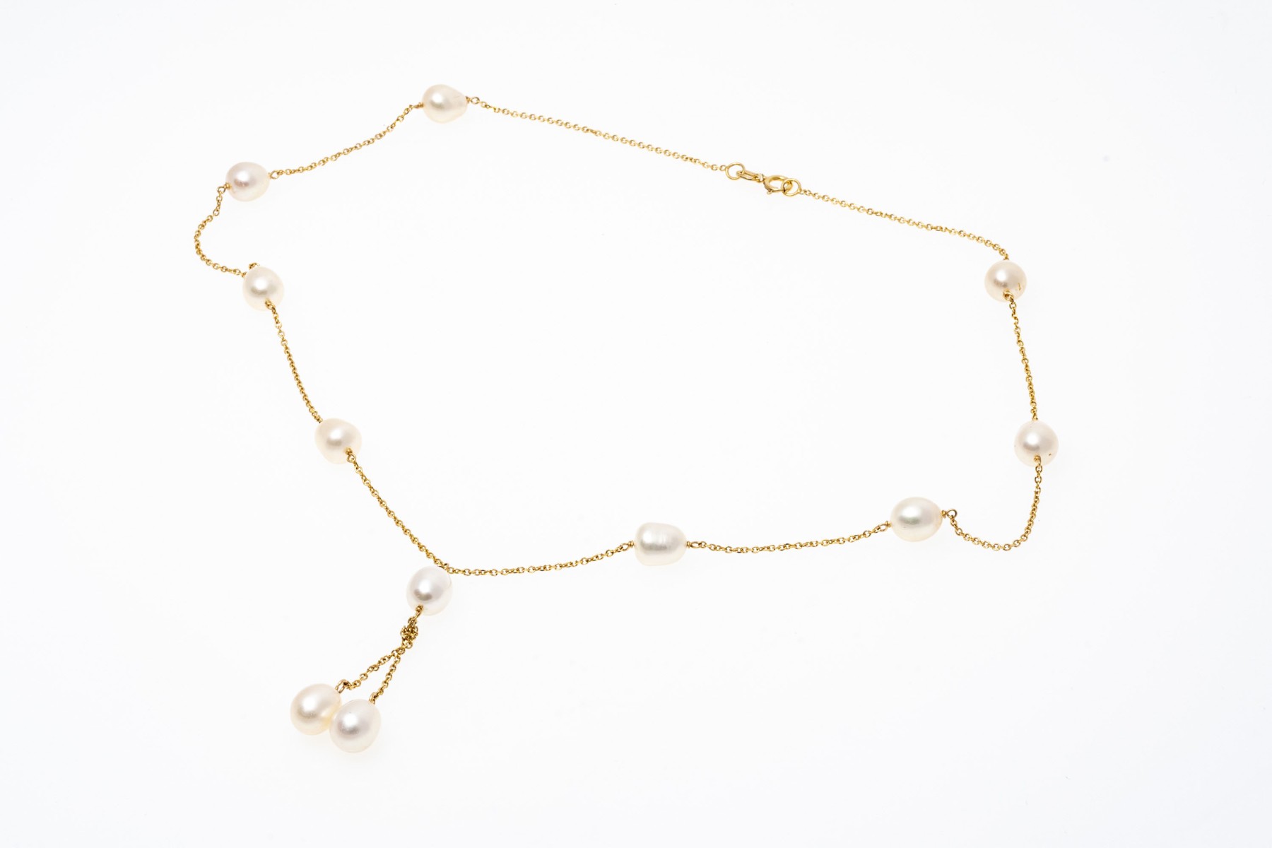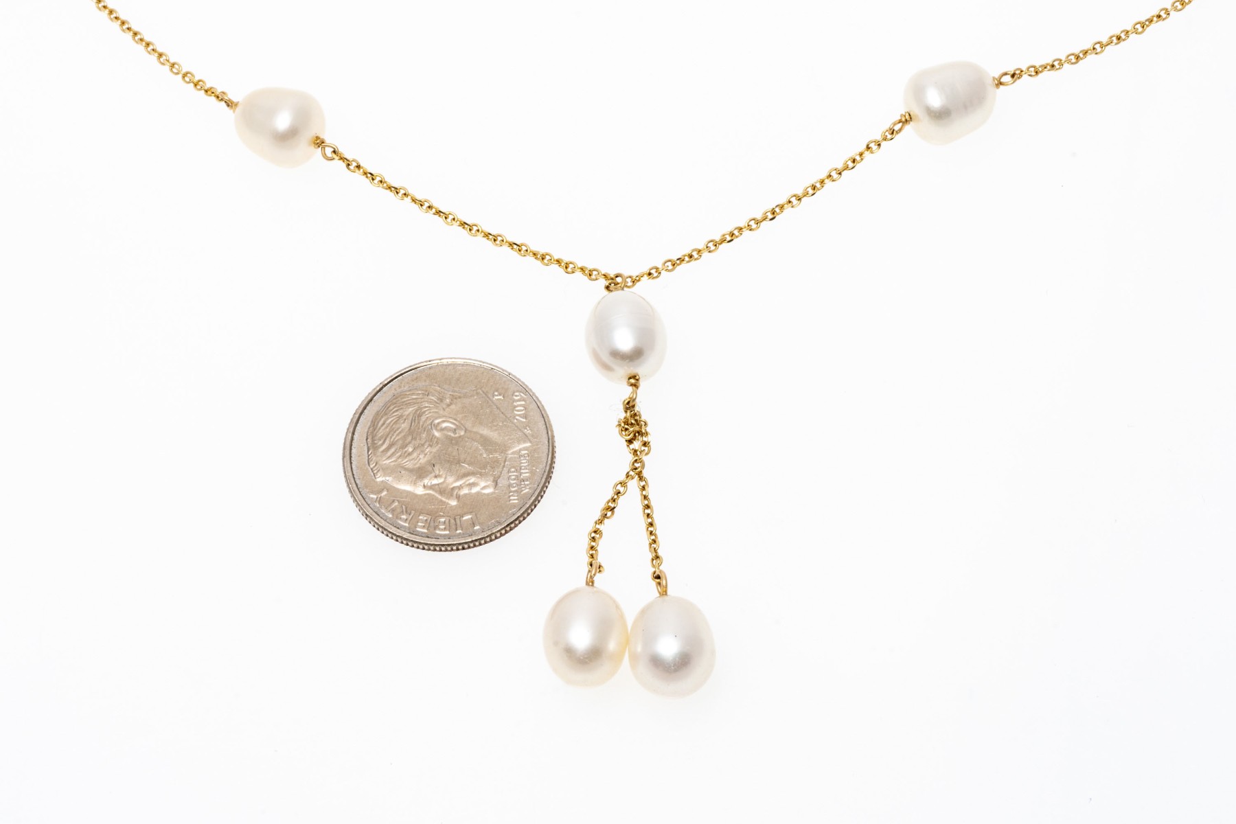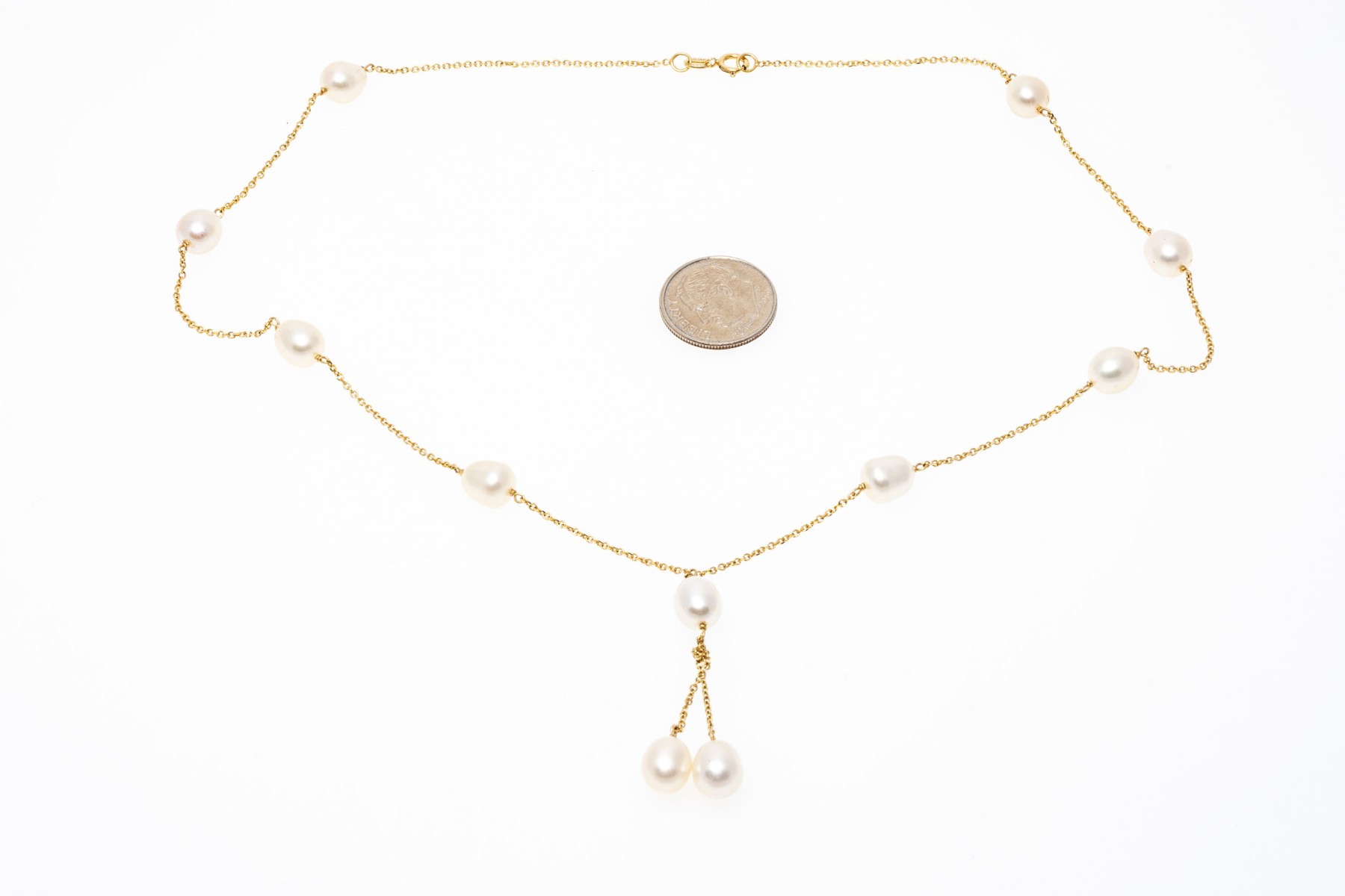 14k yellow gold classic tin cup style "y" necklace, with a curb link style chain and set with cultured freshwater pearl stations, finished with a spring ring style clasp