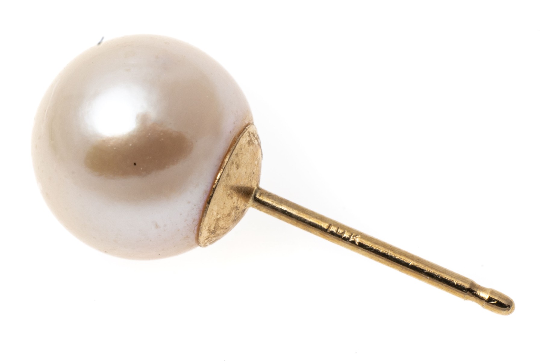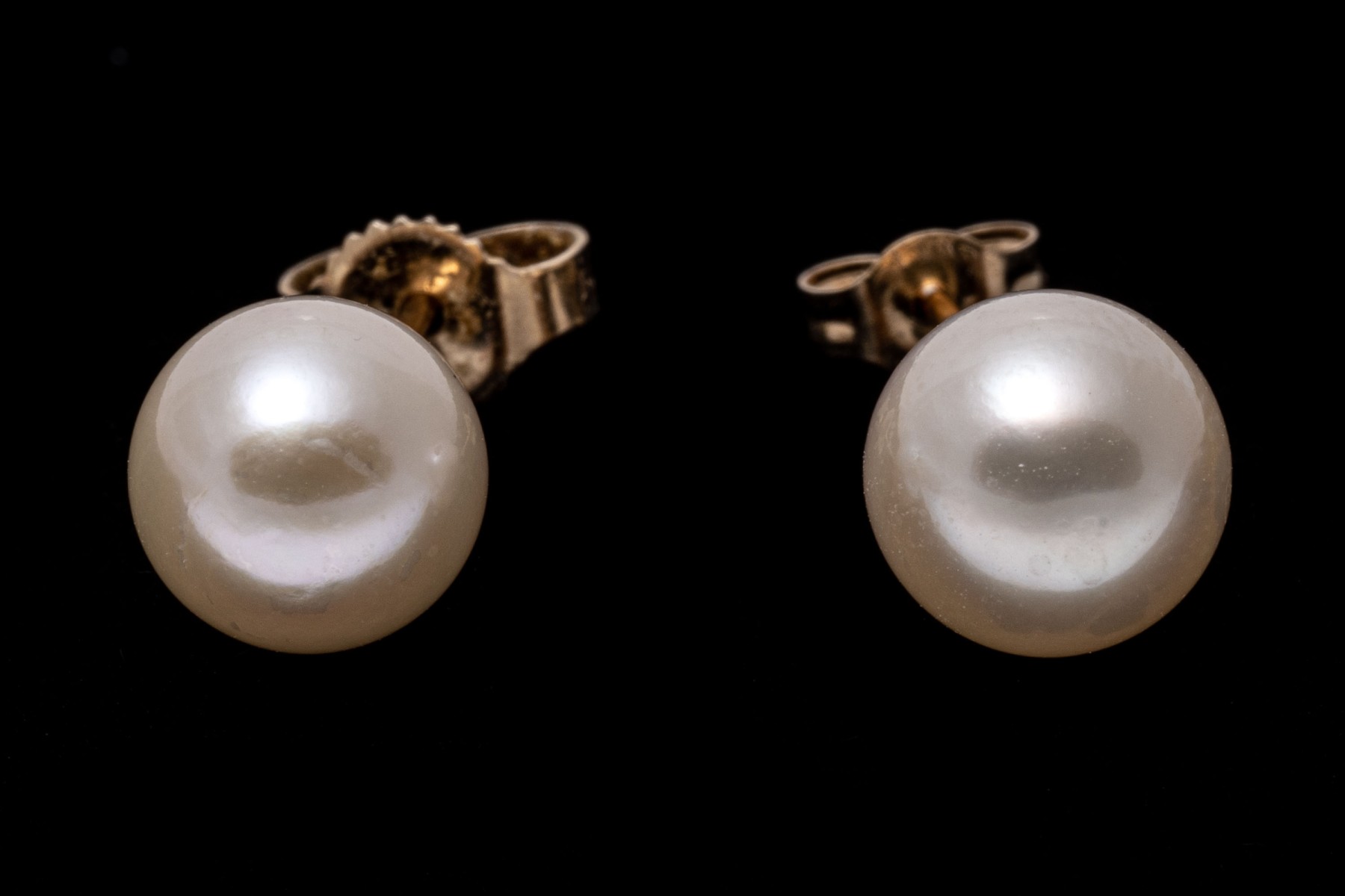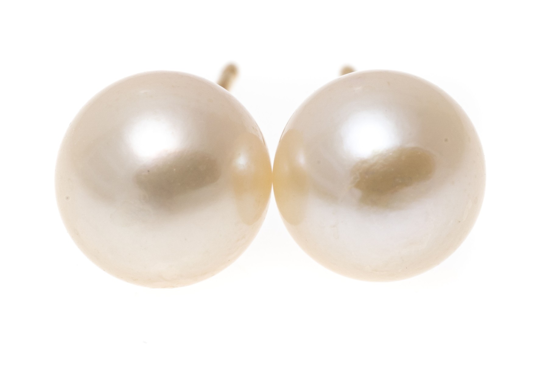 14k yellow gold earrings. This classic pair of stud earrings highlight a single, white cultured 6.7 mm pearl. The earrings have posts with clutch style backs.