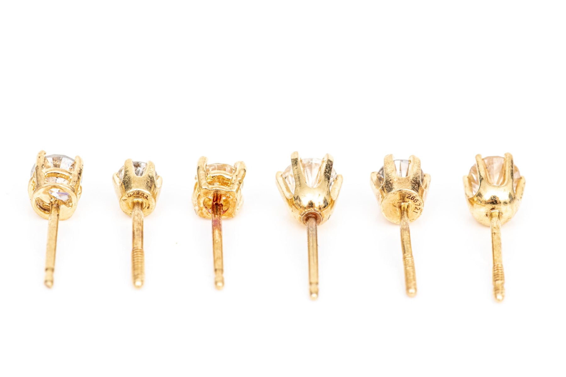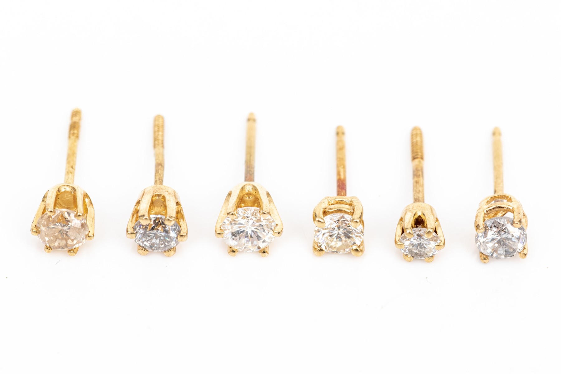 14k yellow gold collection of half pair diamond stud earrings, app. 1.00 TCW, assorted color and clarity. Please note: these are half pairs of non-matching studs (they are not pairs, they do not match)
