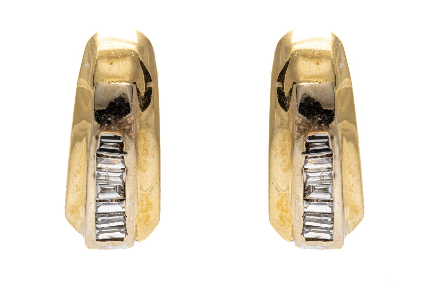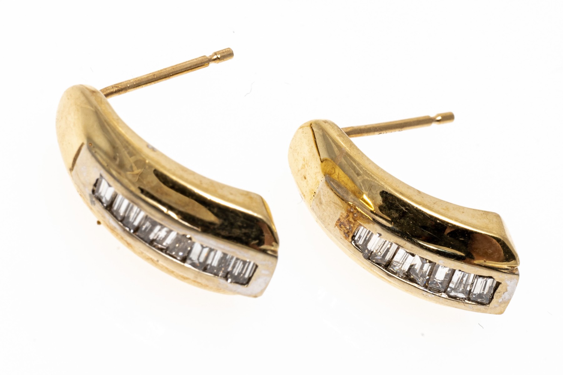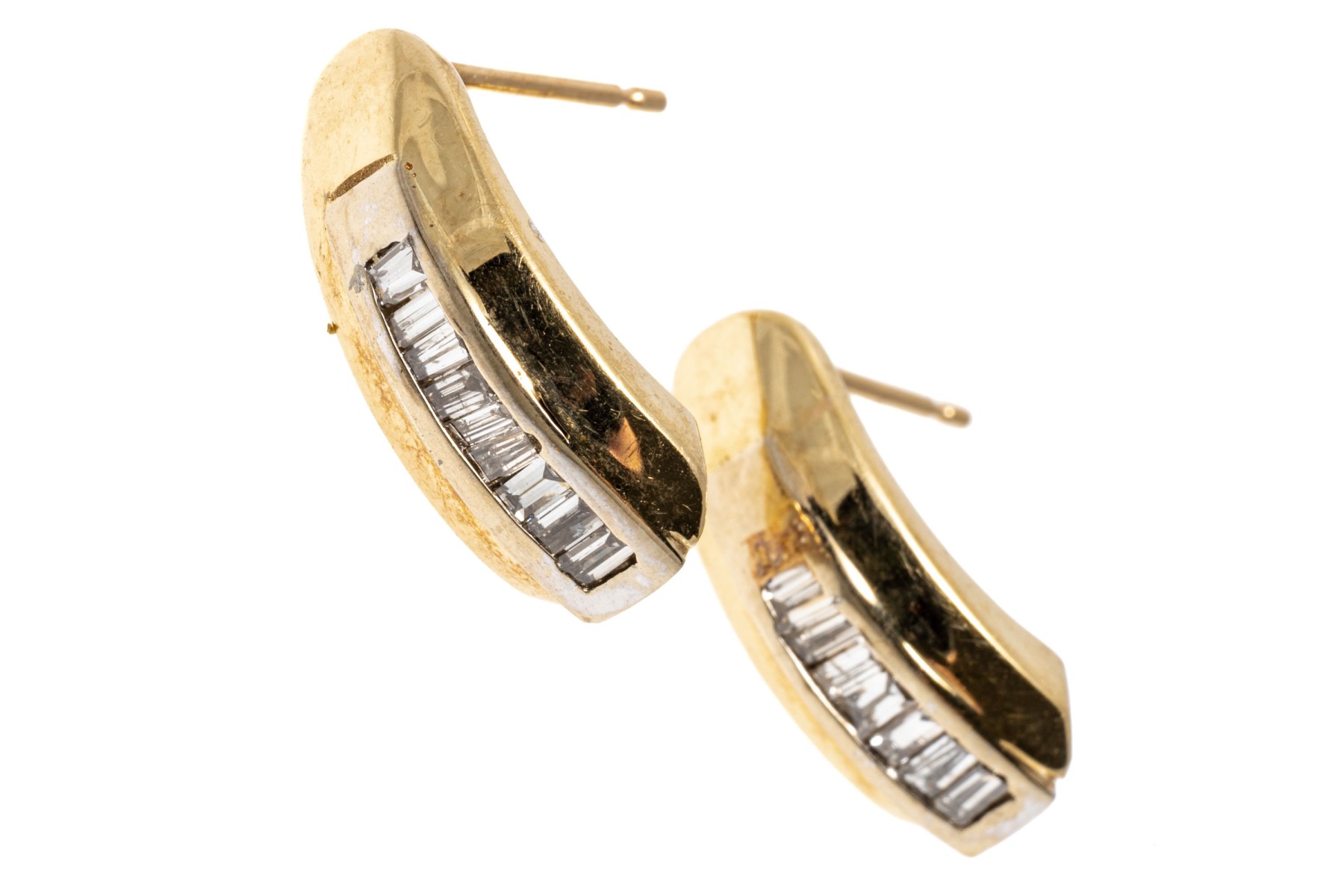 14k yellow gold contemporary baguette diamond channel set earrings, app. 0.18 TCW. The earrings have posts and clutch style backs, one missing