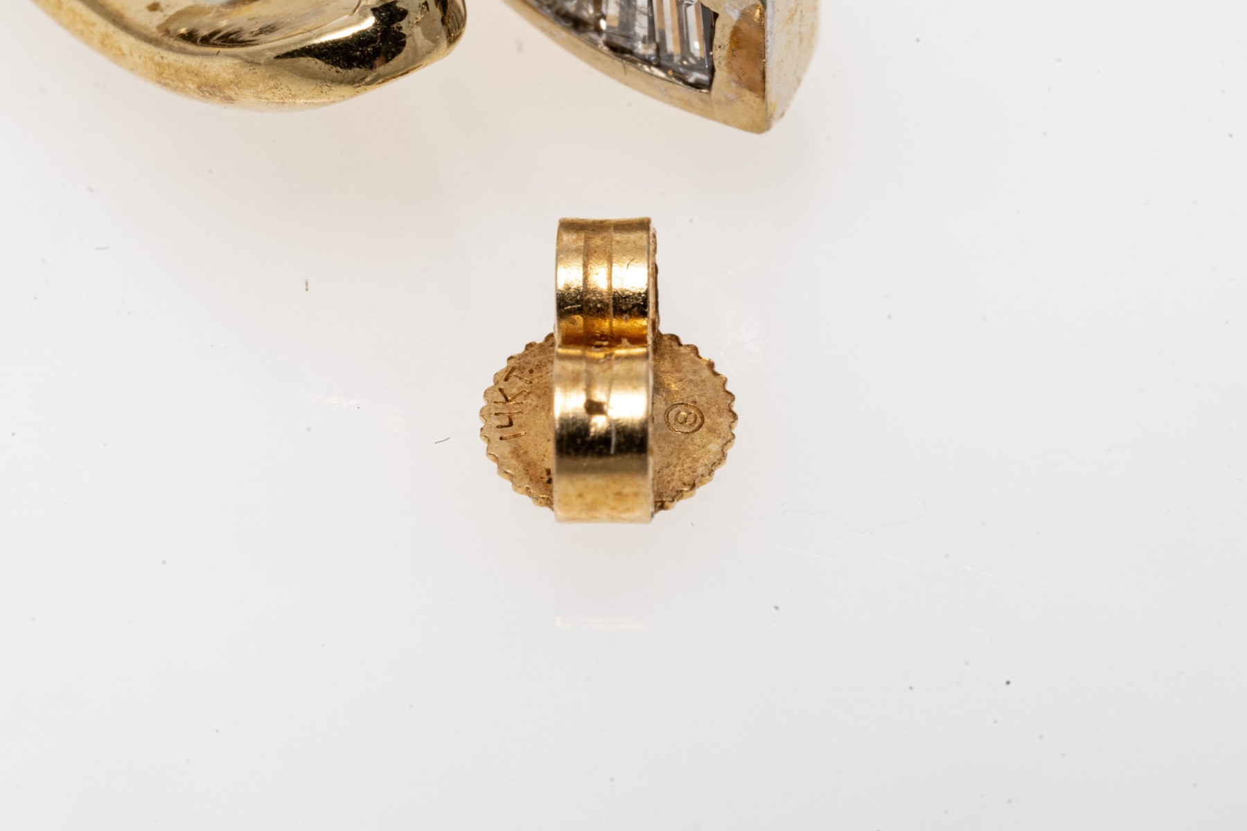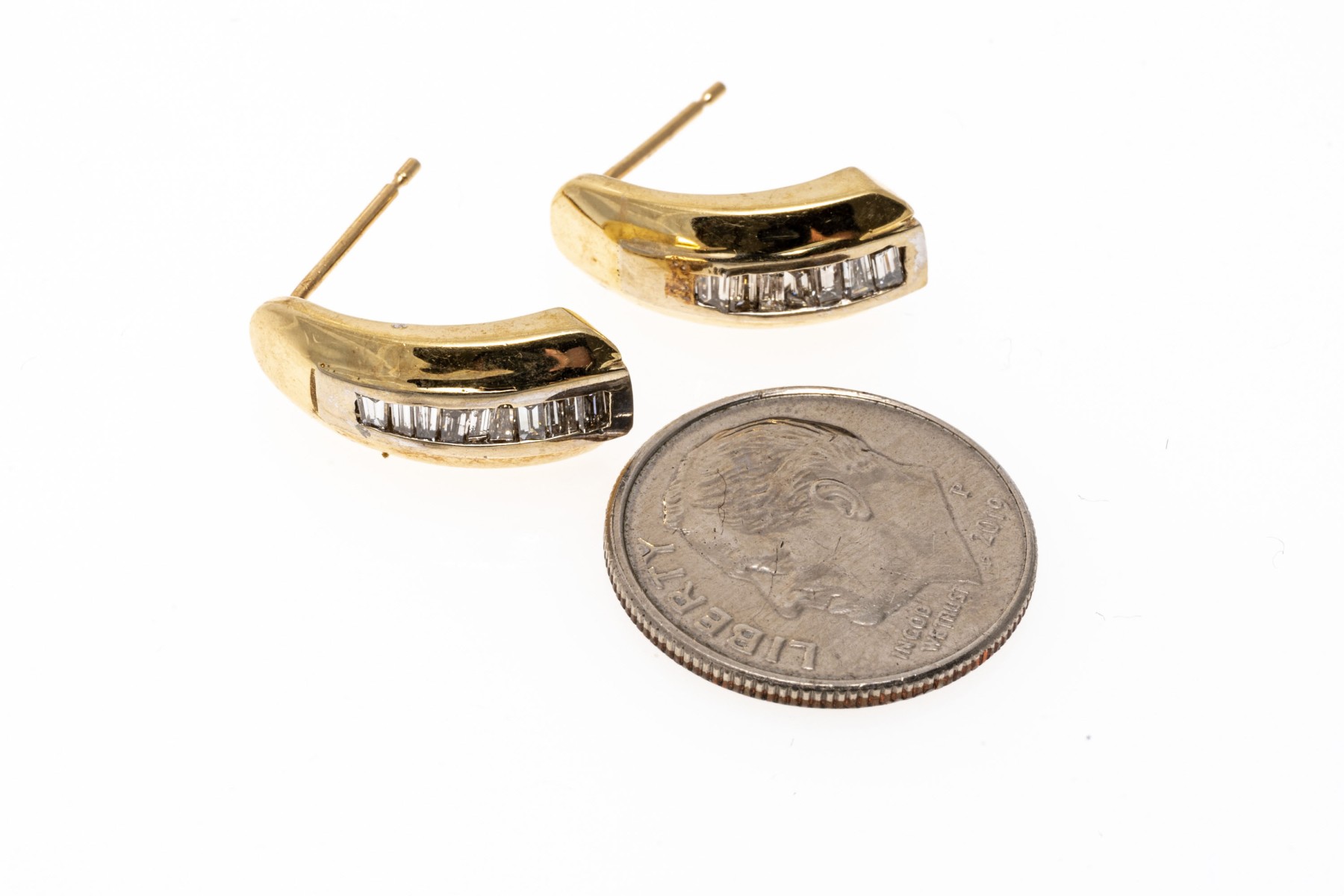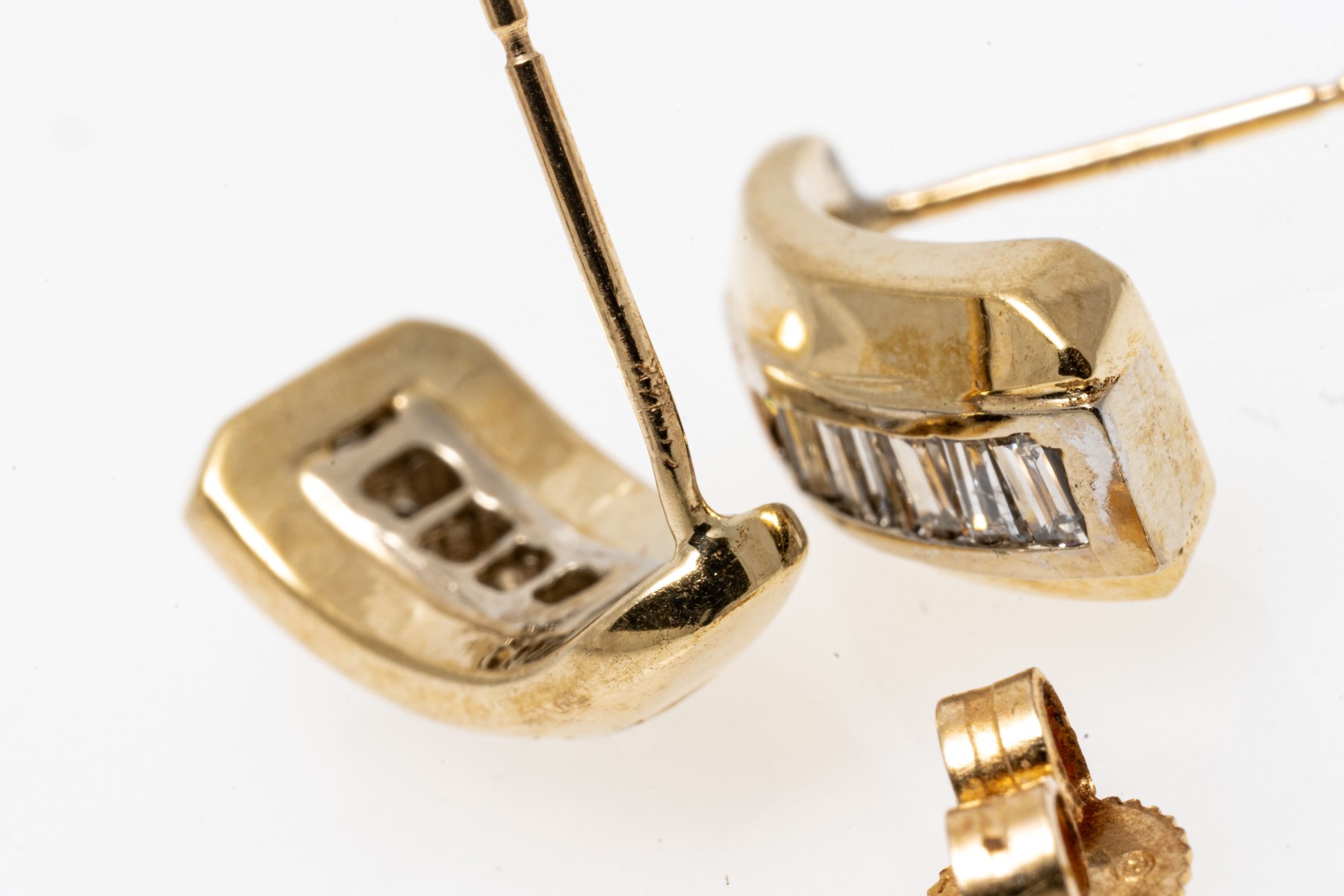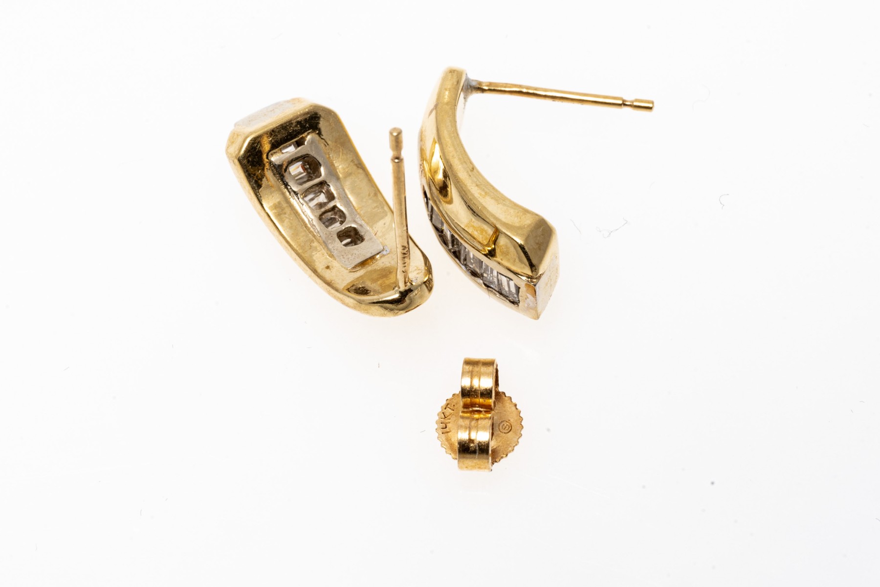 14k yellow gold contemporary baguette diamond channel set earrings, app. 0.18 TCW. The earrings have posts and clutch style backs, one missing
