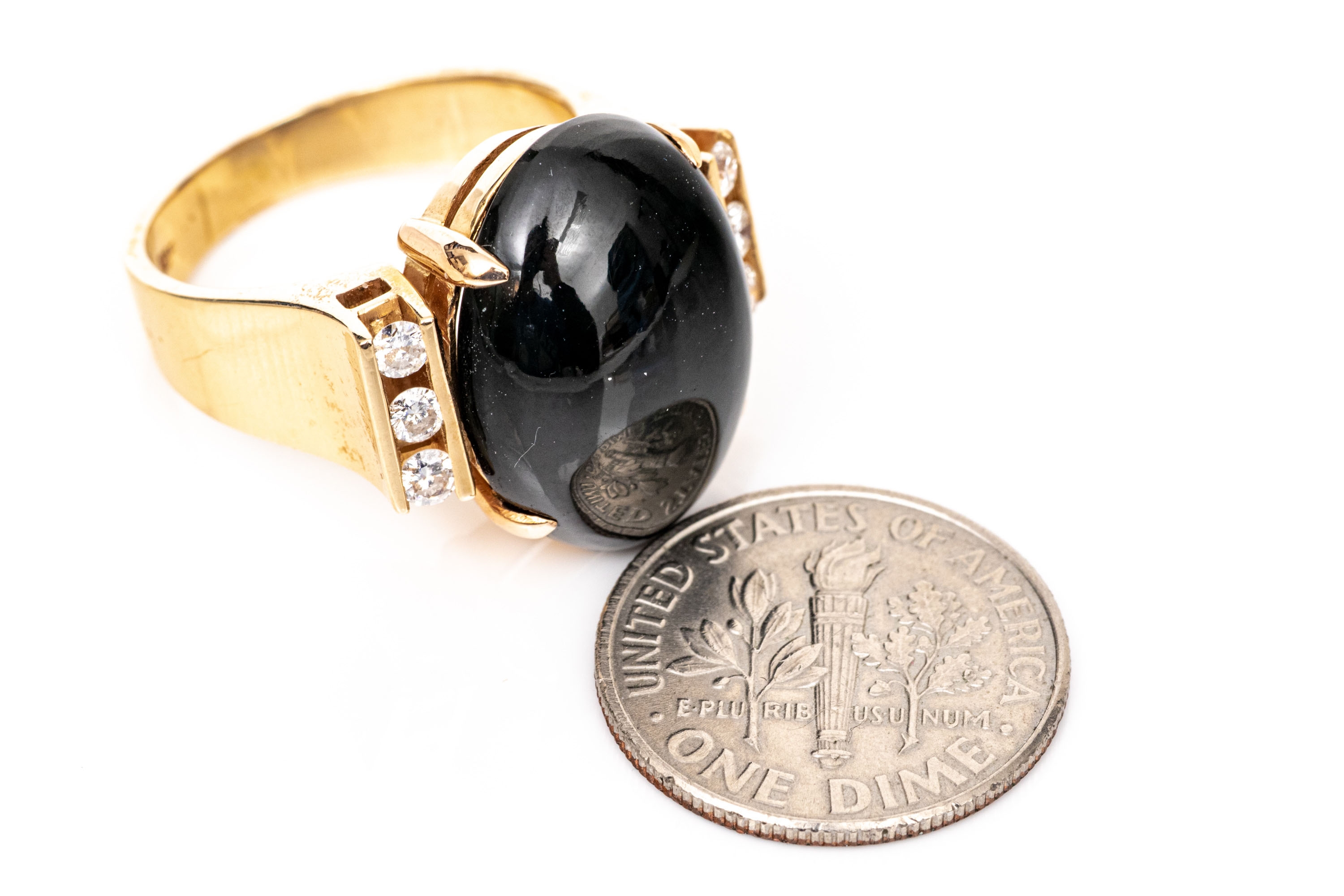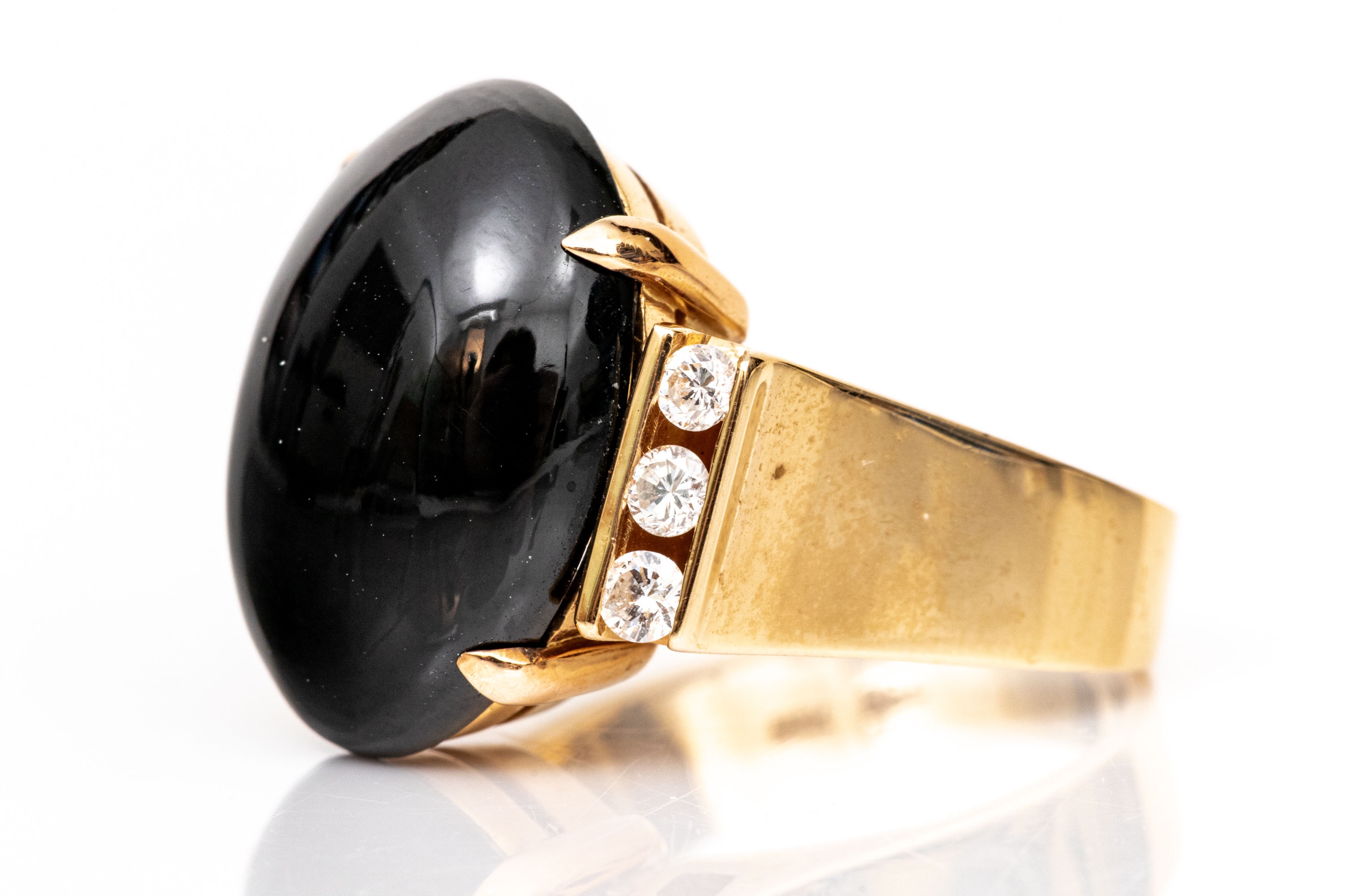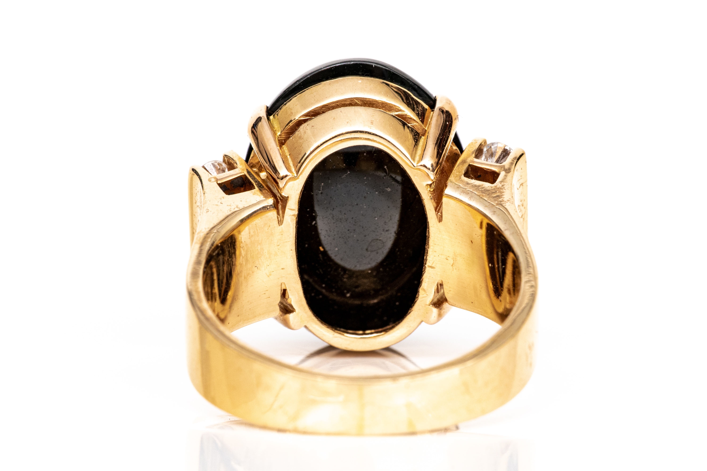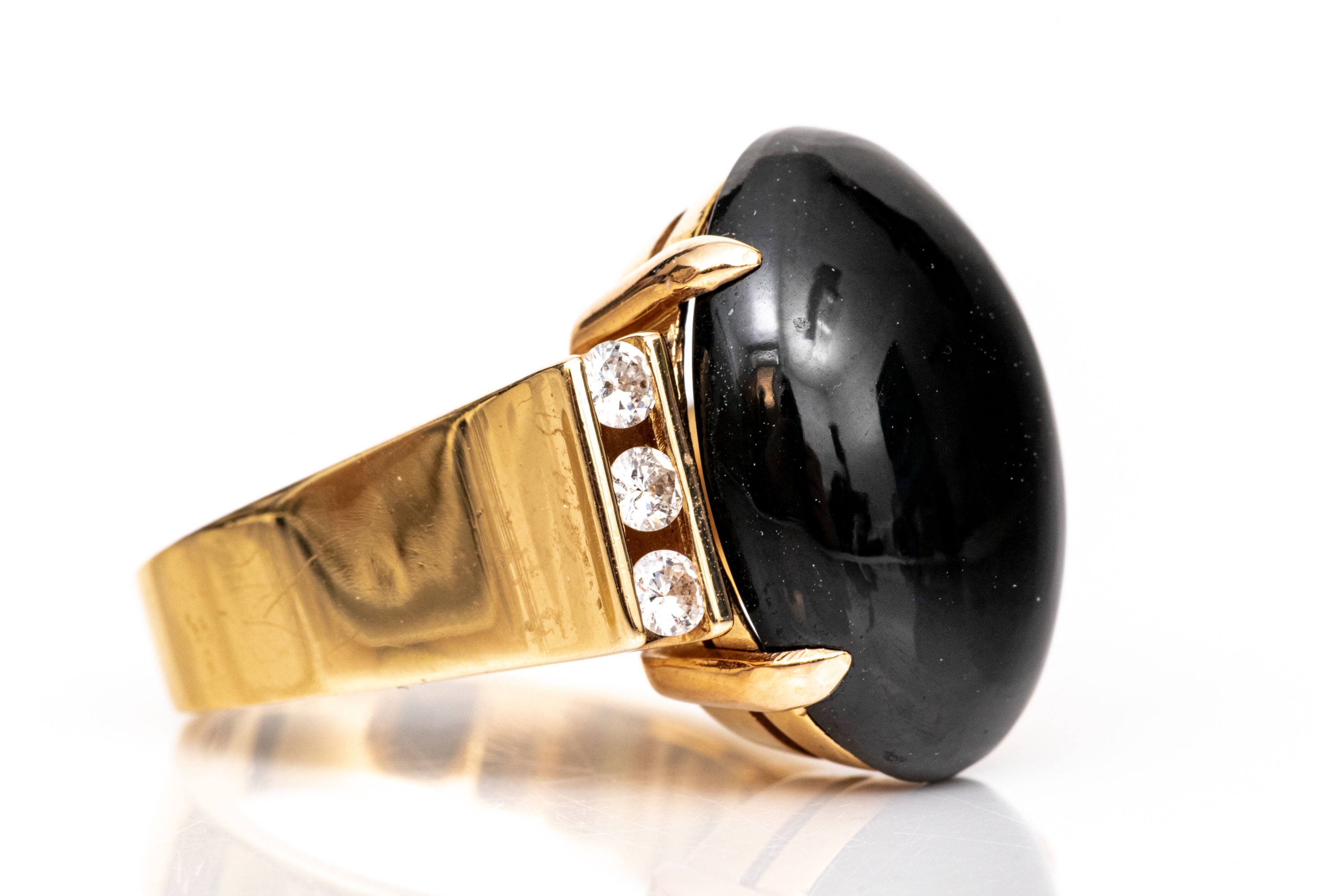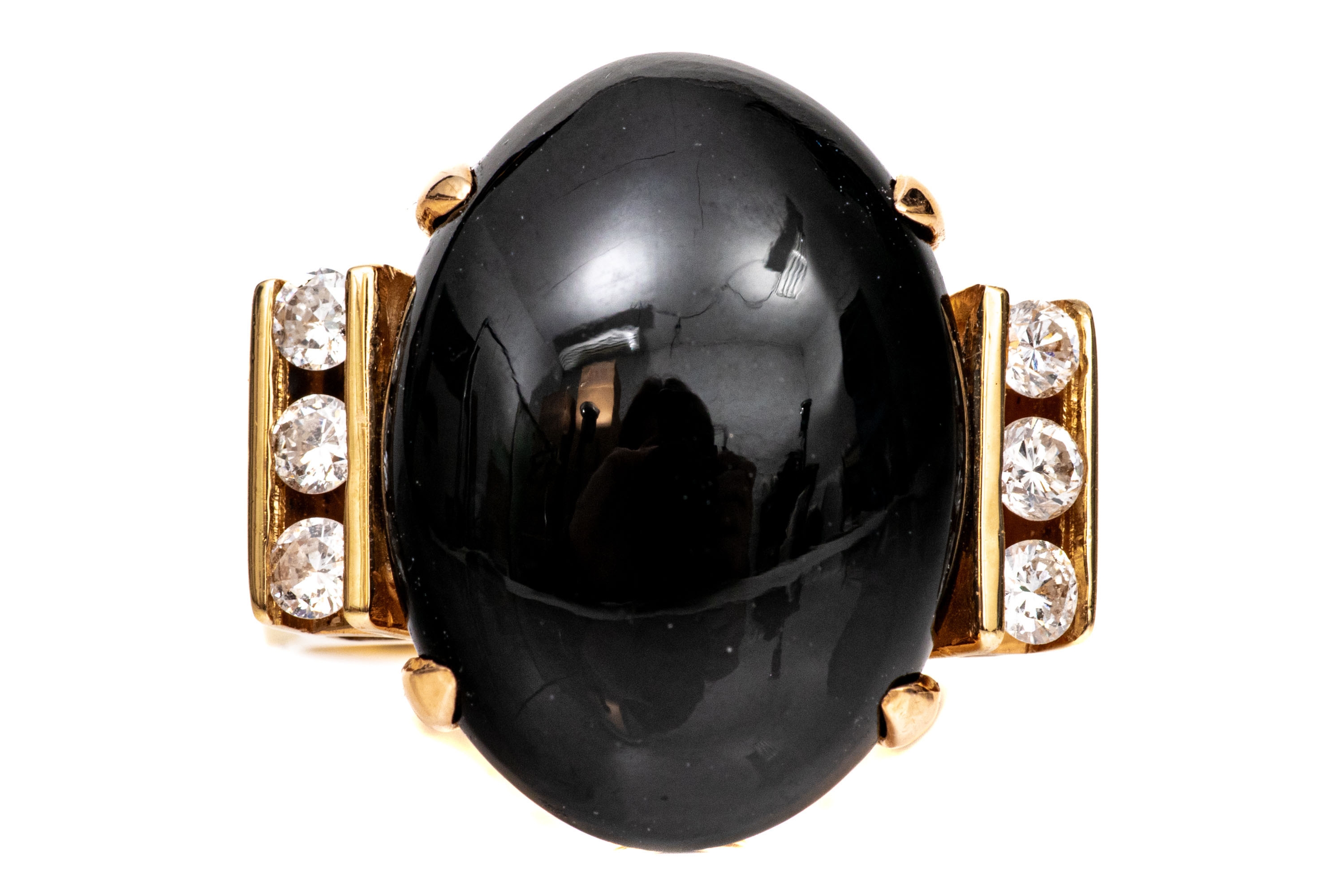 14k yellow gold contemporary cabachon black onyx and diamond ring, size 6.5. This fabulous ring has a chunky oval cabachony black onyx center, vertical profile, flanked by a column of channel set round faceted diamonds, app. 0.12 TCW