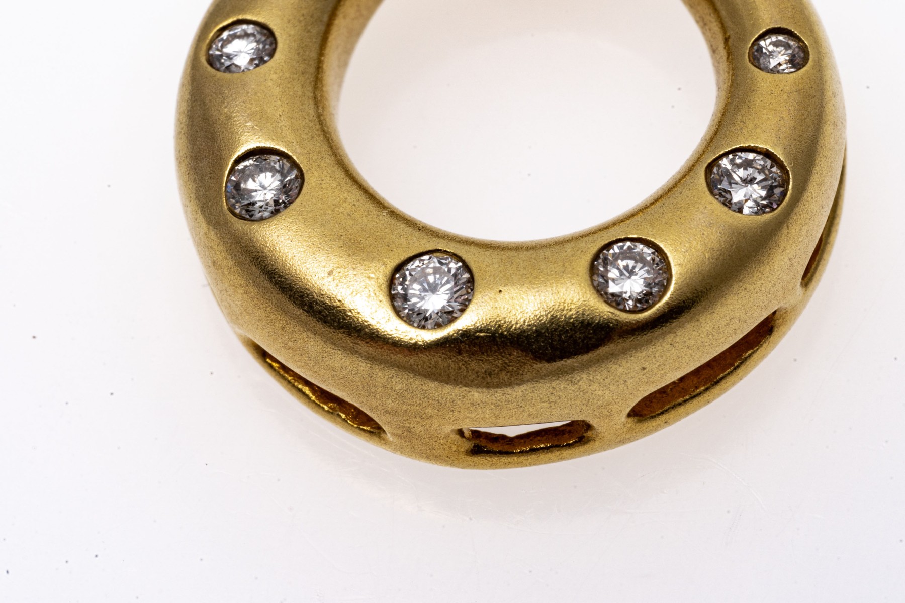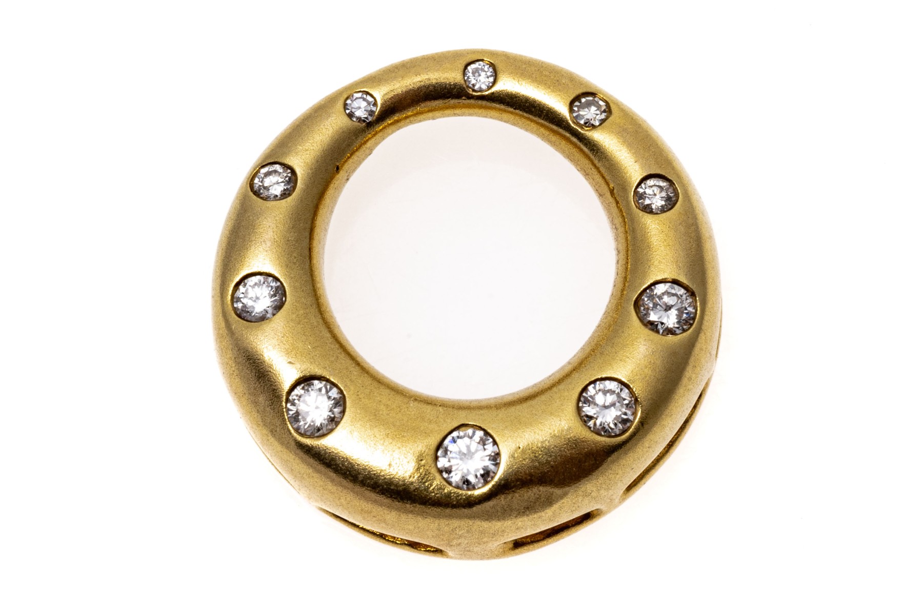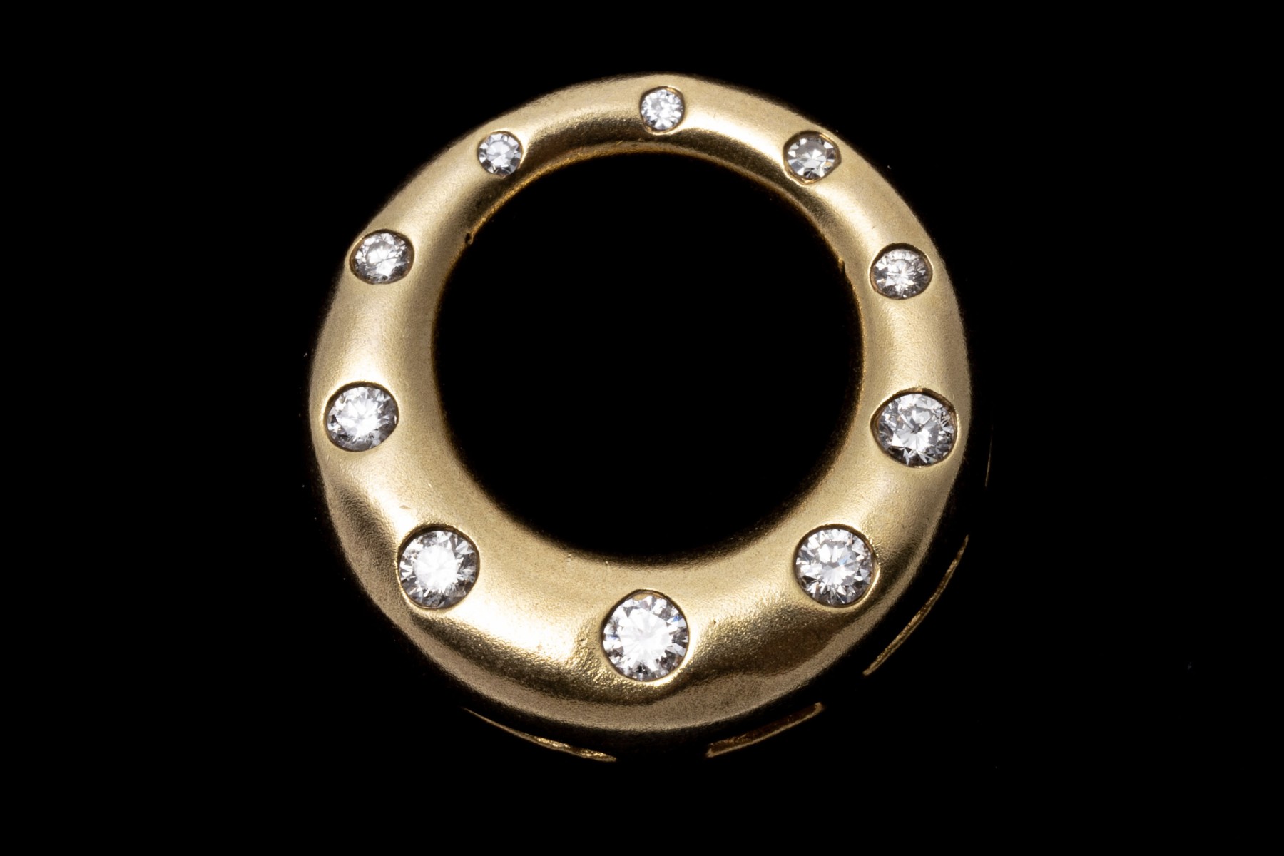A delightful yellow gold pendant with a mod design showcasing a domed graduating circle form in a matte finish, dazzling with flush set graduating round diamonds, approximately 0.20 TCW.