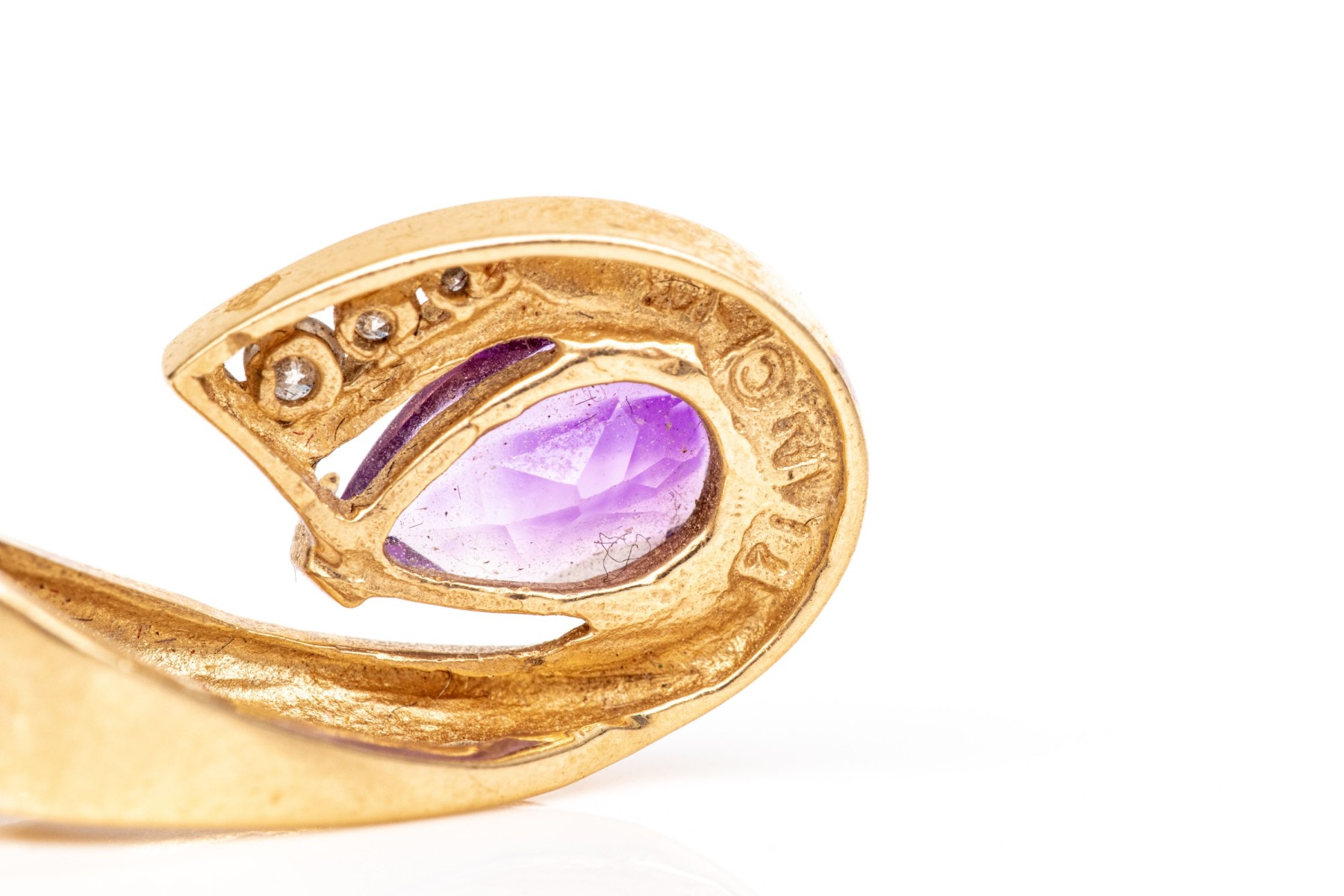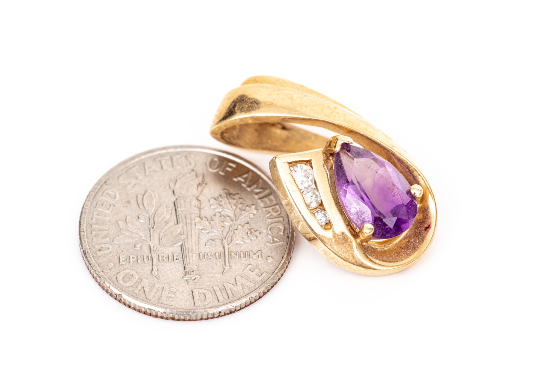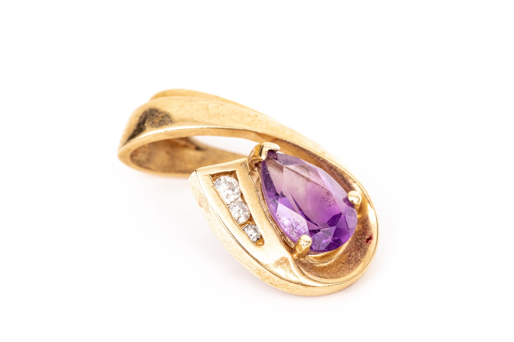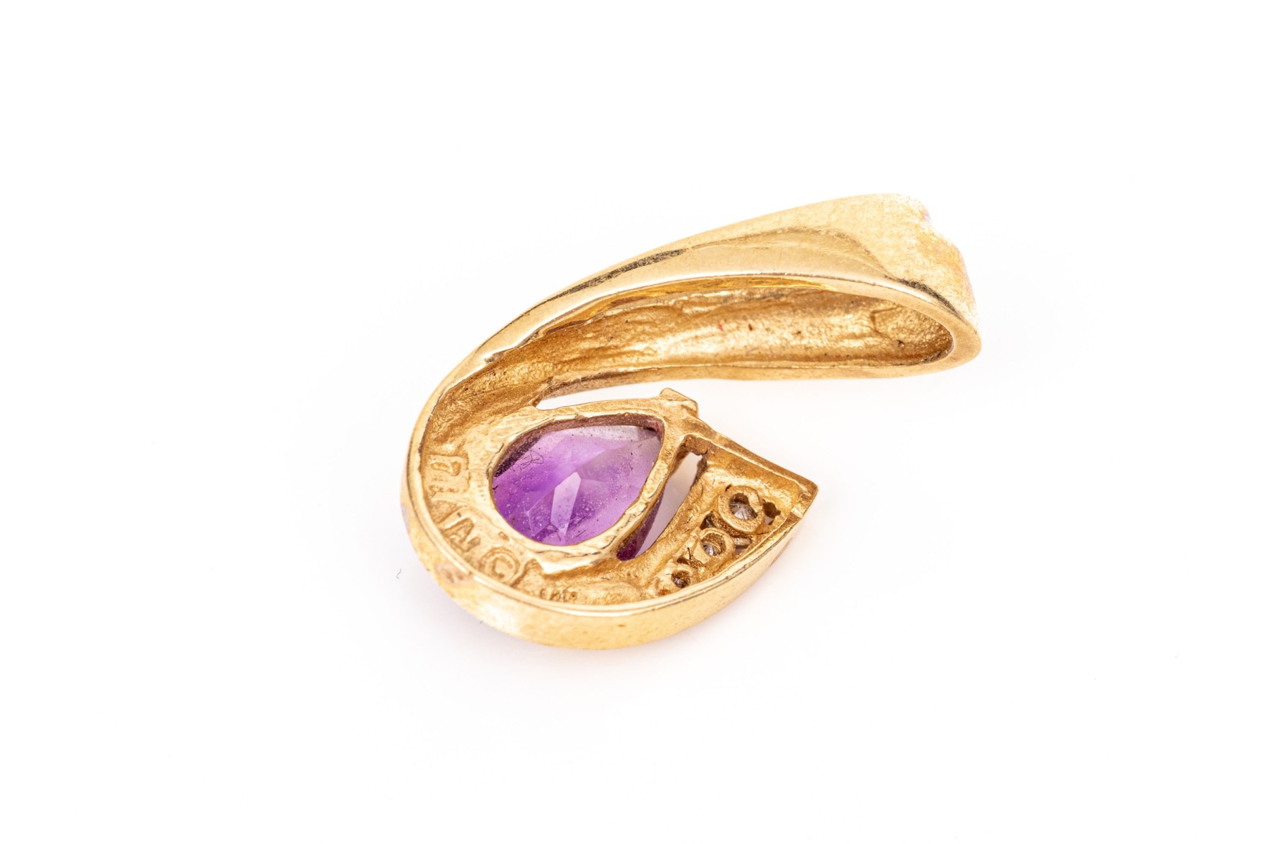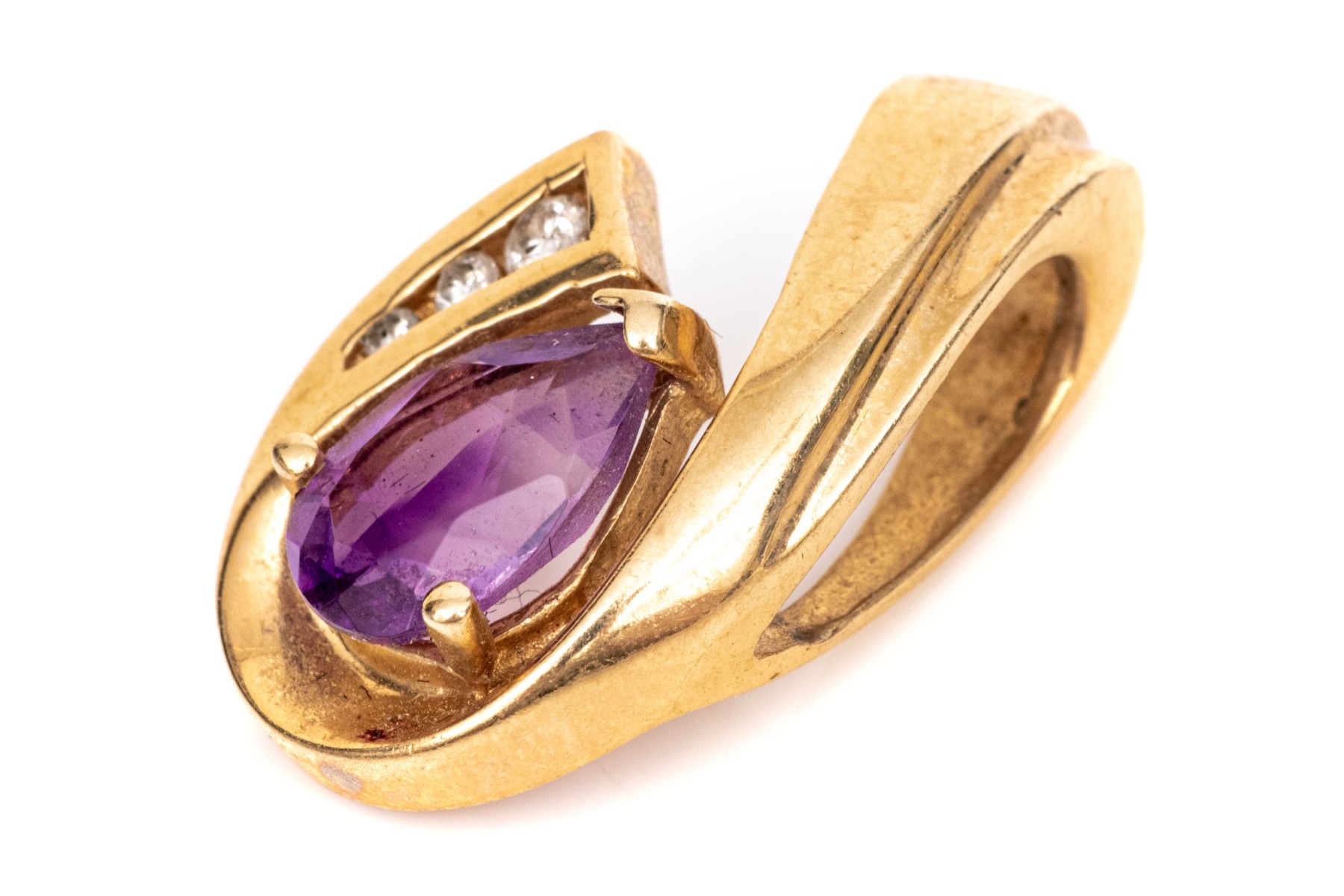 14k yellow gold contemporary pear amethyst and channel diamond swirl pendant. This striking pendant has a pear shaped center, app. 1.04 CTS, prong set and framed by graduated channel set diamonds, app. 0.04 TCW, and is finished with an integral style bale