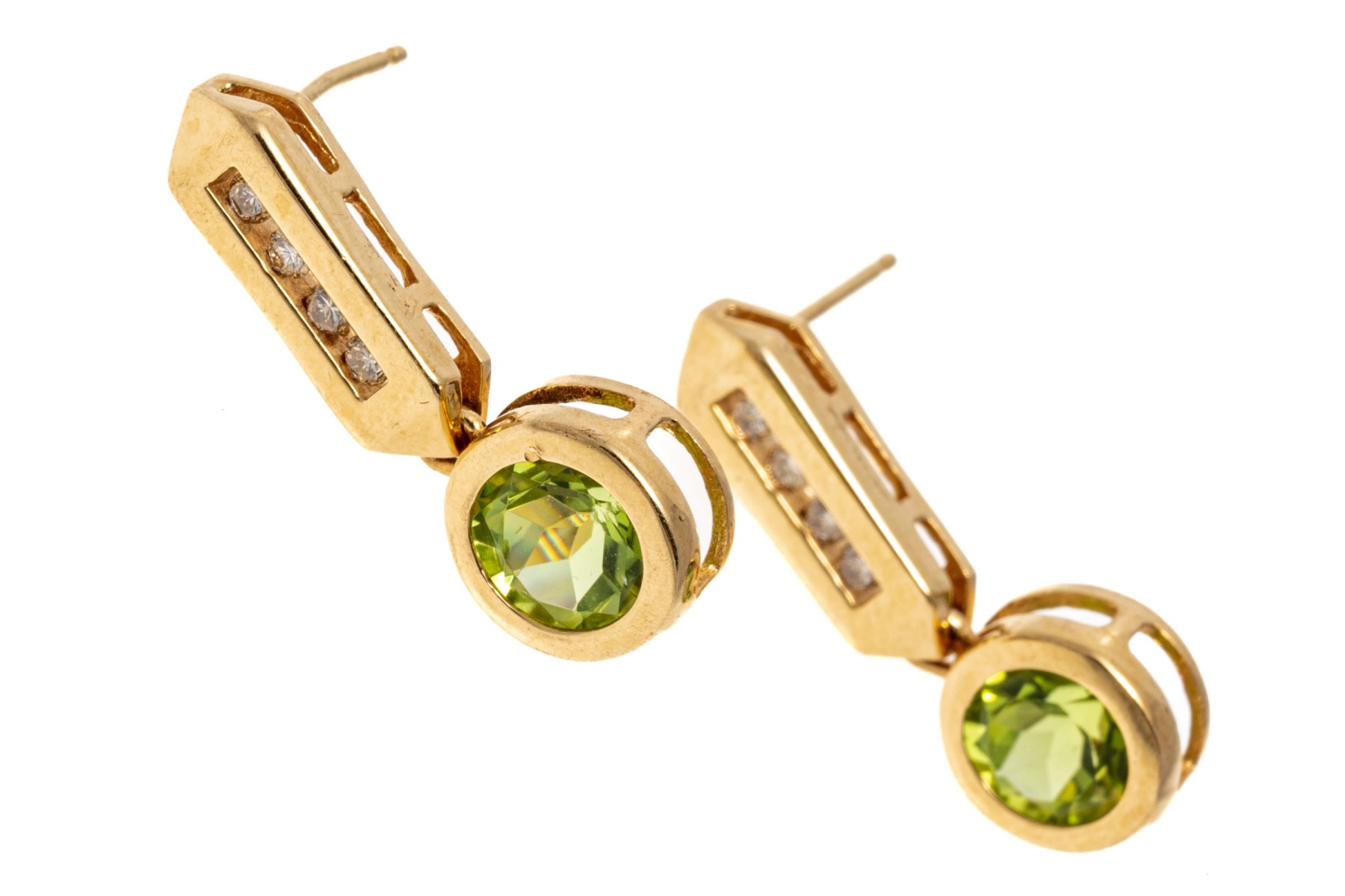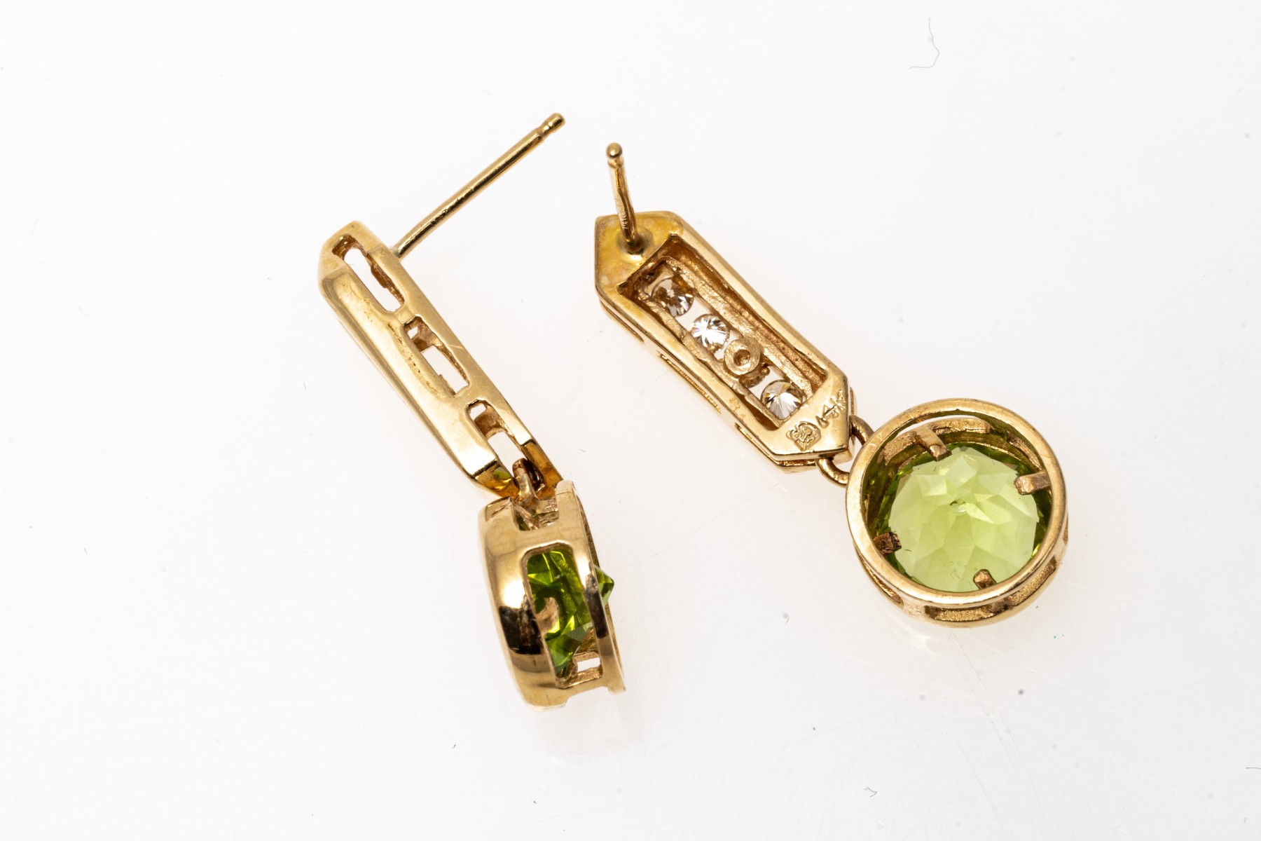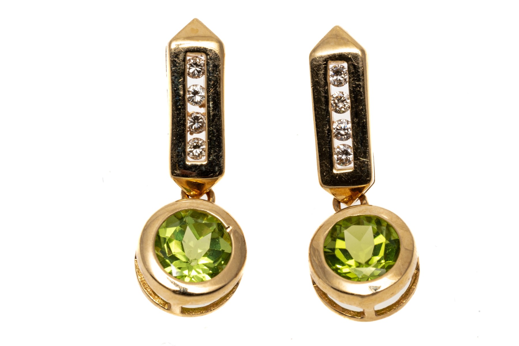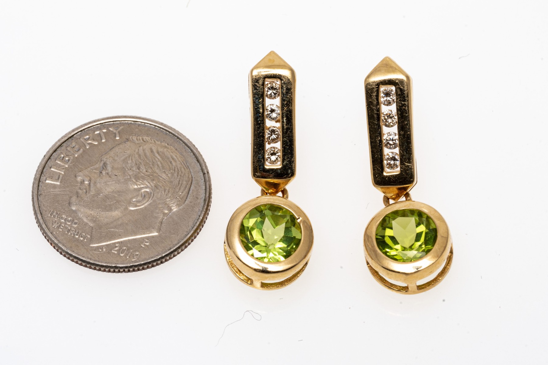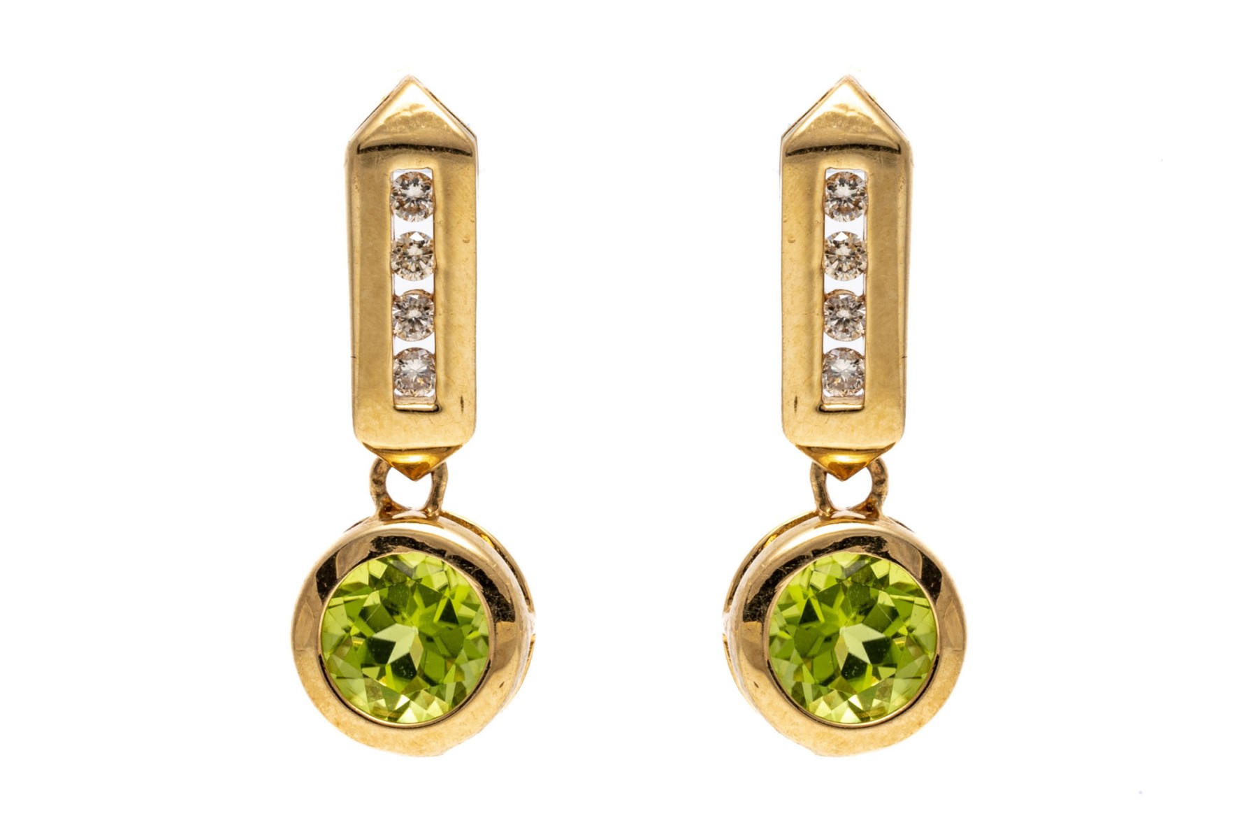 14K yellow gold contemporary peridot and diamond drop earrings, with peridots approximately 1.40 TCW, bezel set, topped with a vertical row of round faceted diamonds, approximately 0.12 TCW, channel set. The earrings are finished with posts and missing the clutch style backs.