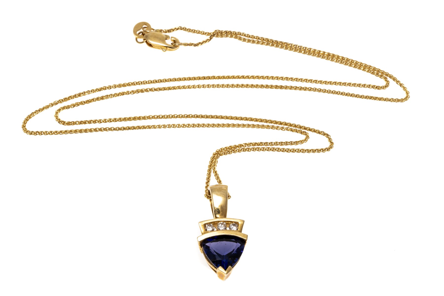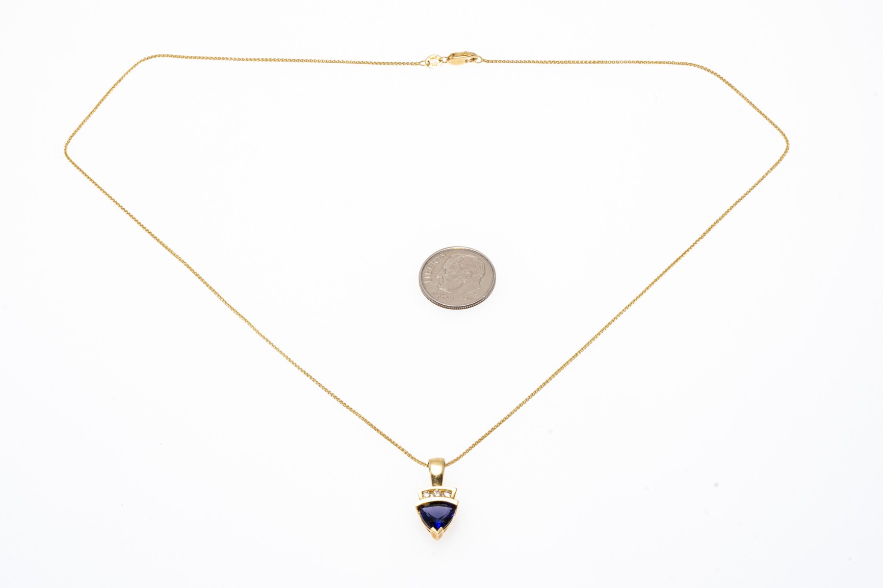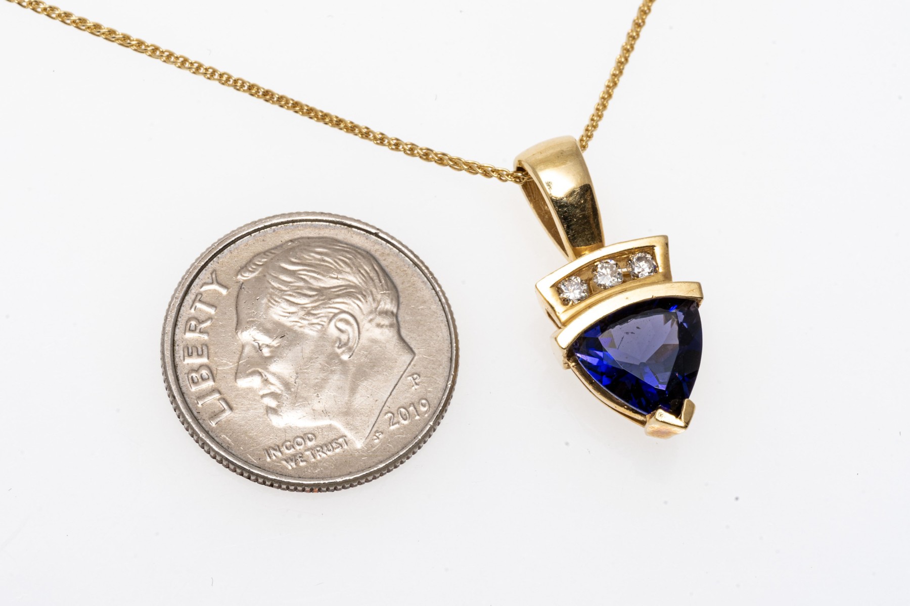 14k yellow gold contemporary trillion cut tanzanite and diamond pendant, featuring with three horizontal channel round faceted diamonds, approximately 0.06 TCW, and a trillion cut, blue purple color tanzanite, approximately 1.22 CTS, half bezel and prong set. The pendant is finished by a fine link chain with a lobster claw style clasp