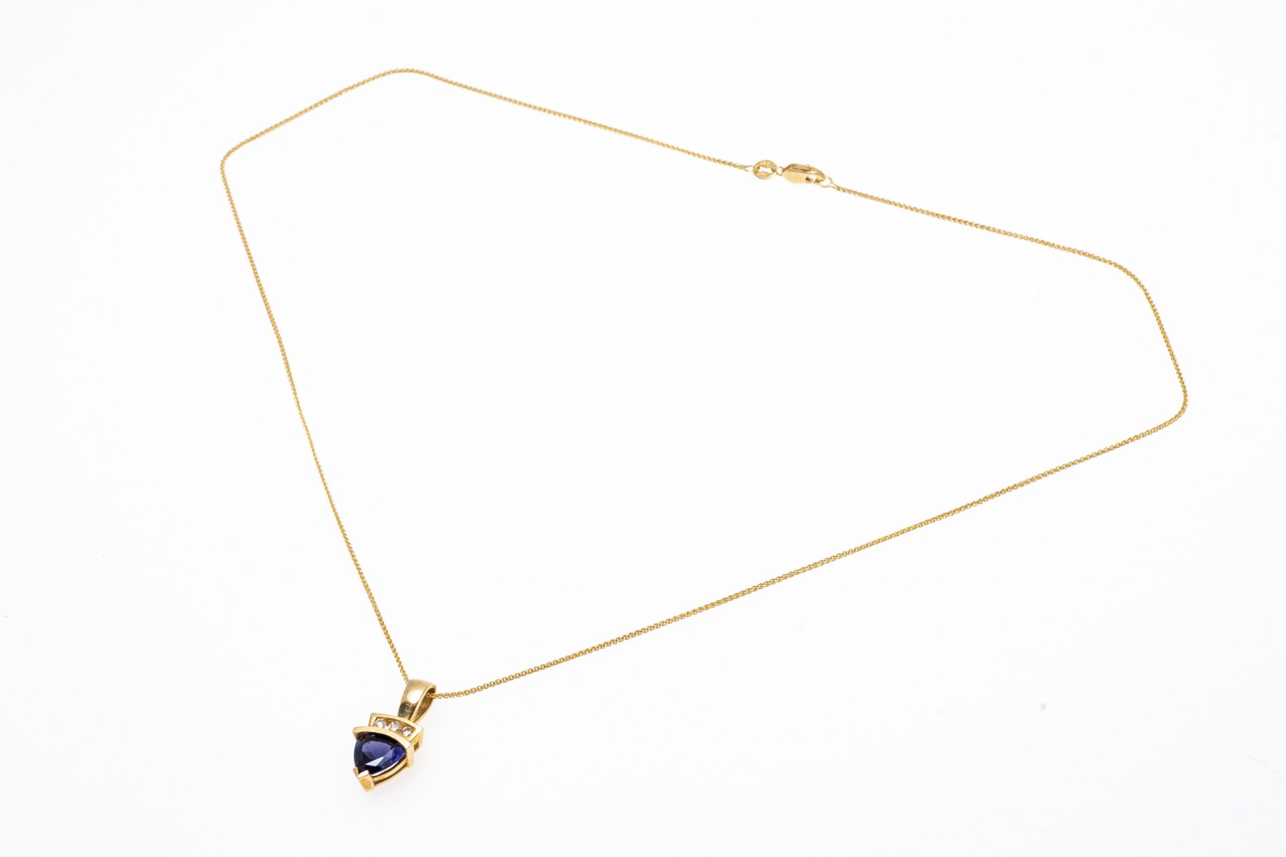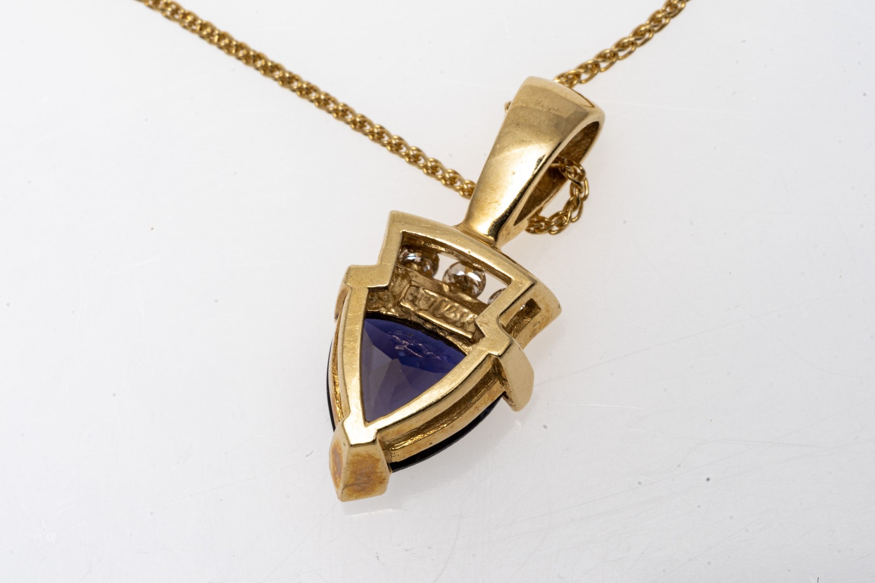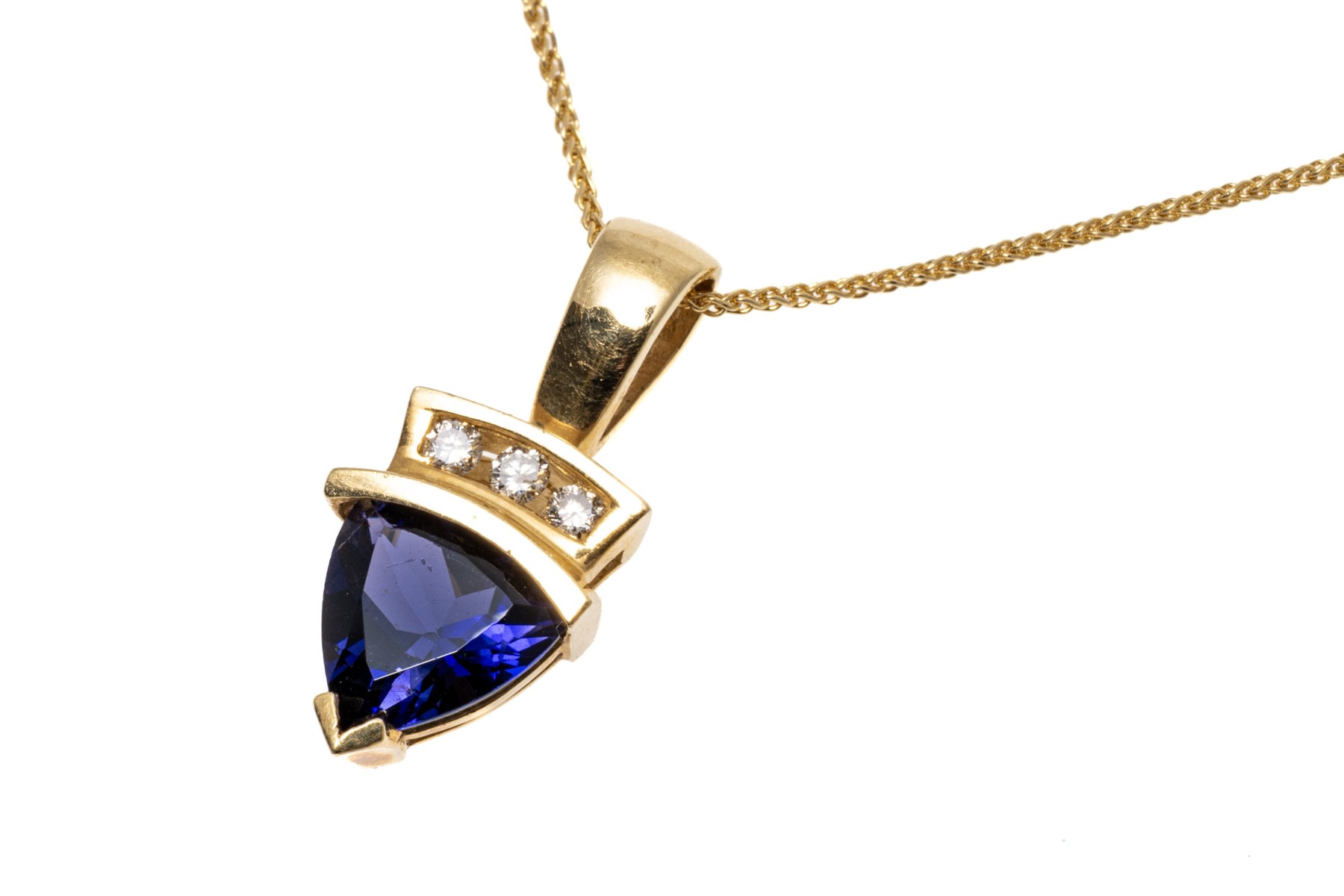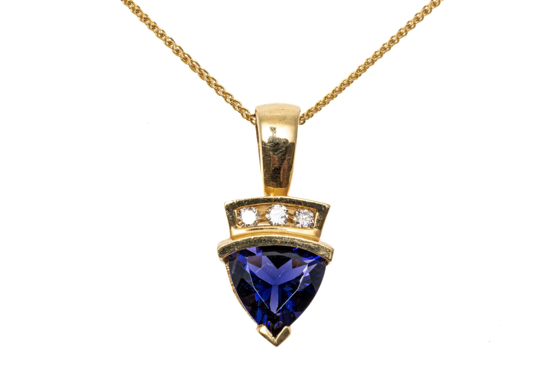 14k yellow gold contemporary trillion cut tanzanite and diamond pendant, featuring with three horizontal channel round faceted diamonds, approximately 0.06 TCW, and a trillion cut, blue purple color tanzanite, approximately 1.22 CTS, half bezel and prong set. The pendant is finished by a fine link chain with a lobster claw style clasp