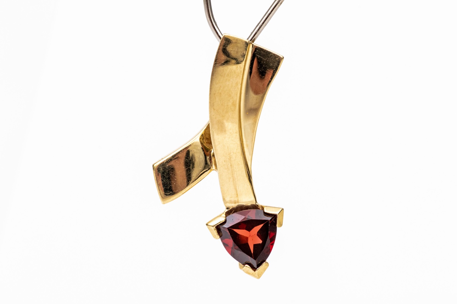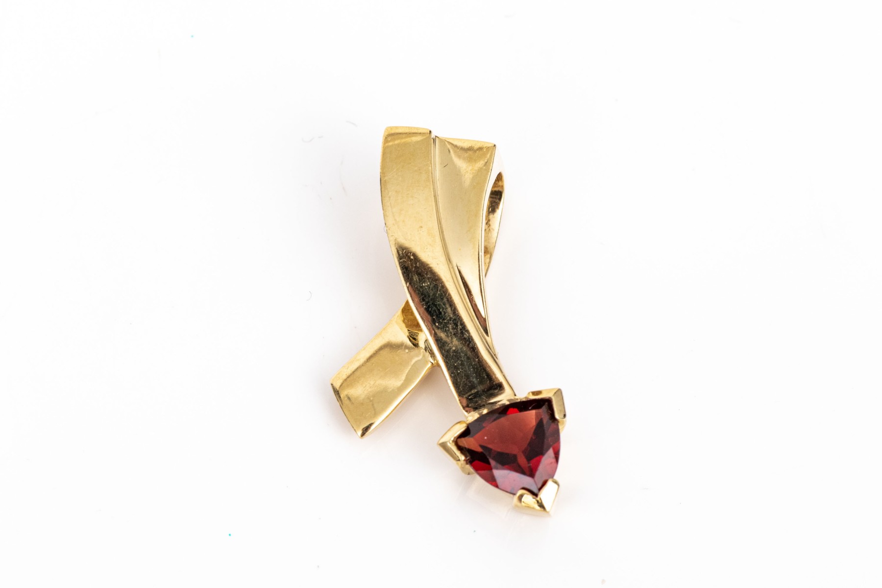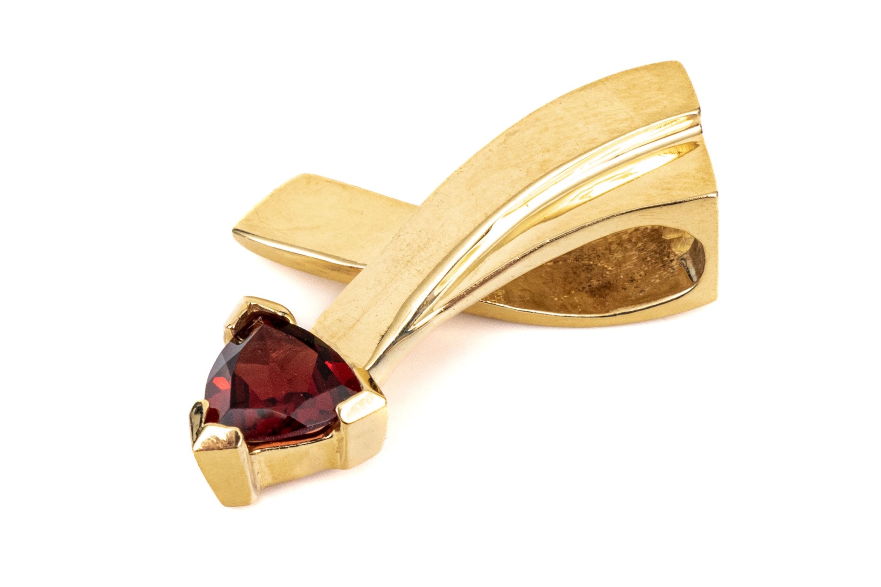 14k yellow gold contemporary trillion garnet set pendant, app. 0.80 CTS, prong set and finished with an integral bale