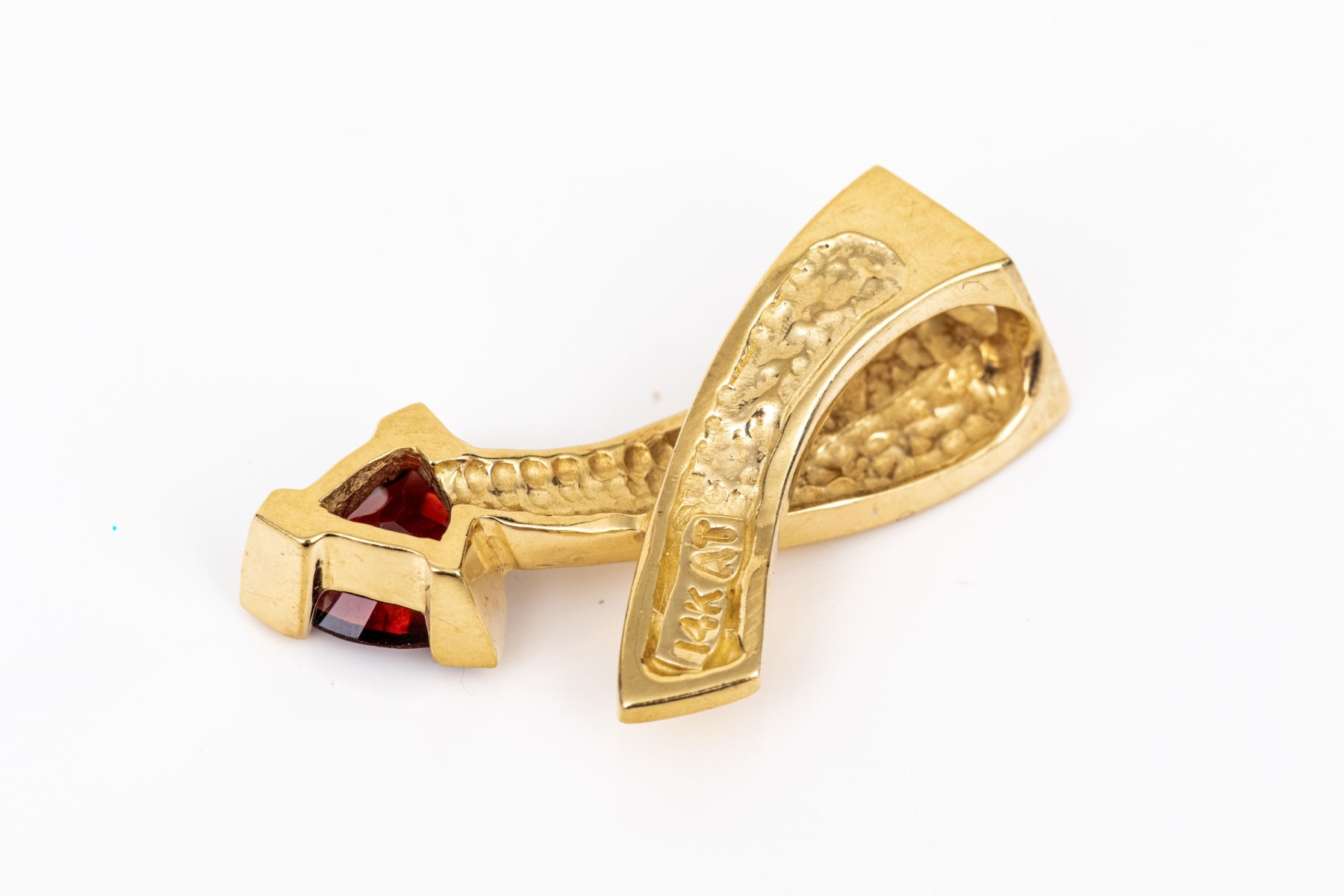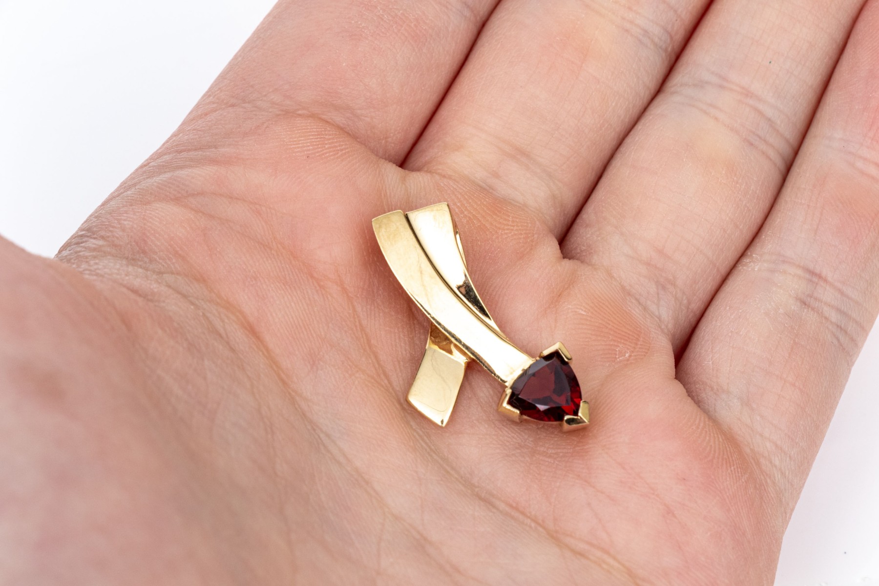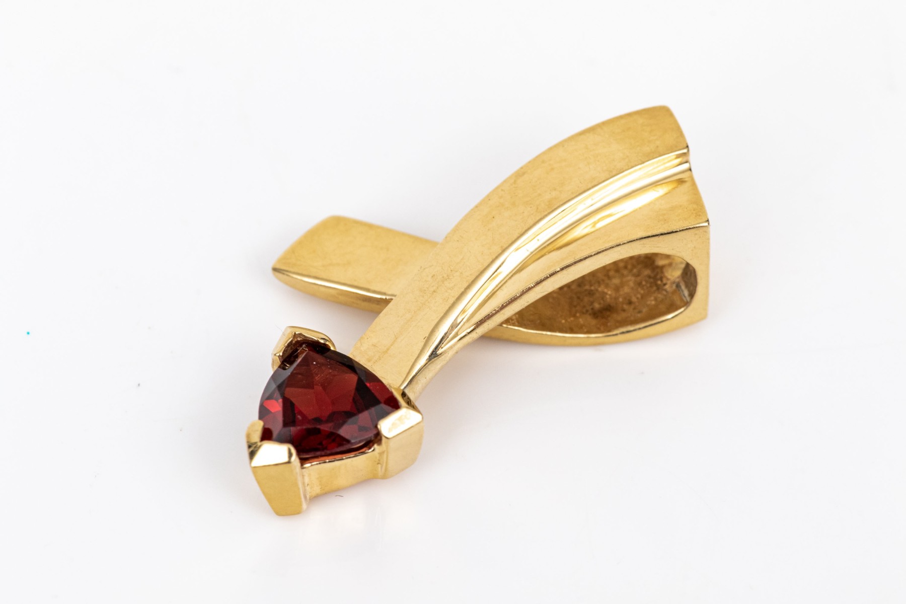 14k yellow gold contemporary trillion garnet set pendant, app. 0.80 CTS, prong set and finished with an integral bale