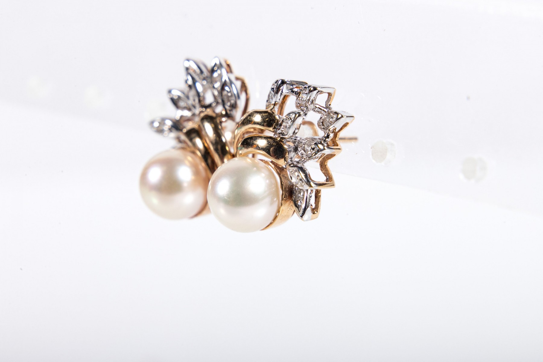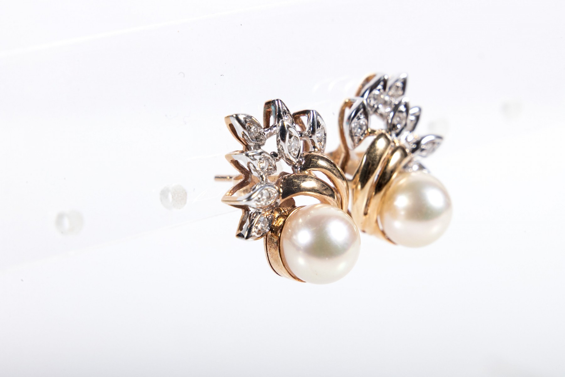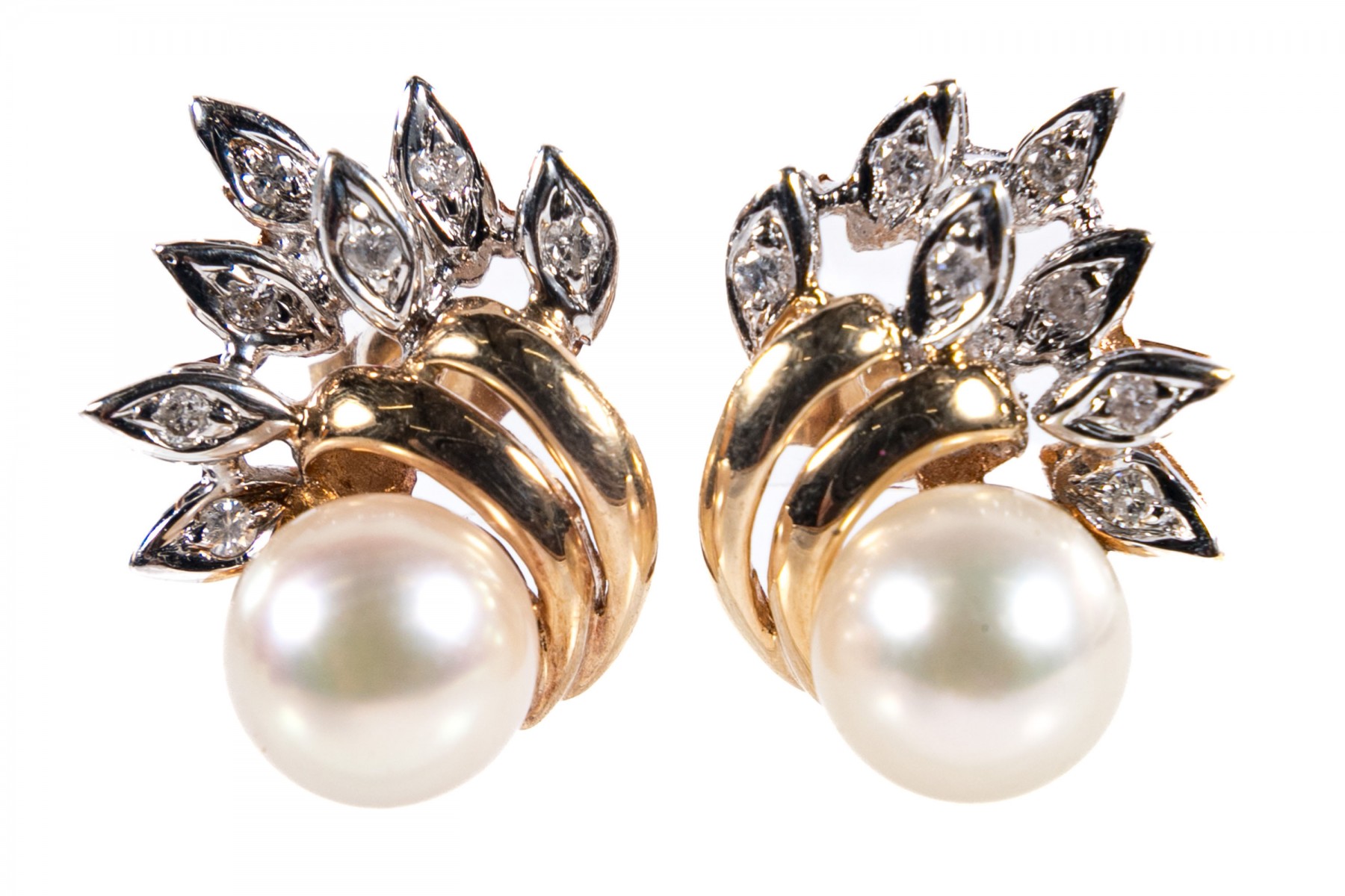 Pair of yellow gold stud earrings displaying cultured pearls in warm white surrounded by elegant swoops leading to clusters of diamonds in marquise shaped white gold foliate accents.