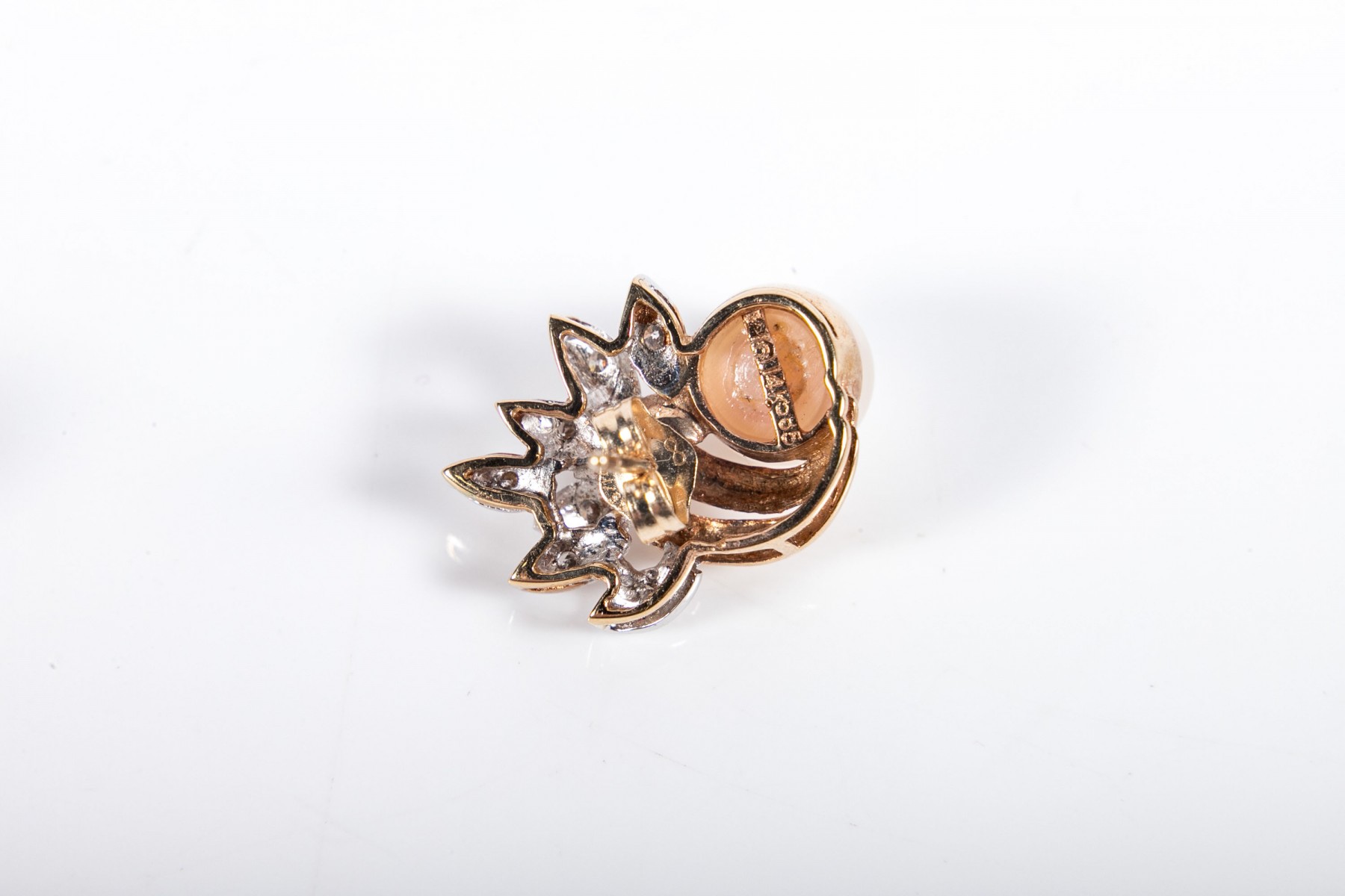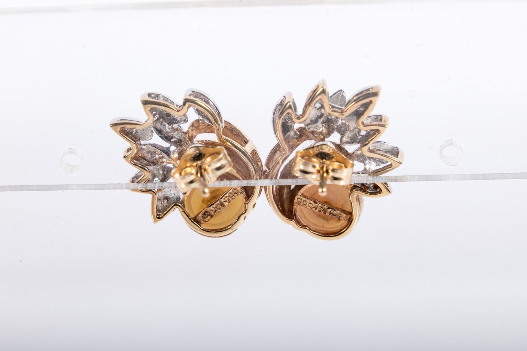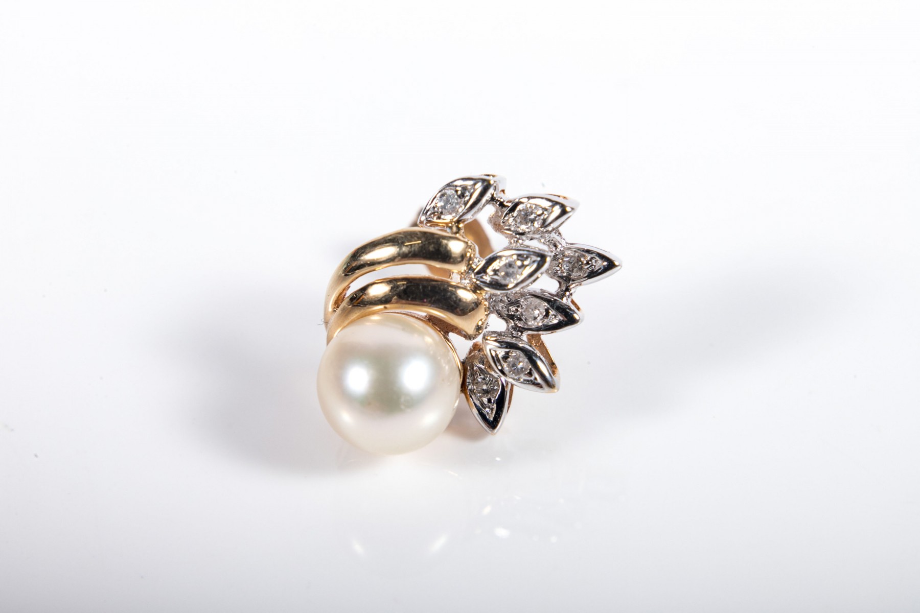 Pair of yellow gold stud earrings displaying cultured pearls in warm white surrounded by elegant swoops leading to clusters of diamonds in marquise shaped white gold foliate accents.