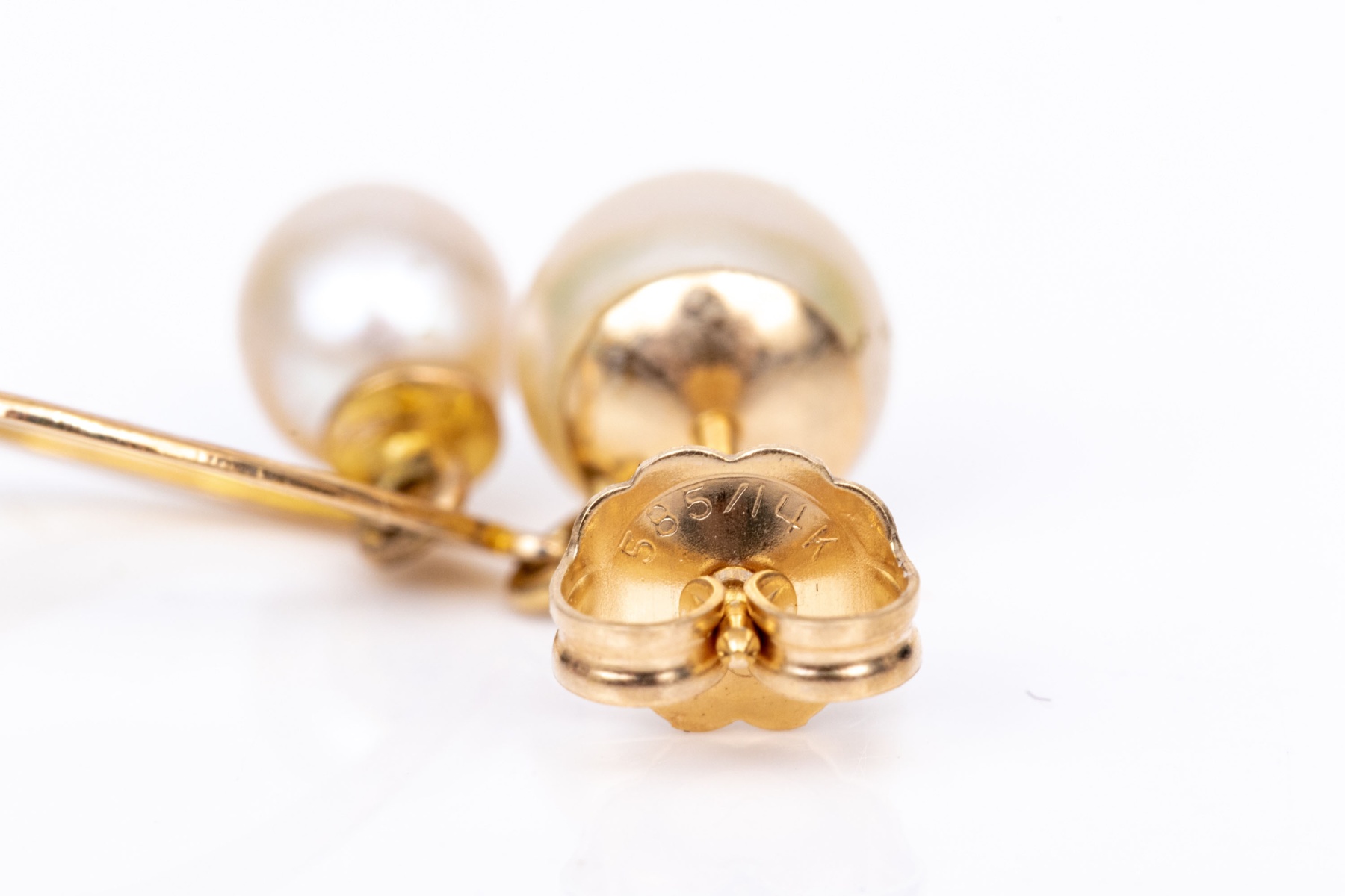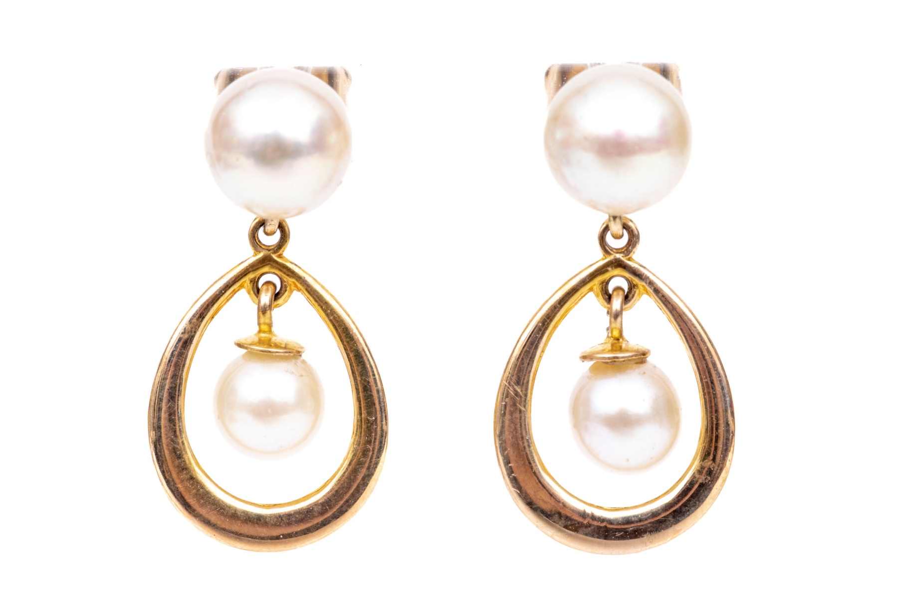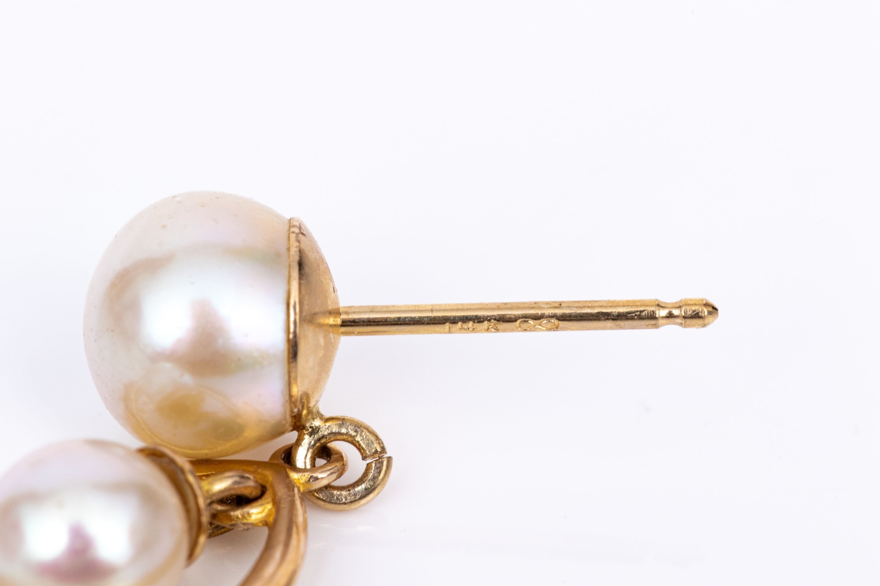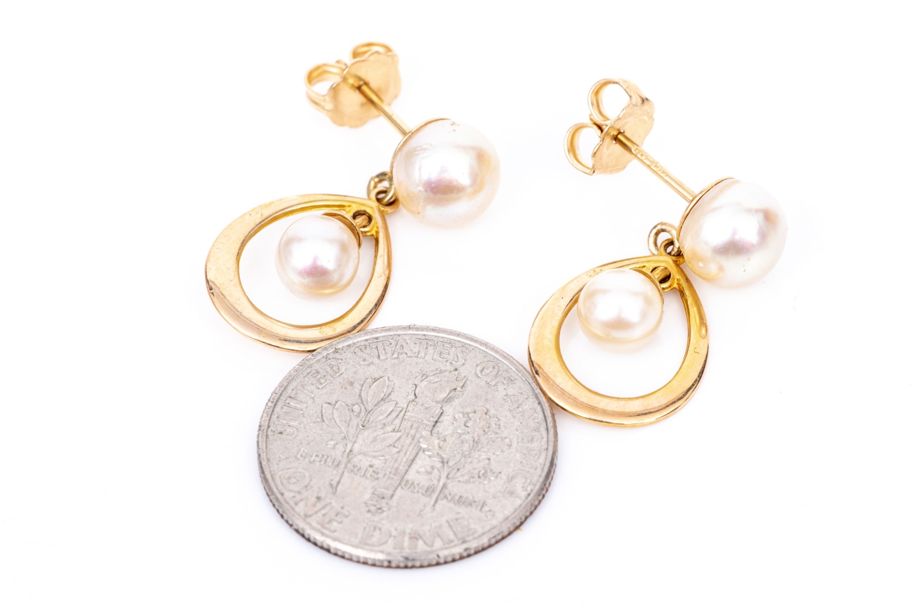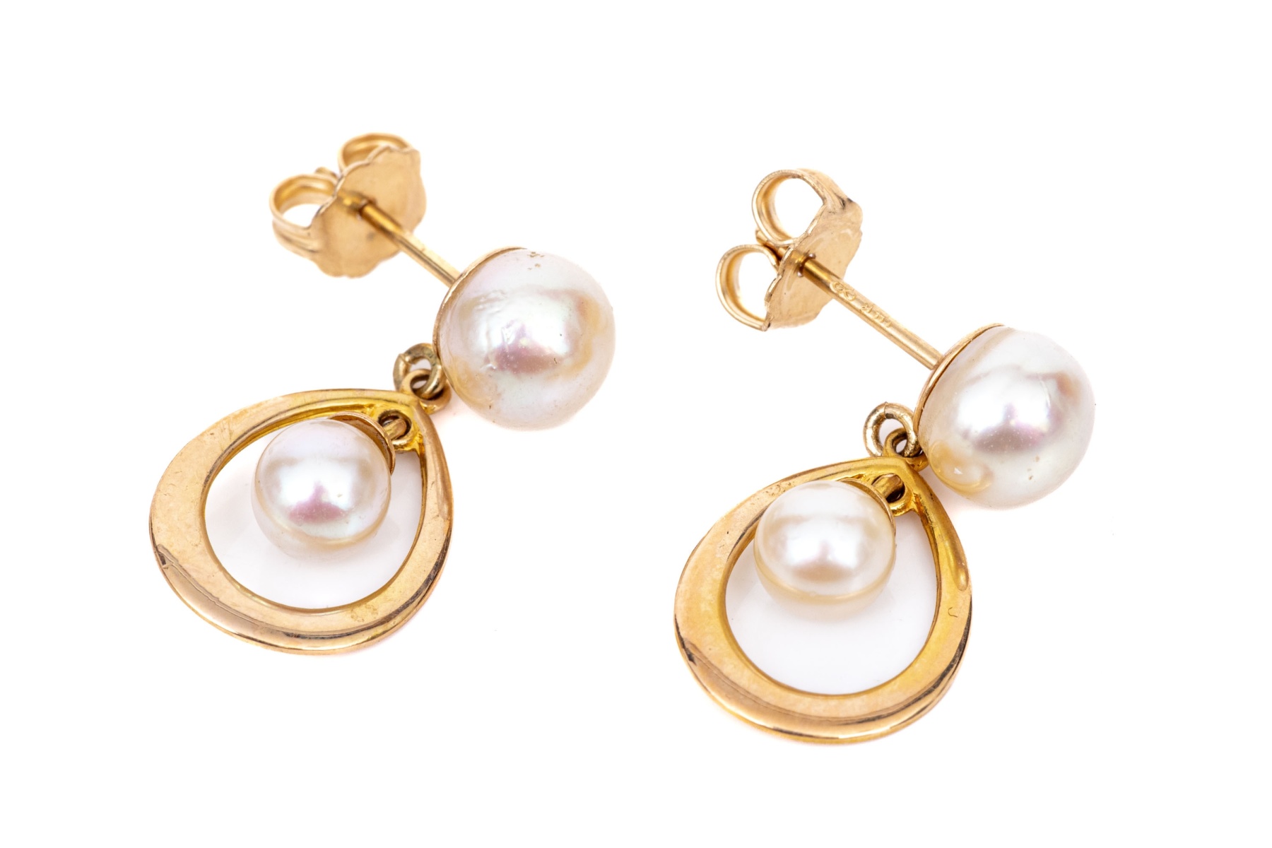 14k yellow gold cultured pearl and gold halo drop pendant earrings. These retro style earrings feature 6.75 mm cultured white pearl tops, with a drop with a 5mm white cultured pearl, frames with a movable gold halo and finished with posts and clutch style backs