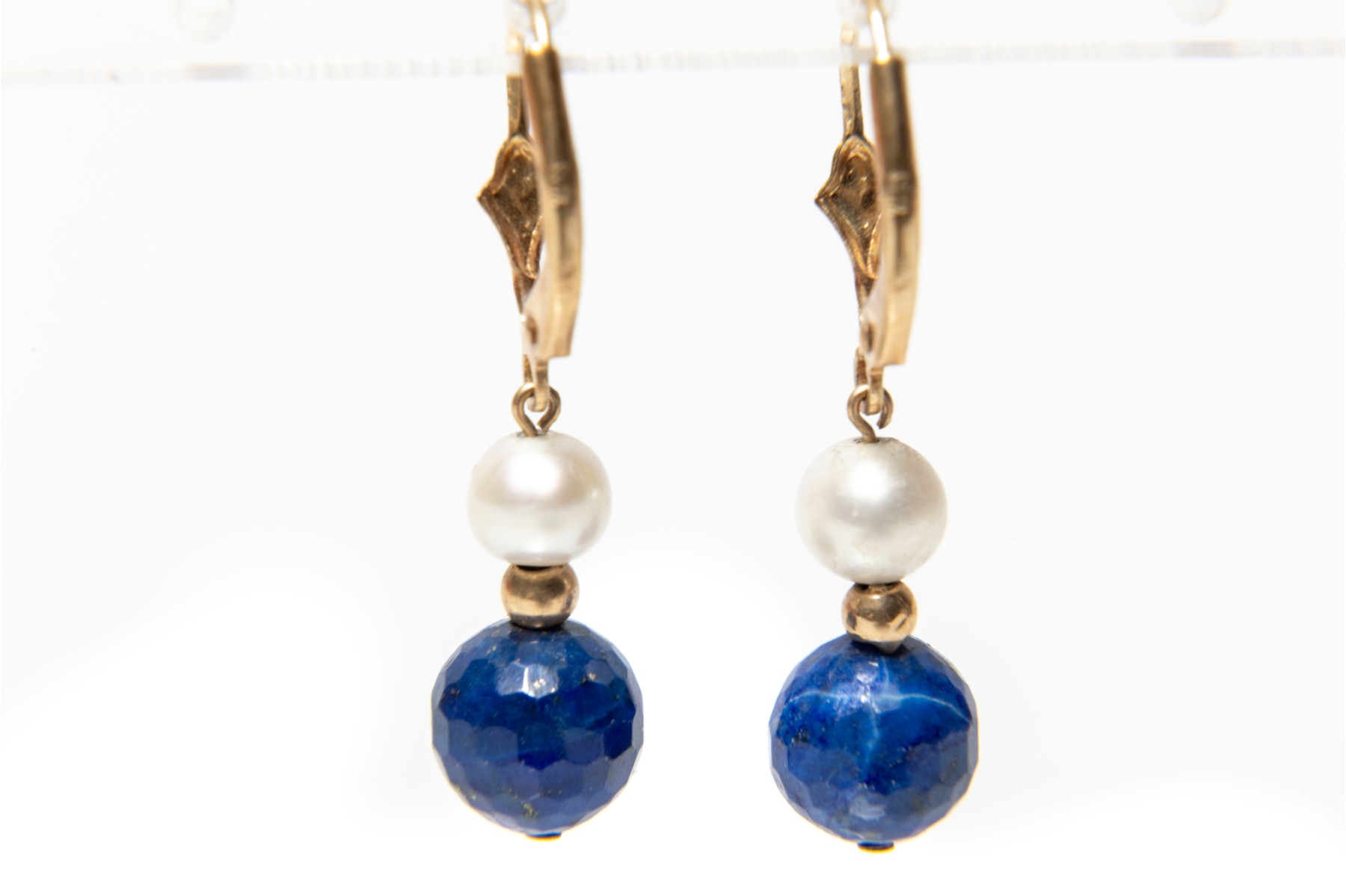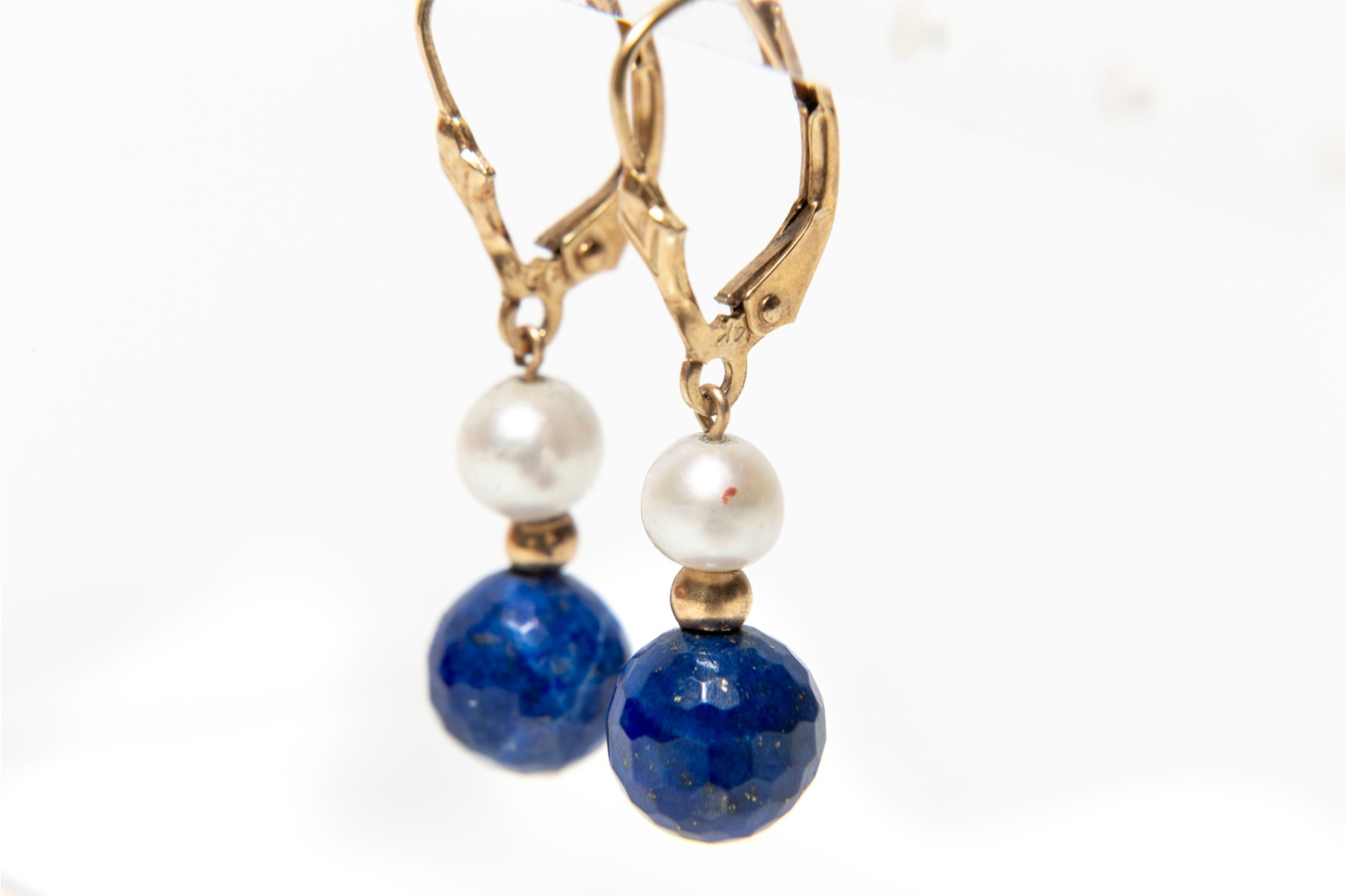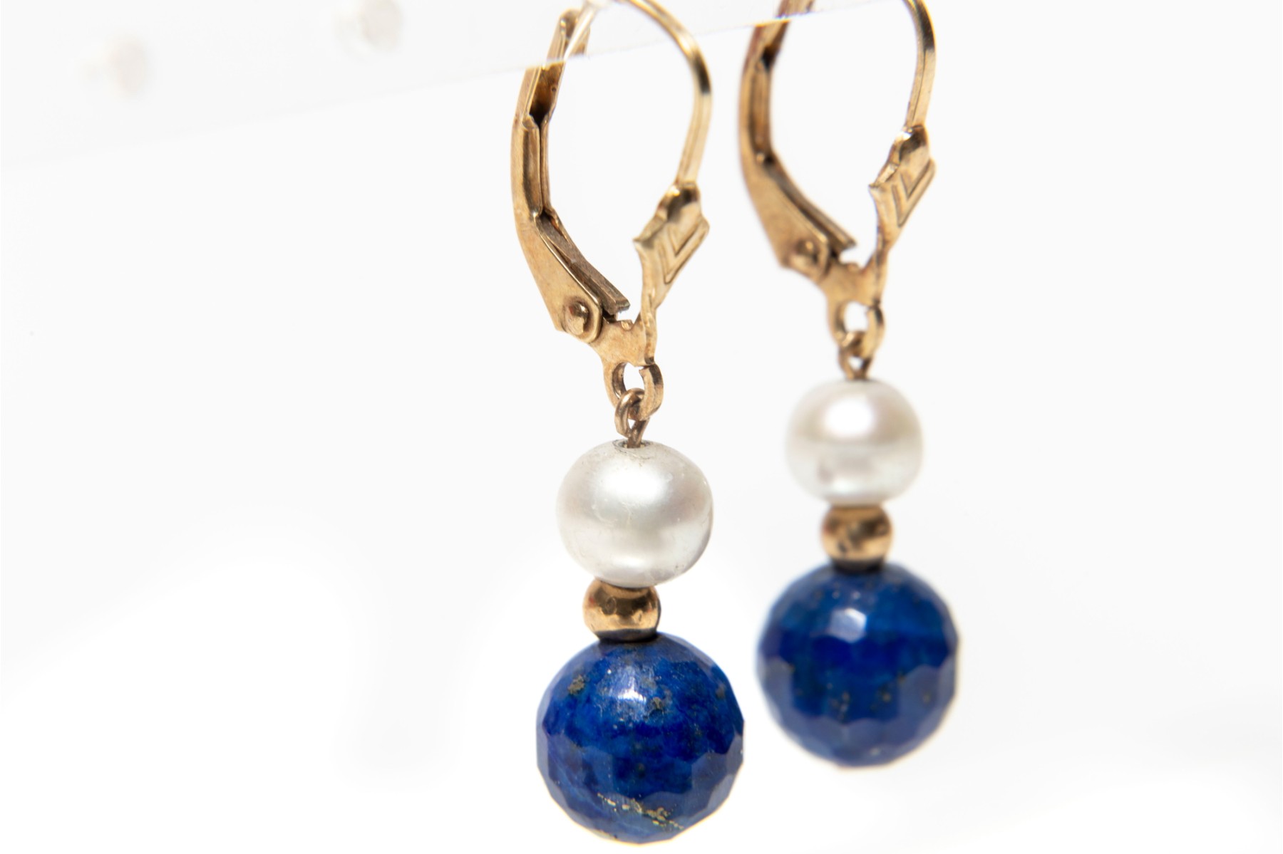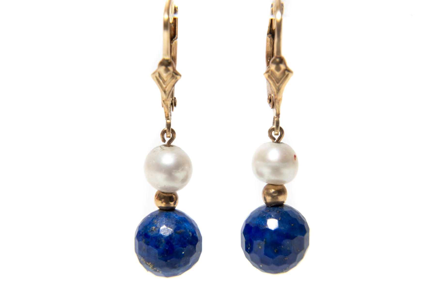14k yellow gold handsome cultured freshwater pearl and faceted lapis drop earrings, finished with a wire top and lever style backs